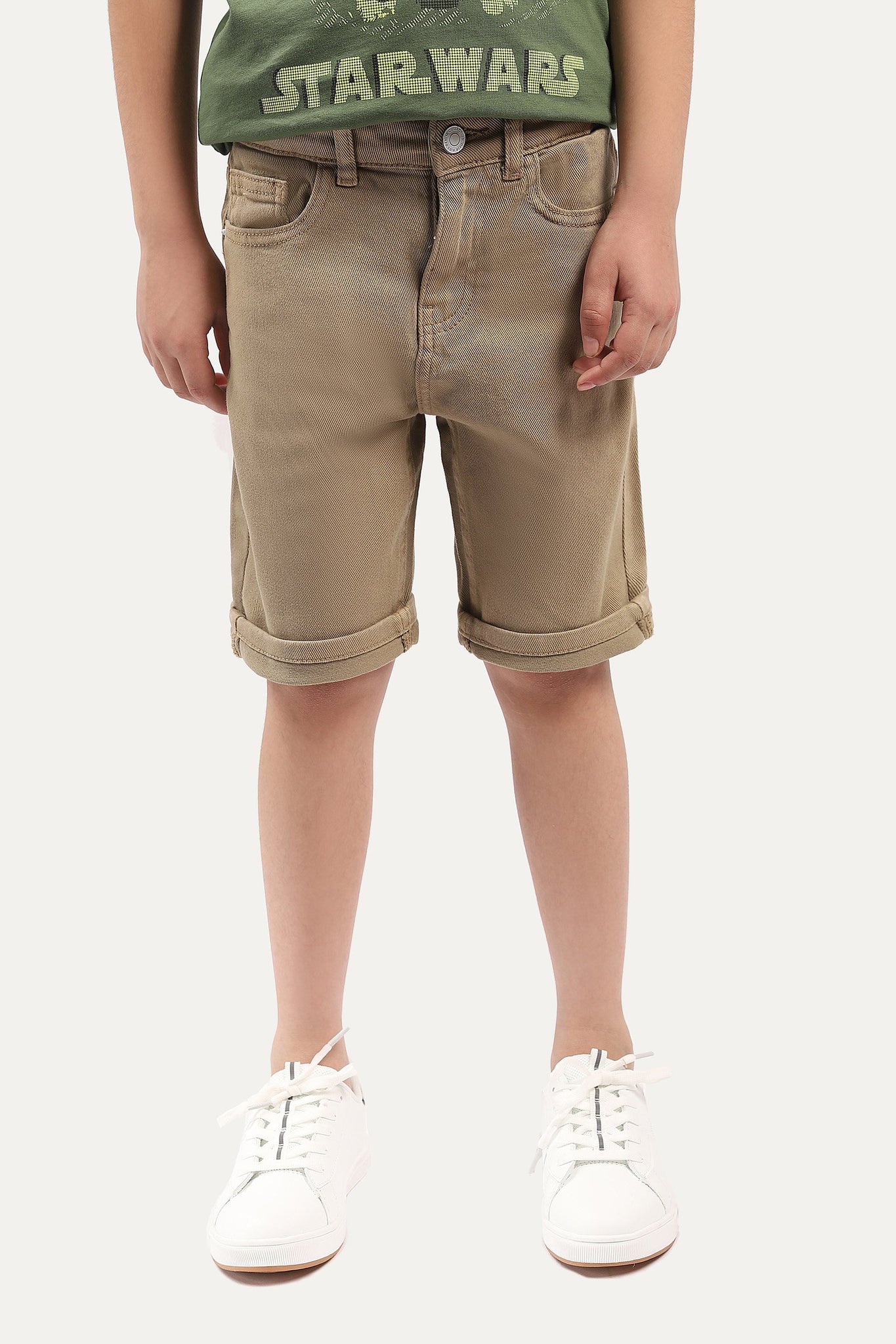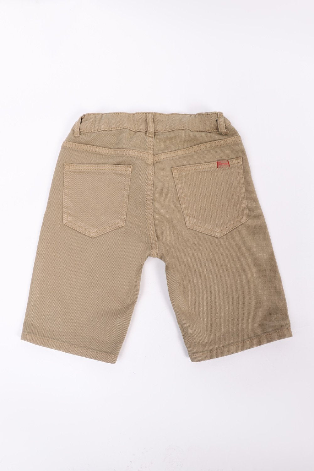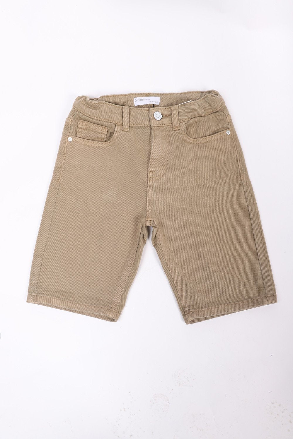 5-pocket denim shorts in slightly stretchable fabric, metallic buttons and sewn cuffs at hem