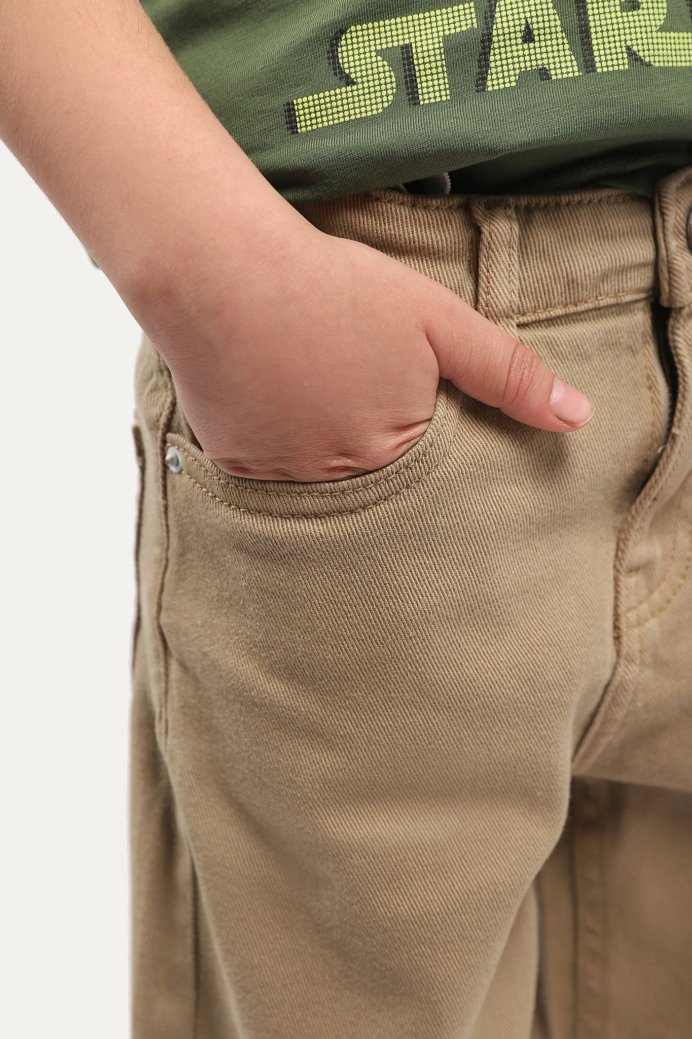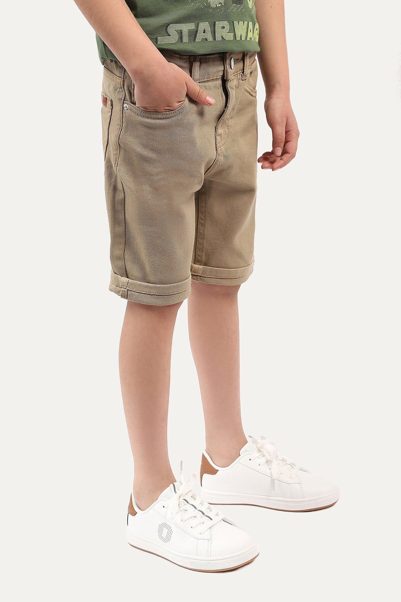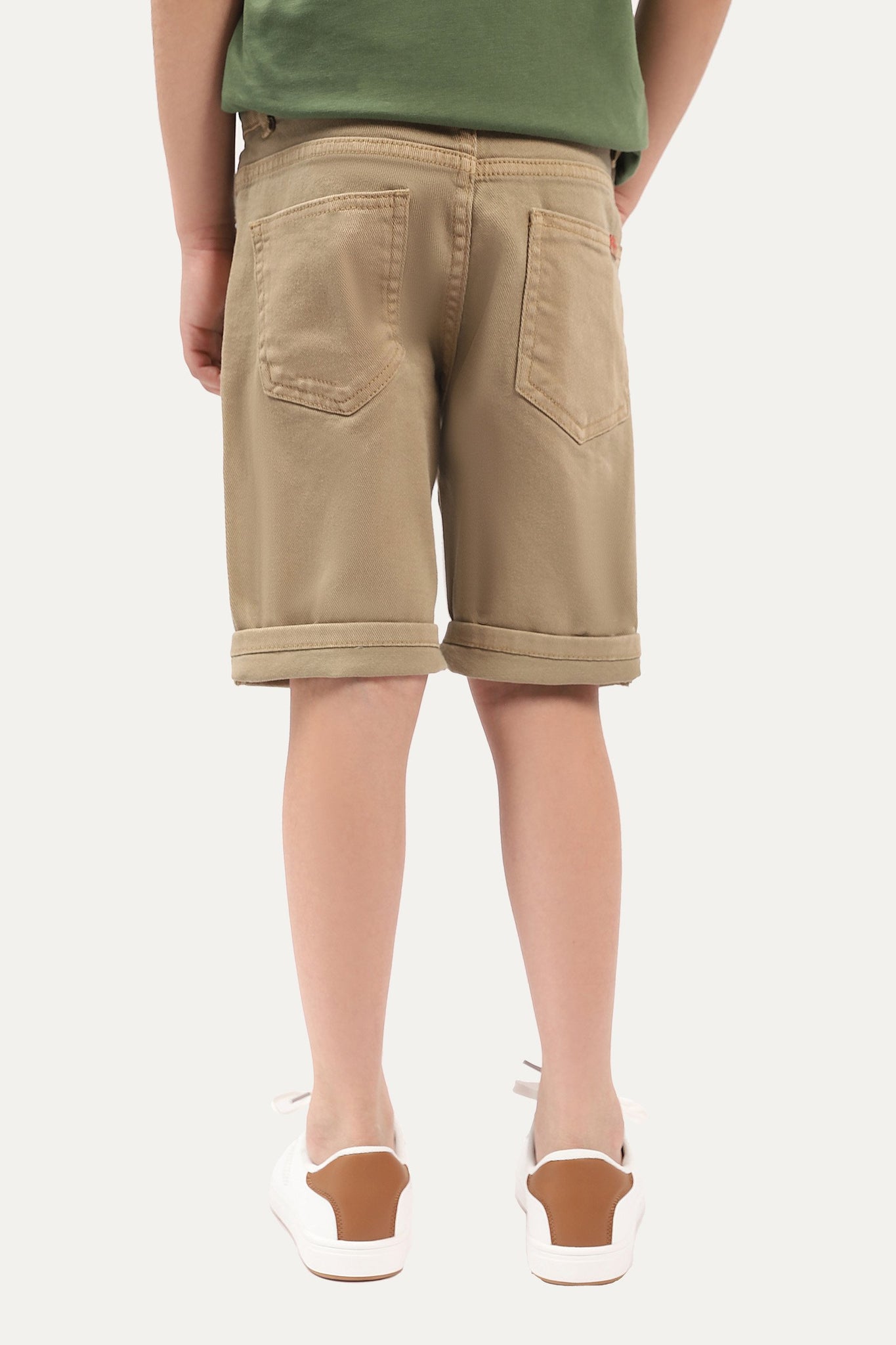 5-pocket denim shorts in slightly stretchable fabric, metallic buttons and sewn cuffs at hem