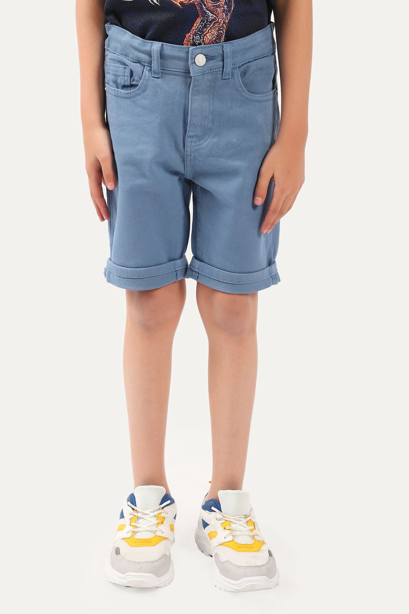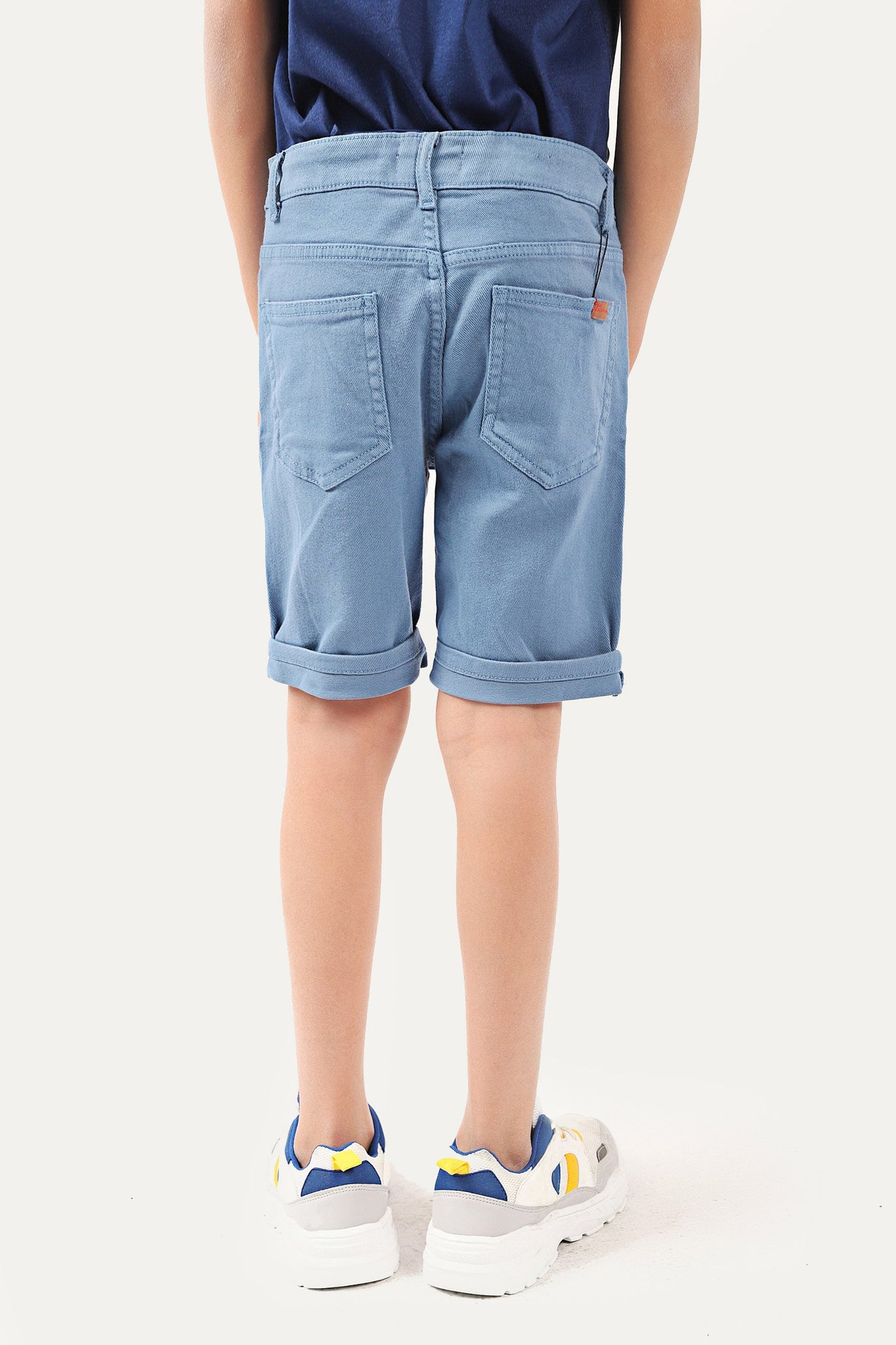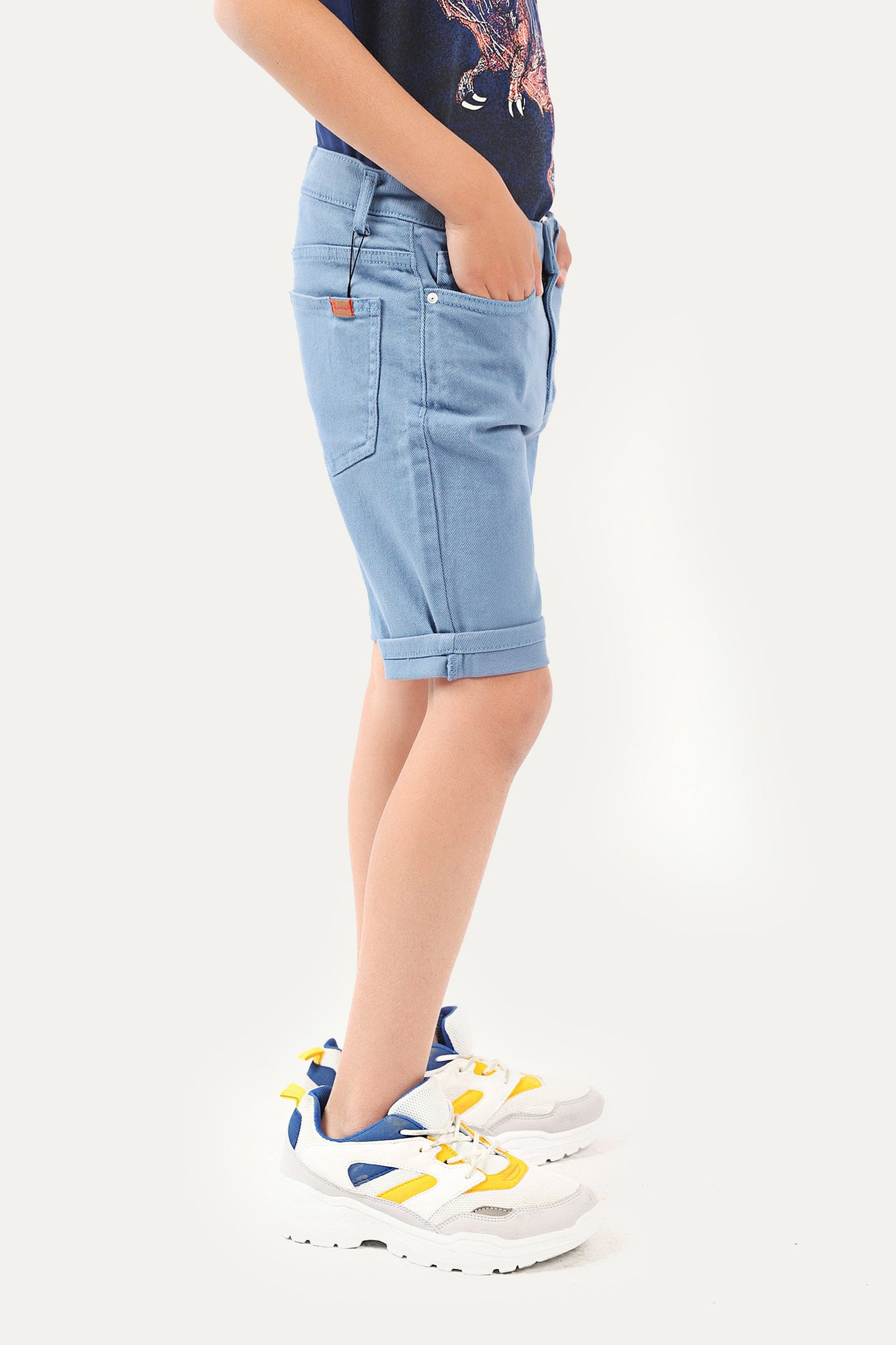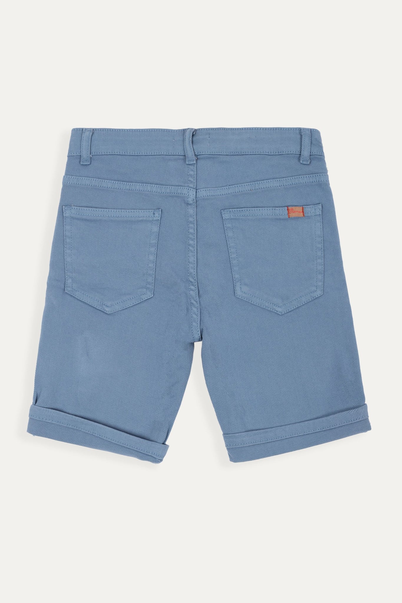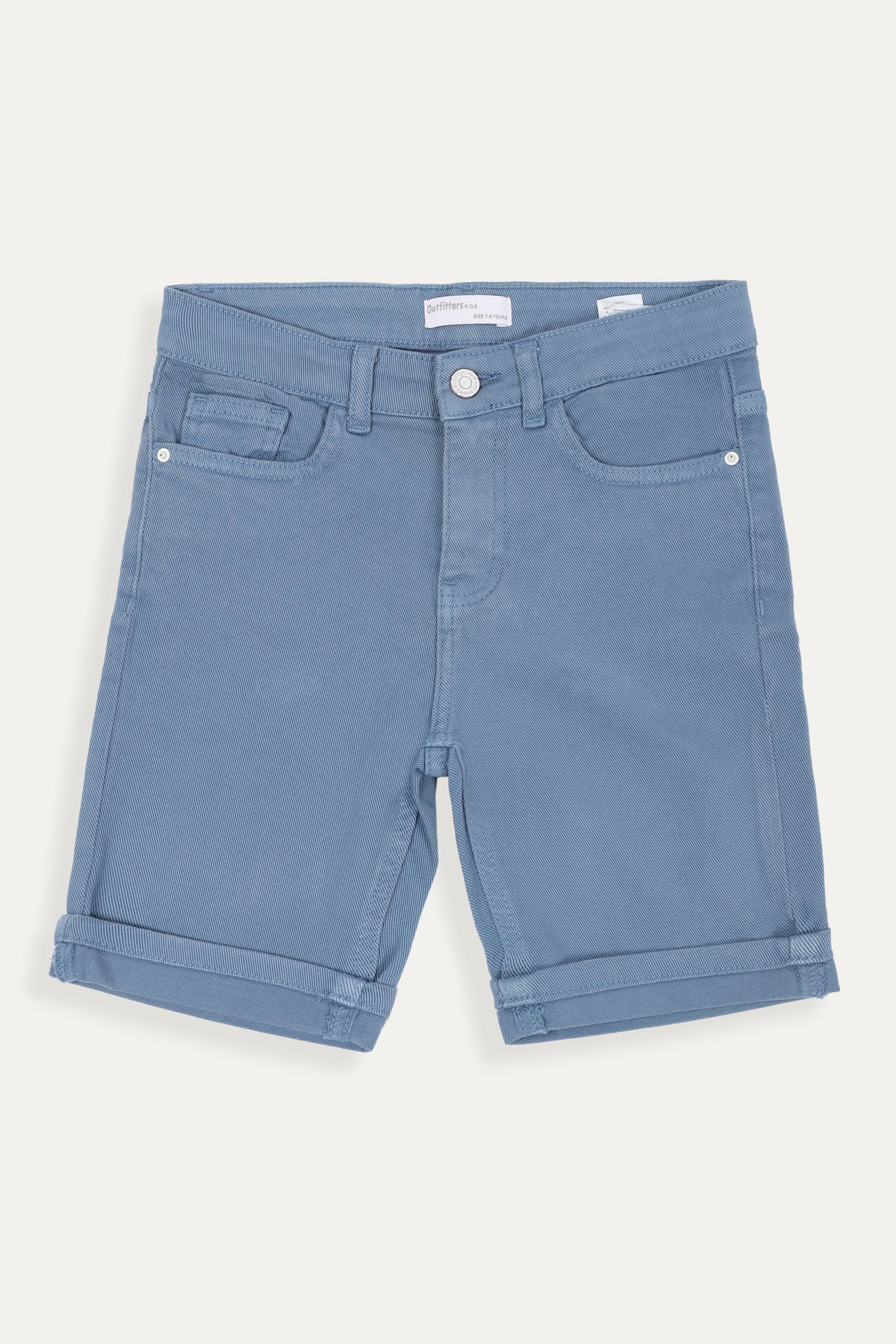 5-pocket denim shorts in slightly stretchable fabric, metallic buttons and sewn cuffs at hem