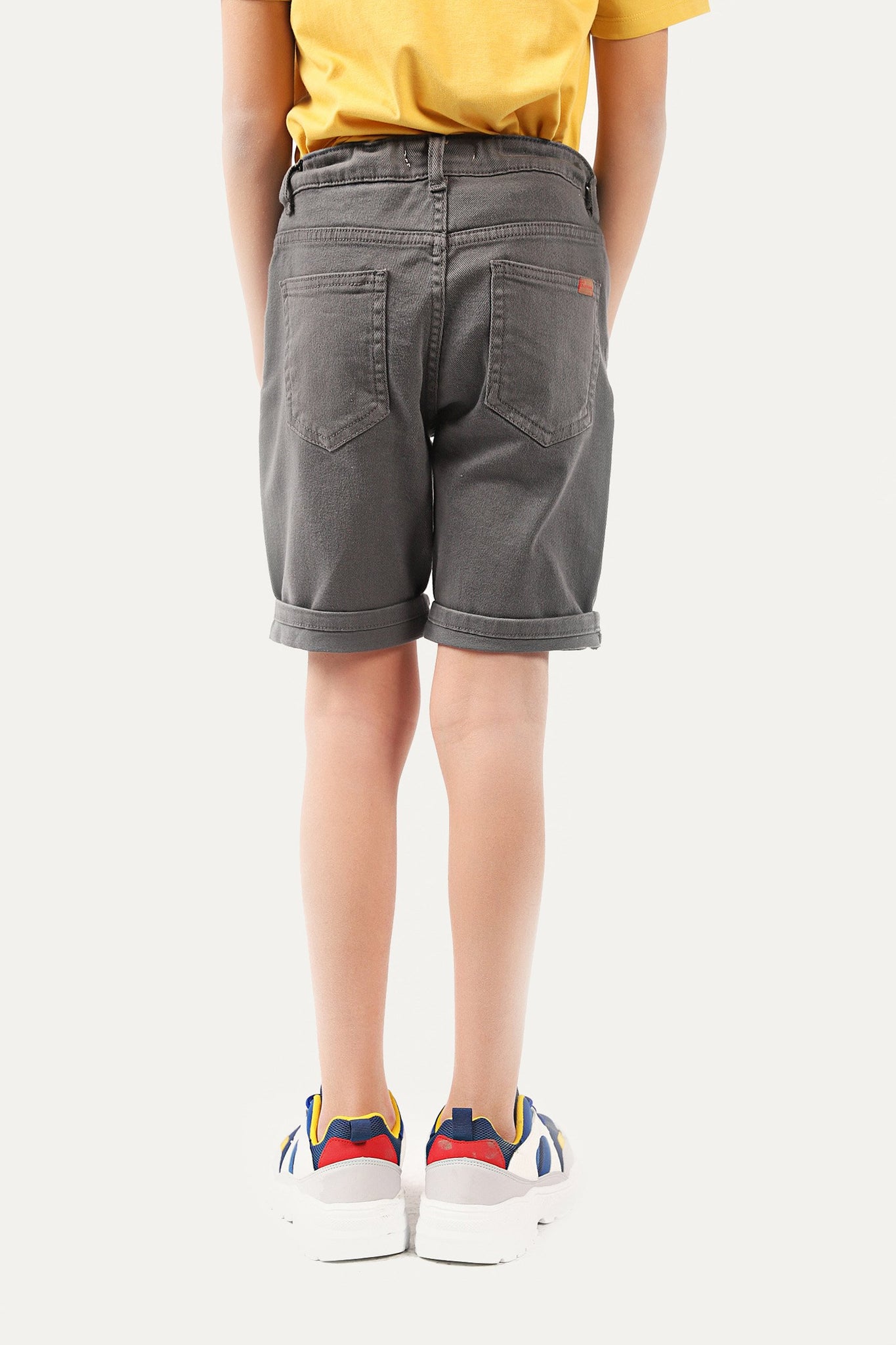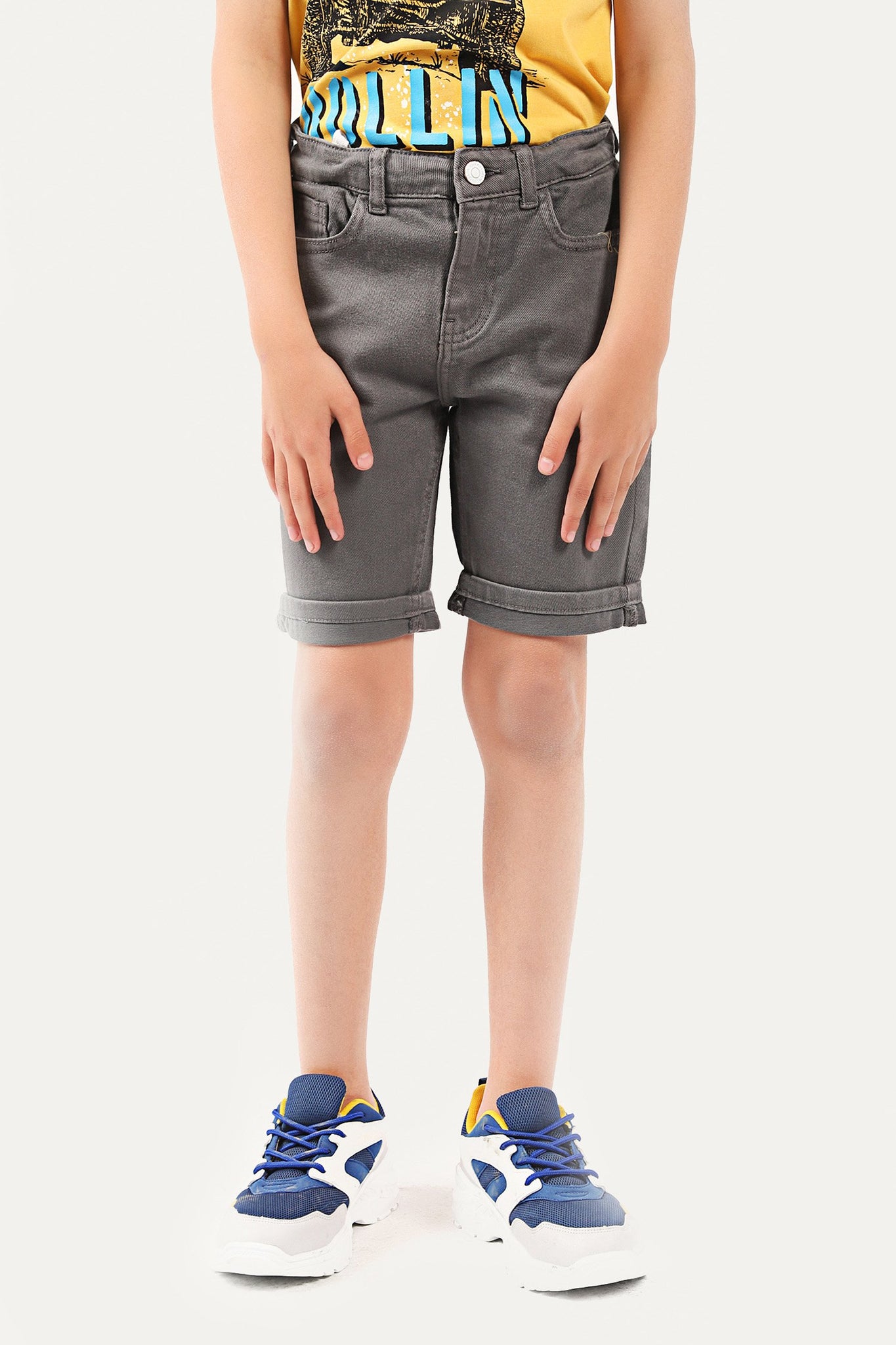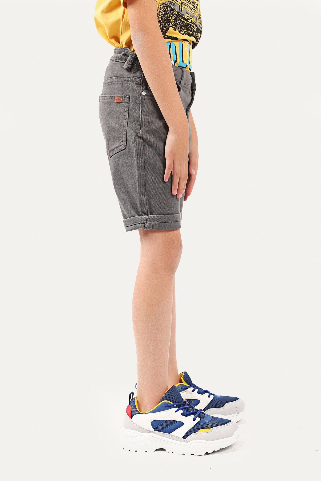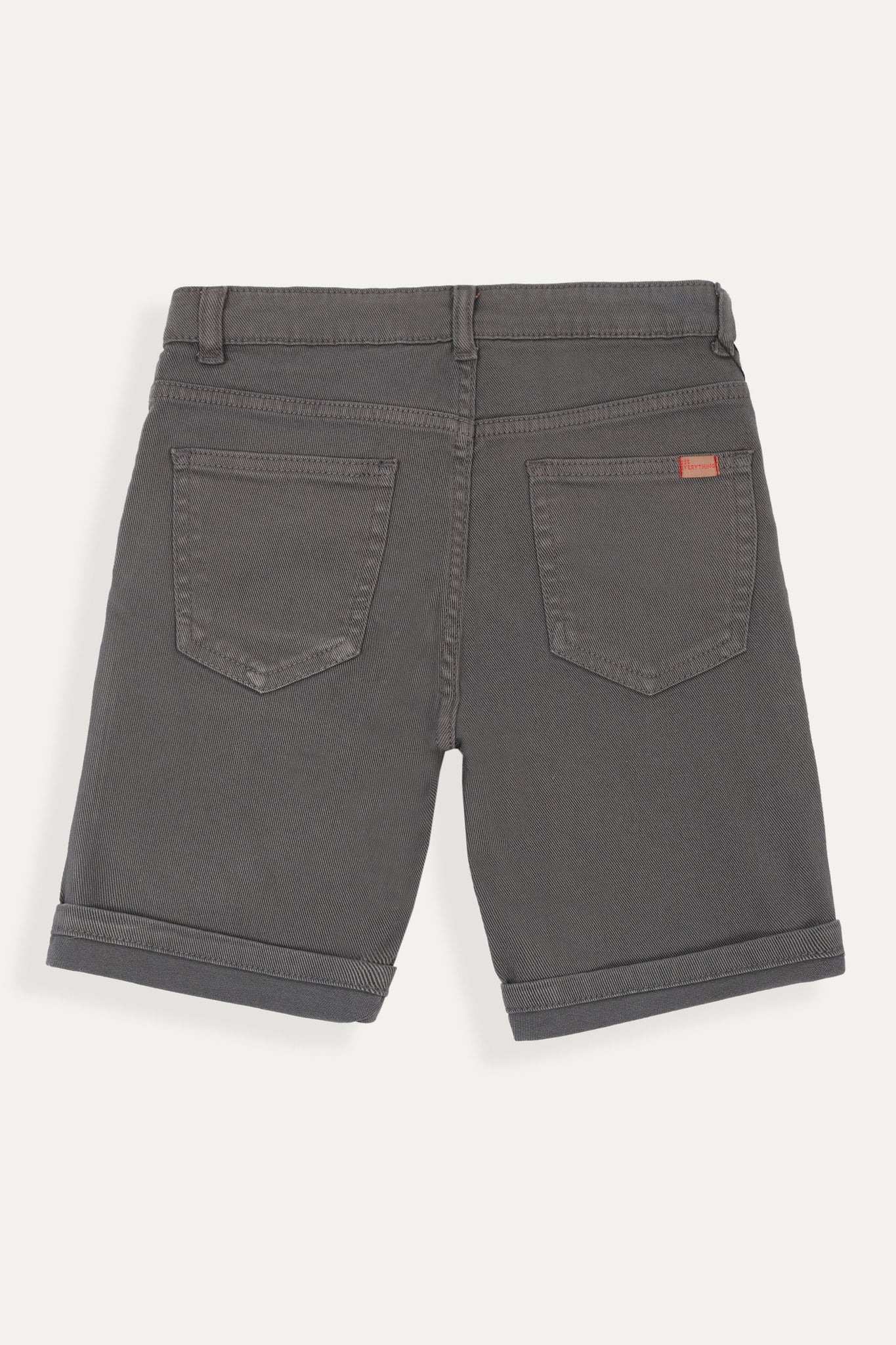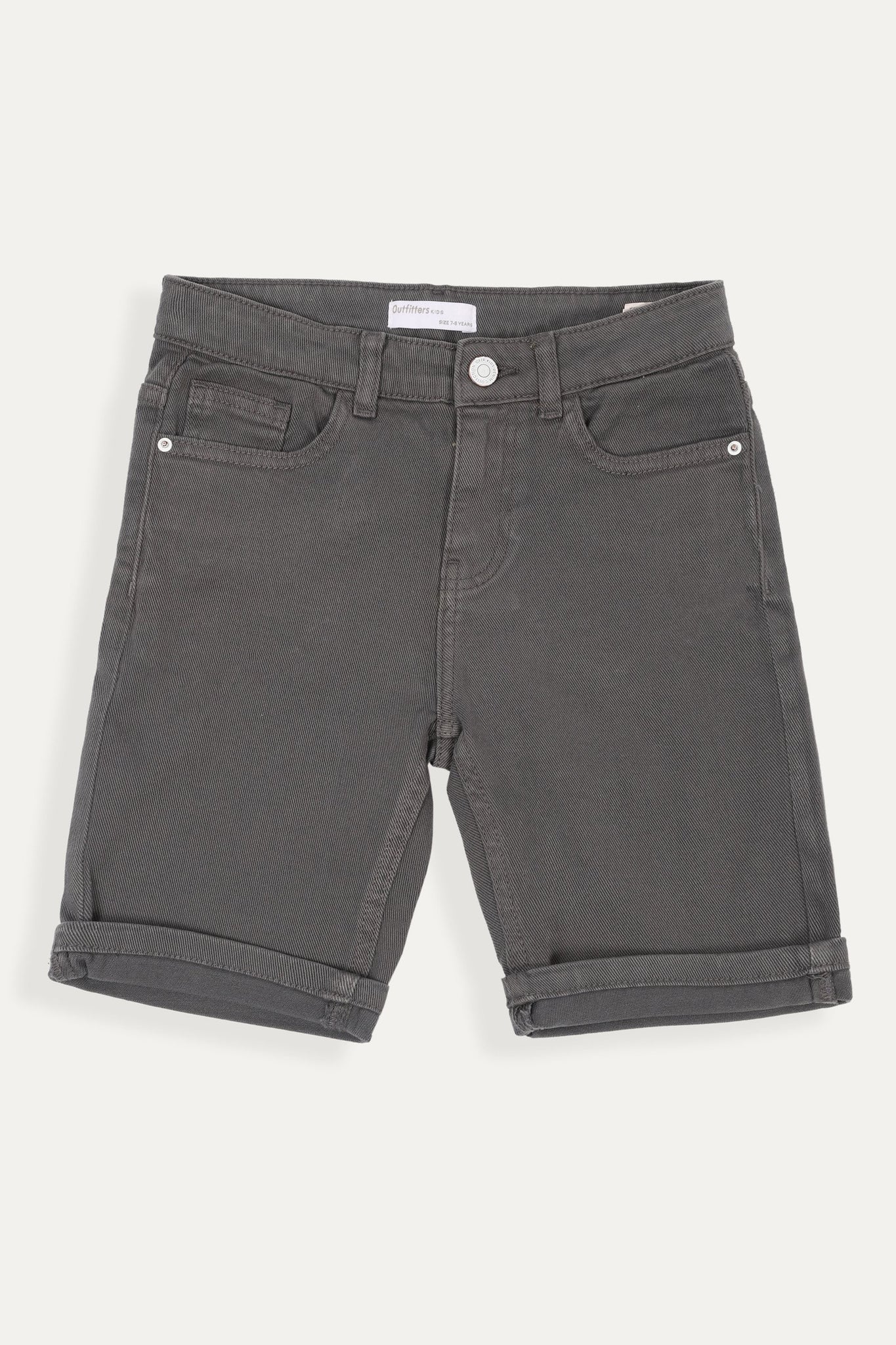 5-pocket denim shorts in slightly stretchable fabric, metallic buttons and sewn cuffs at hem