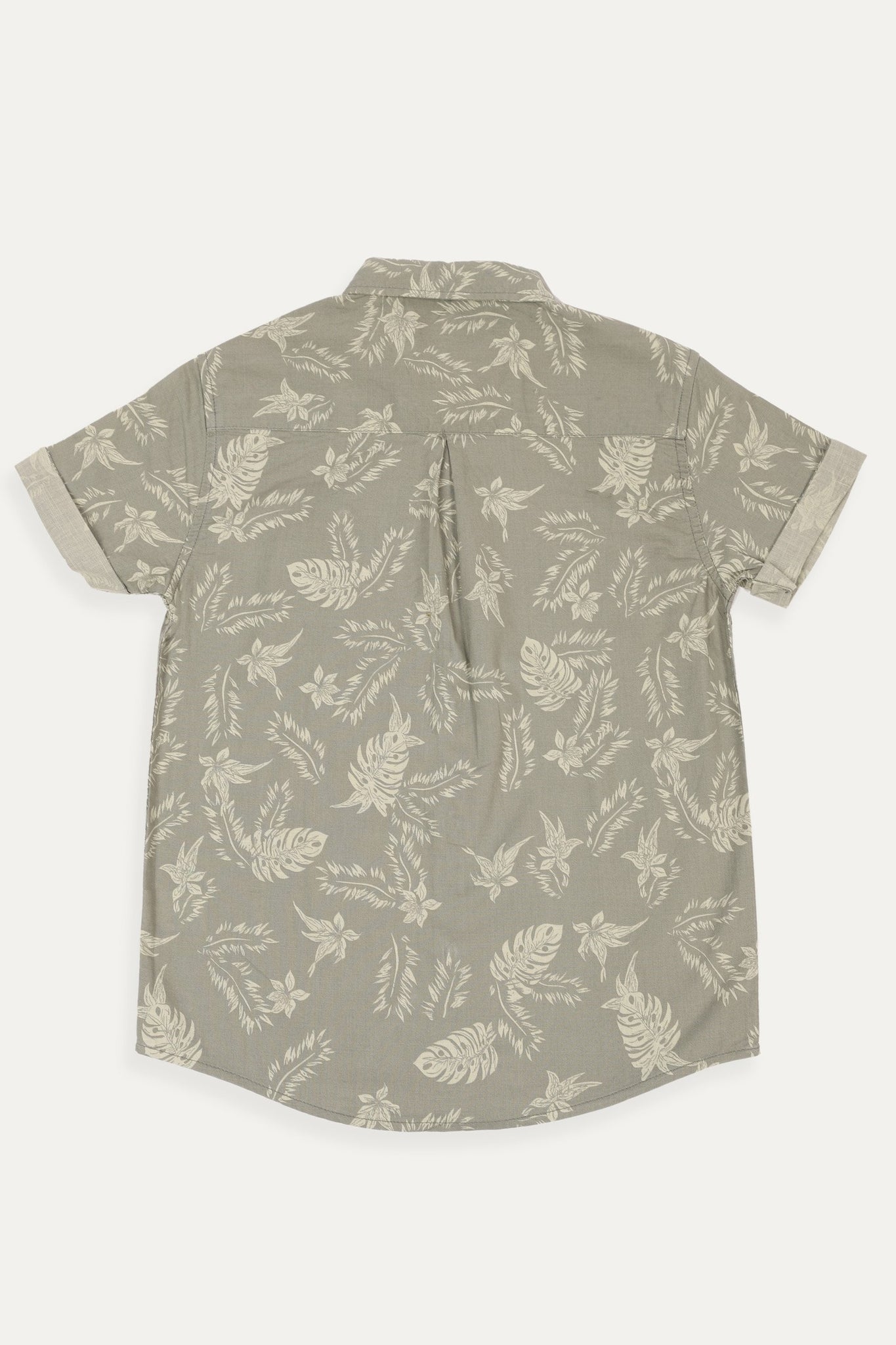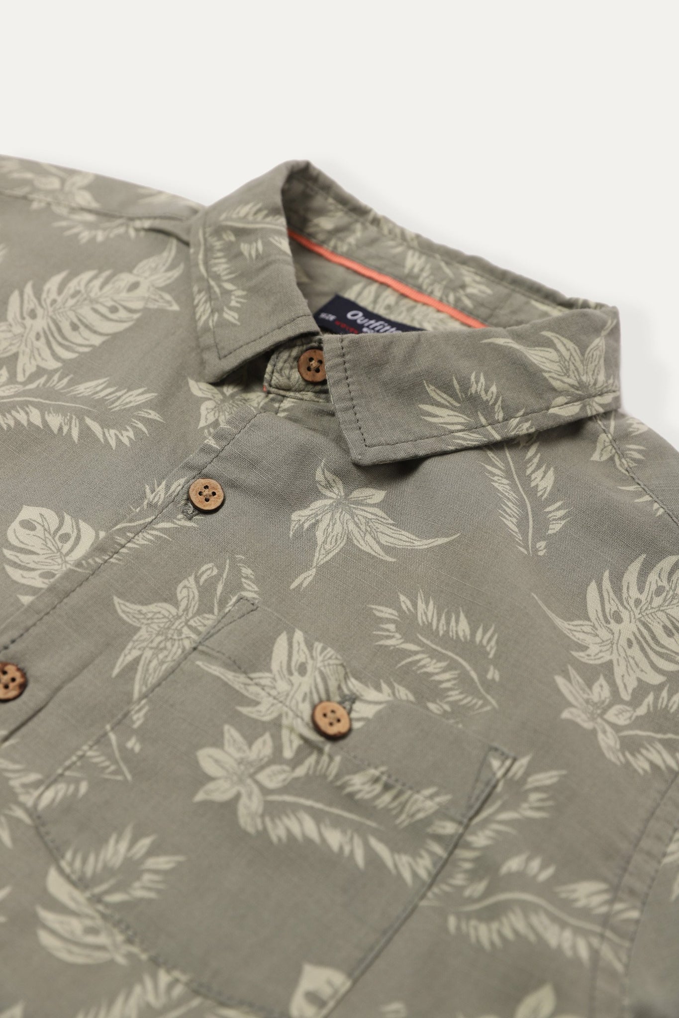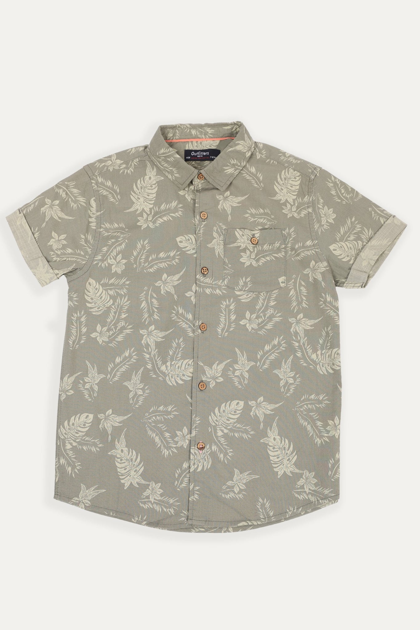 Classic collar shirt with tropical design, wooden button down front, chest pocket and half sleeves with folded cuffs