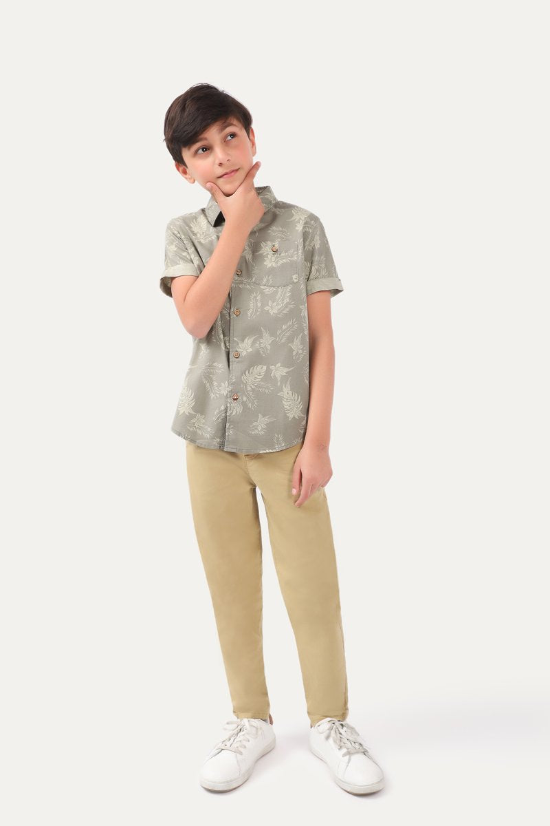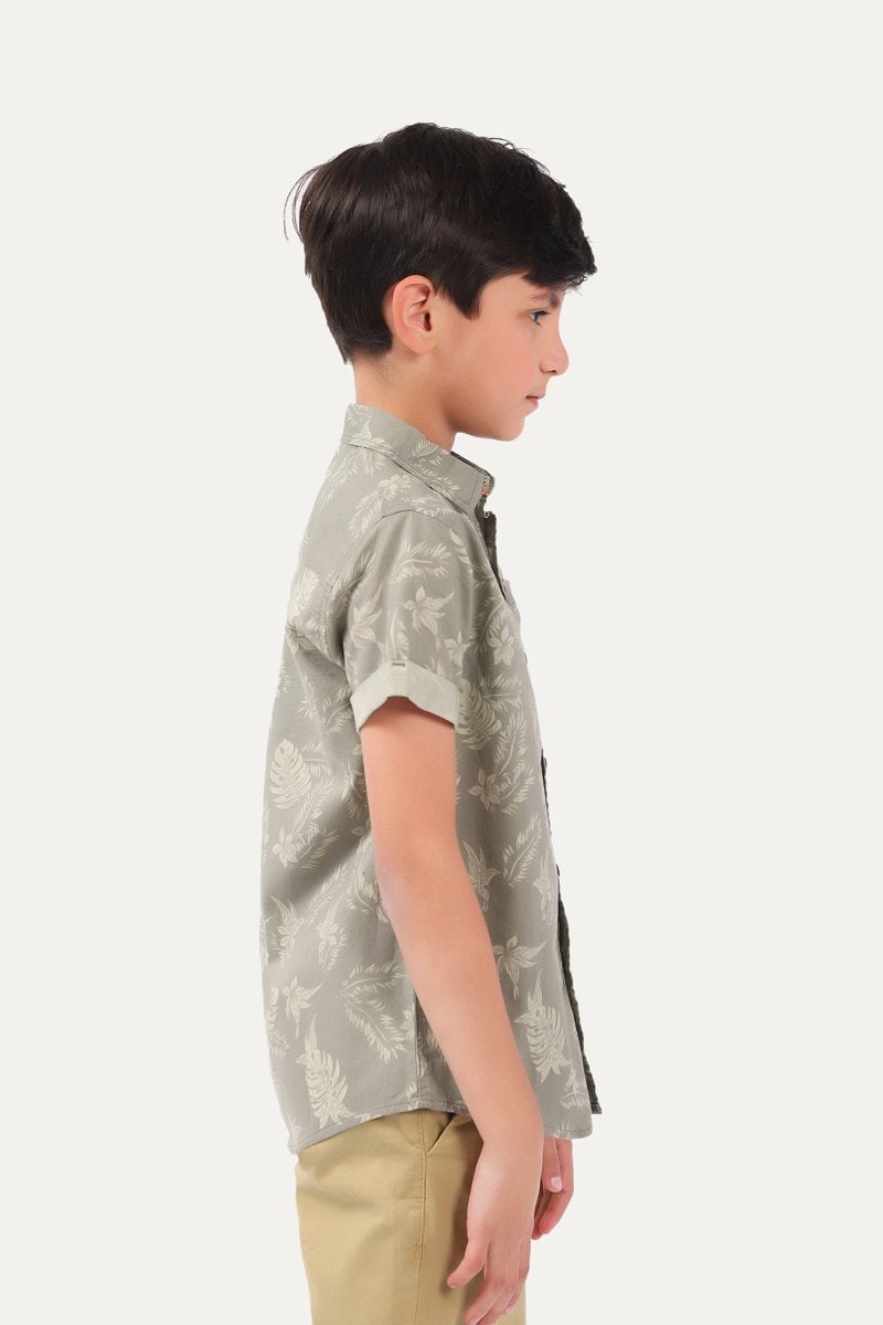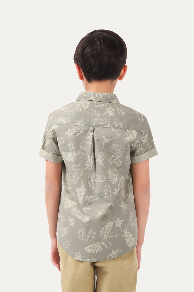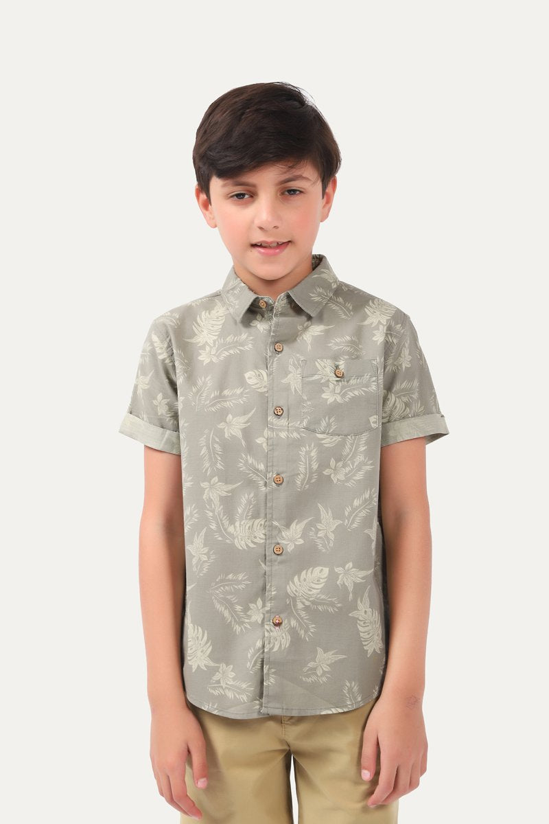 Classic collar shirt with tropical design, wooden button down front, chest pocket and half sleeves with folded cuffs