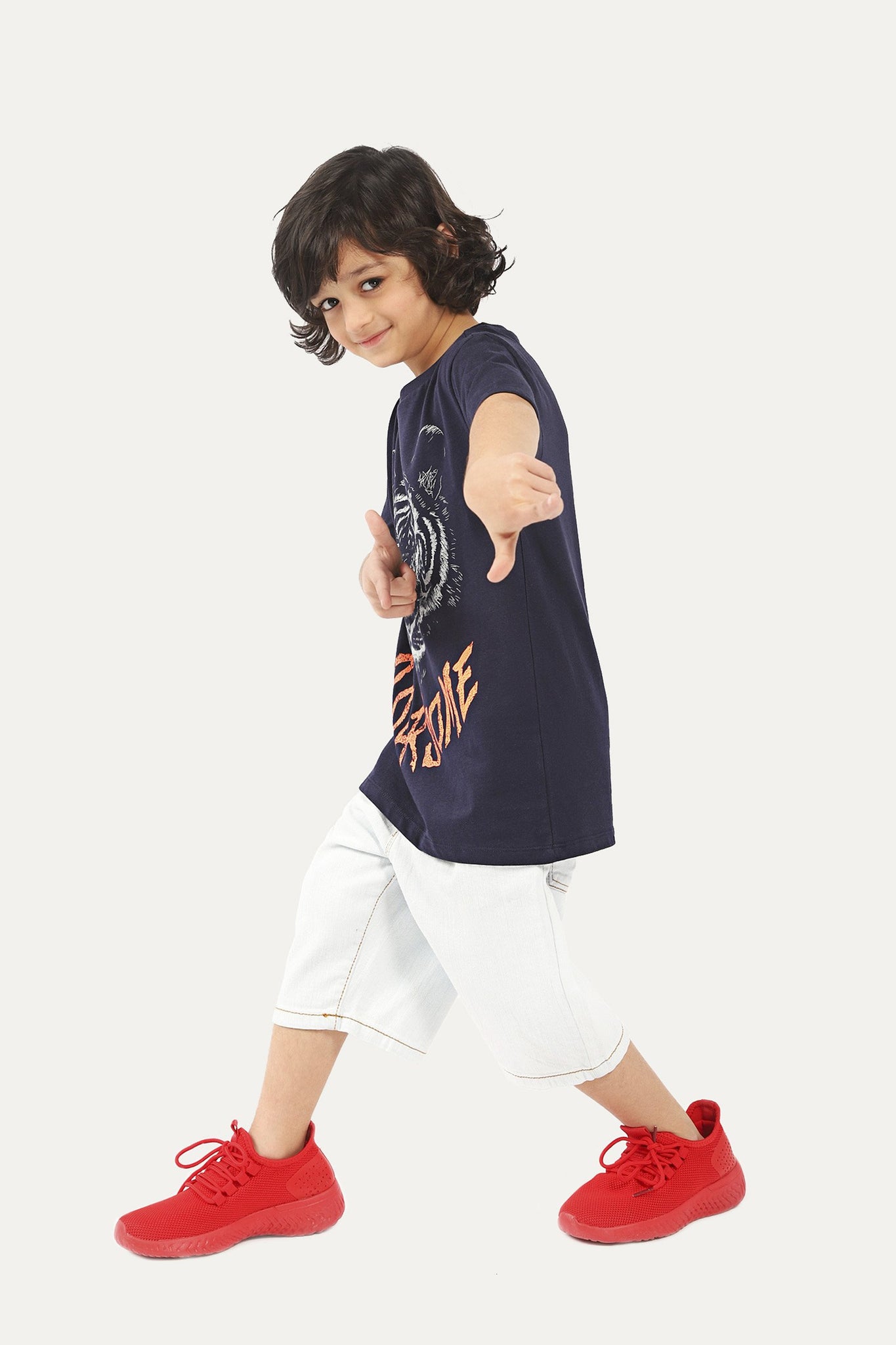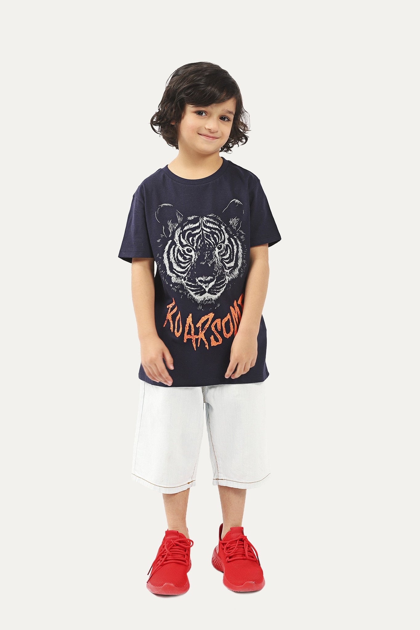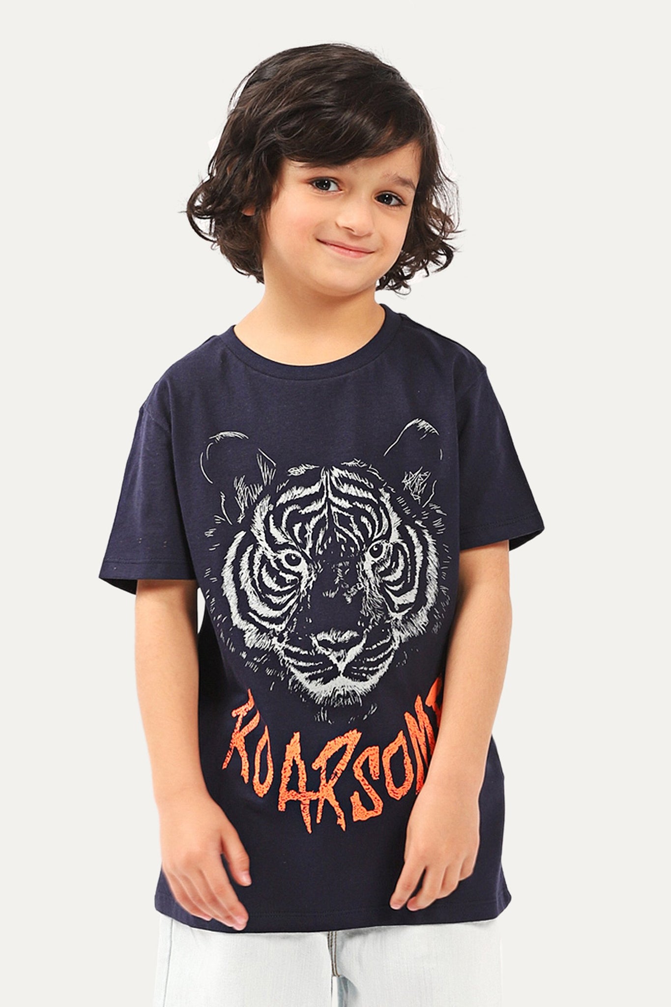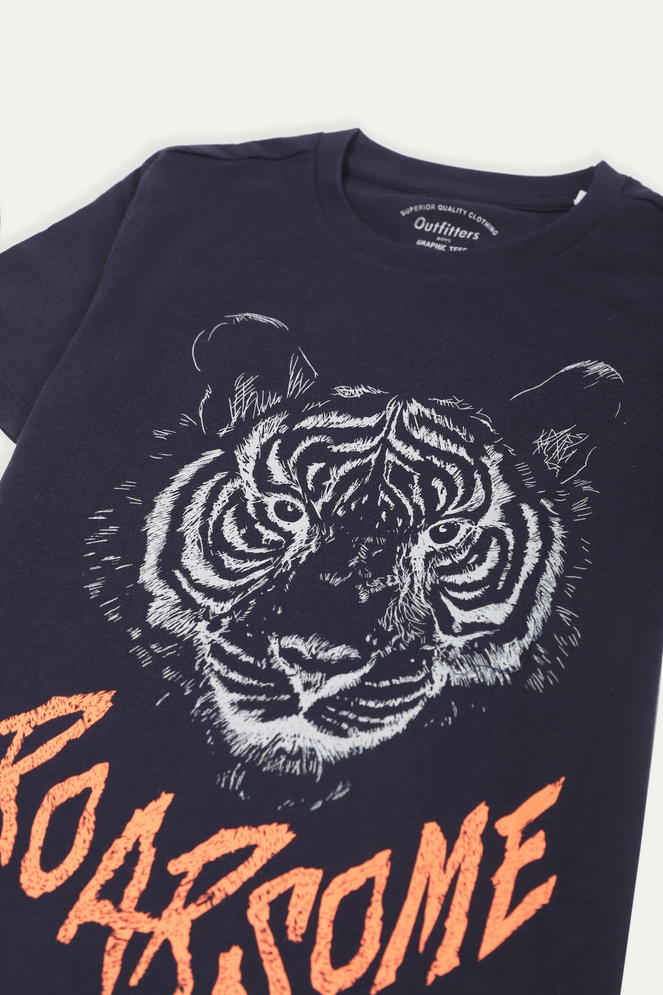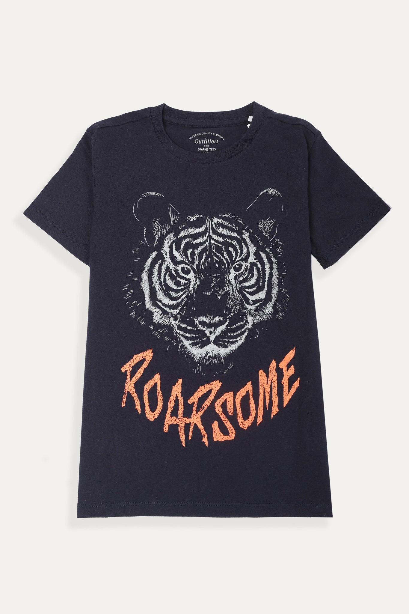 Graphic t-shirt with a round neck, half sleeves and tiger print with a slogan on front