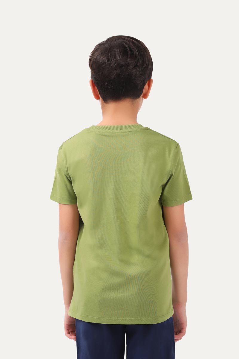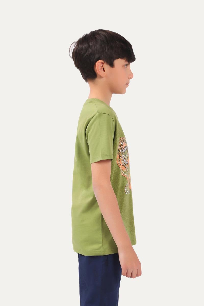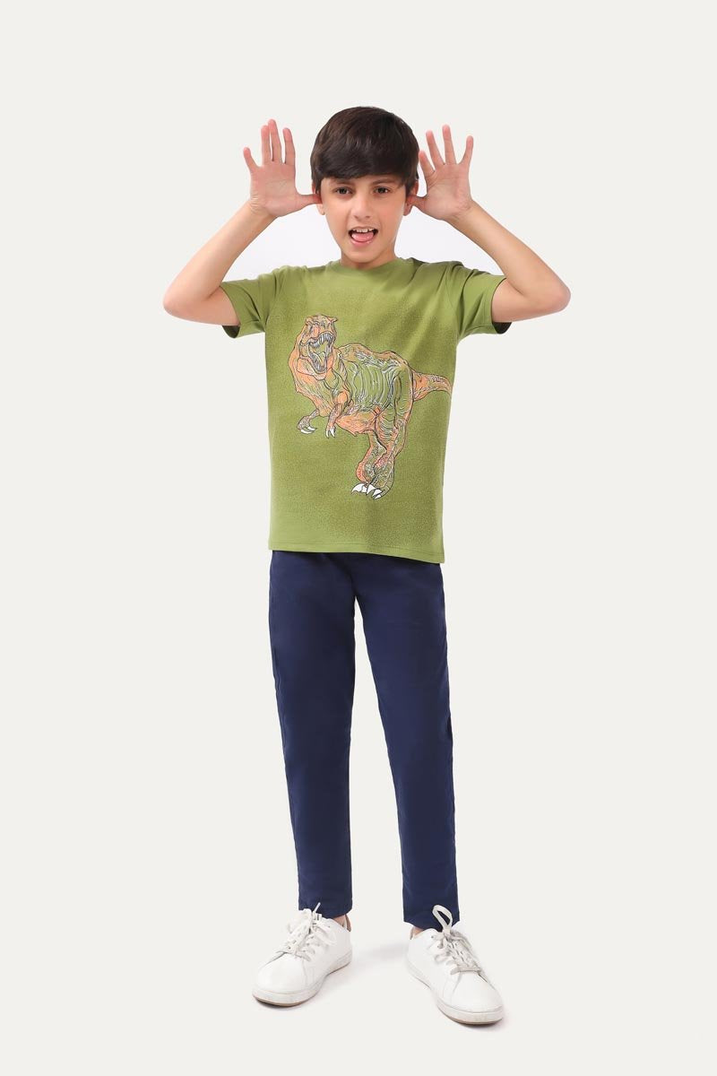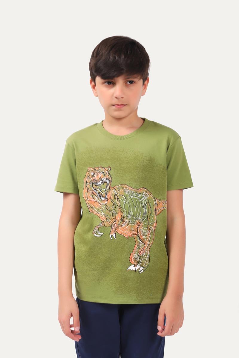 Round neck t-shirt with half sleeves and dinosaur graphic printed on it