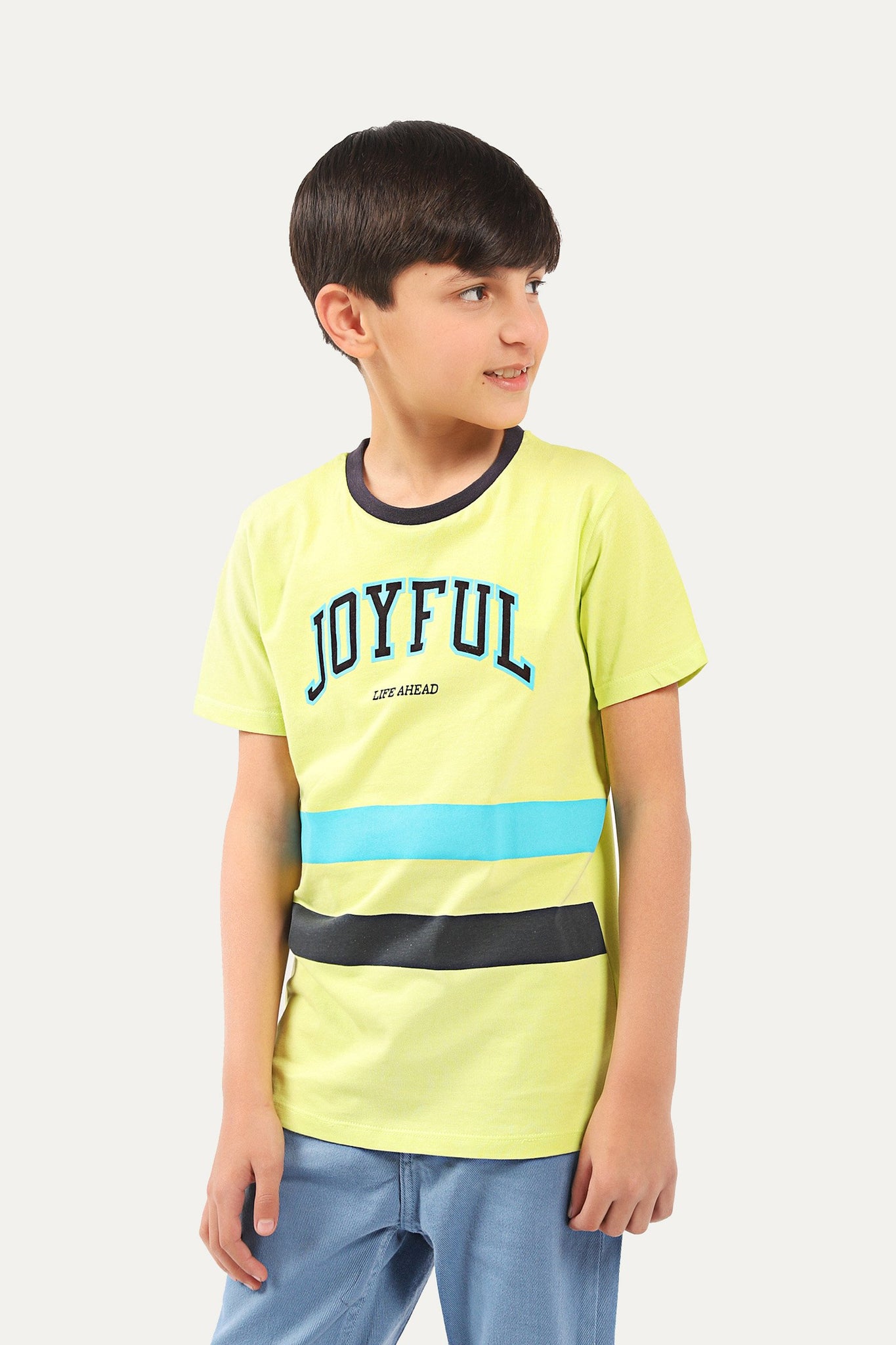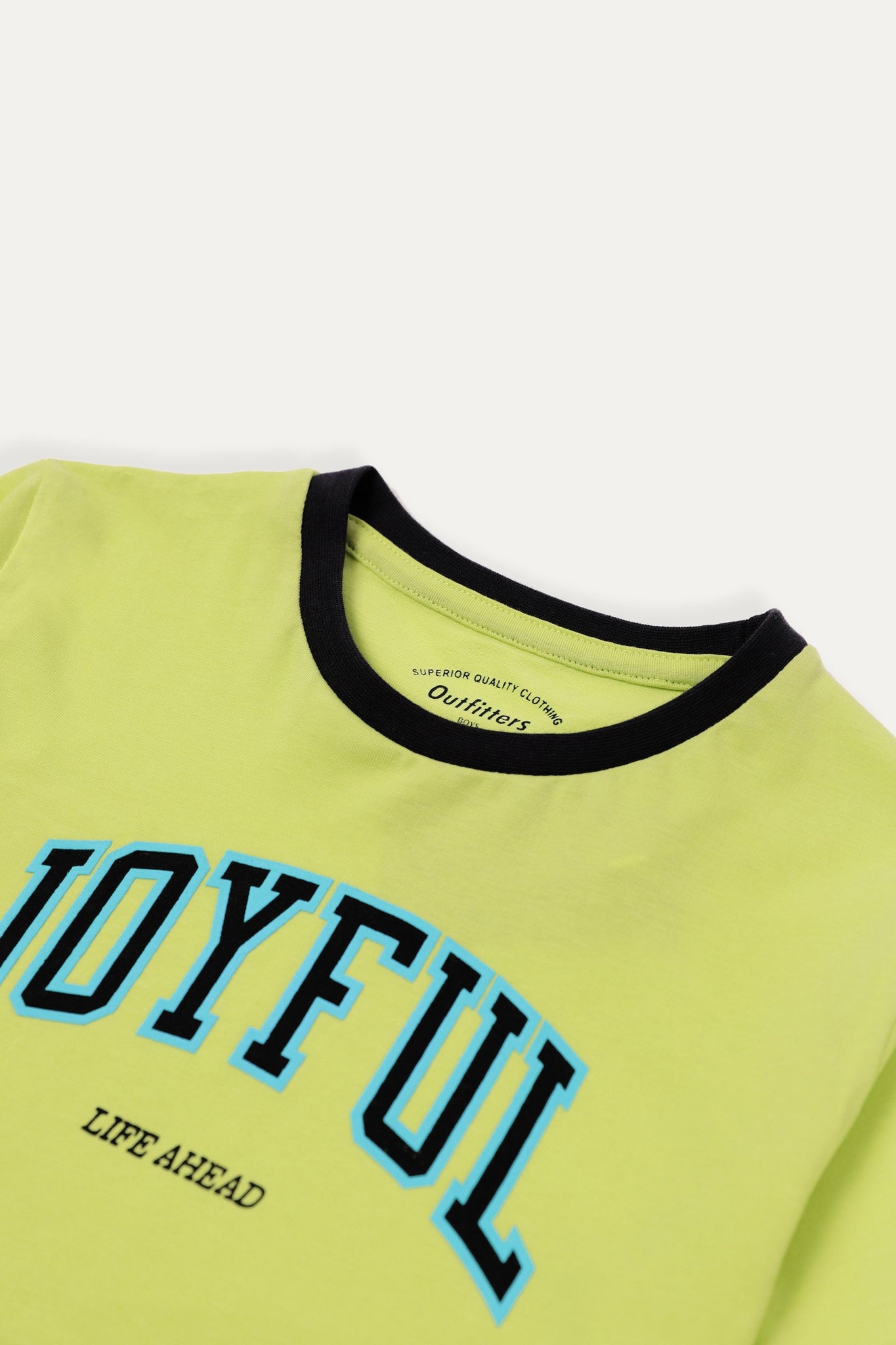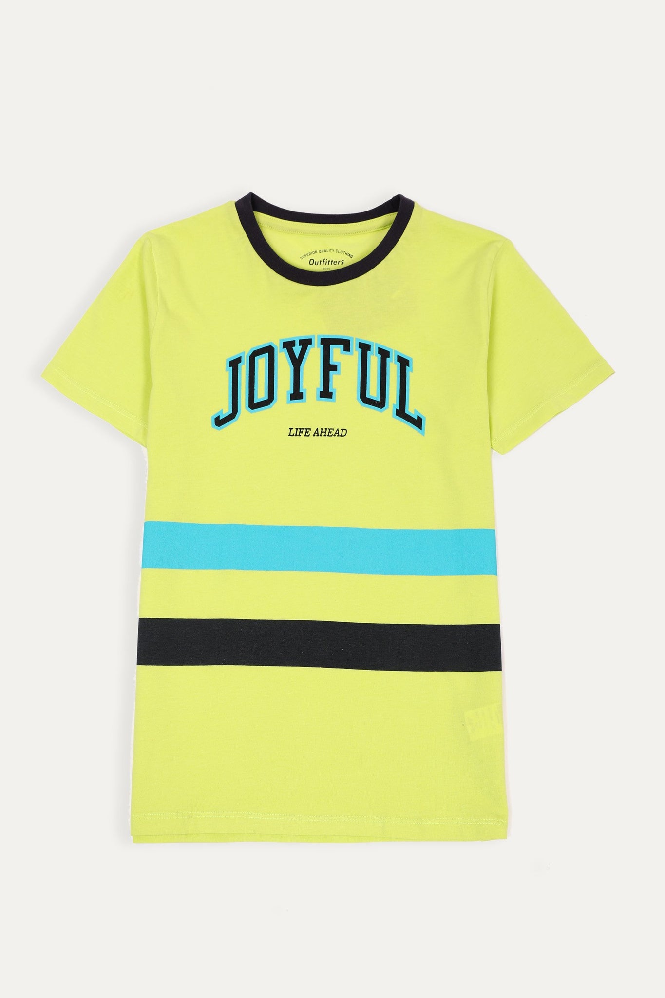 Half sleeve t-shirt featuring round neck with black piping and statement print on front