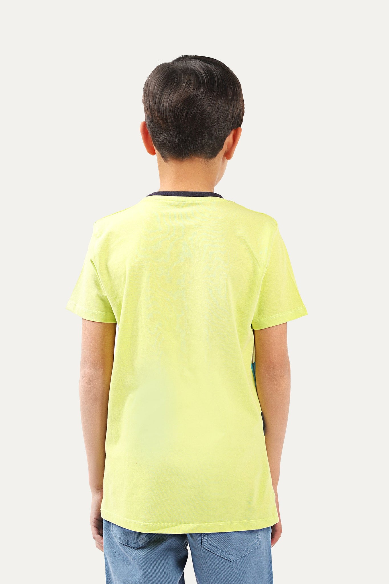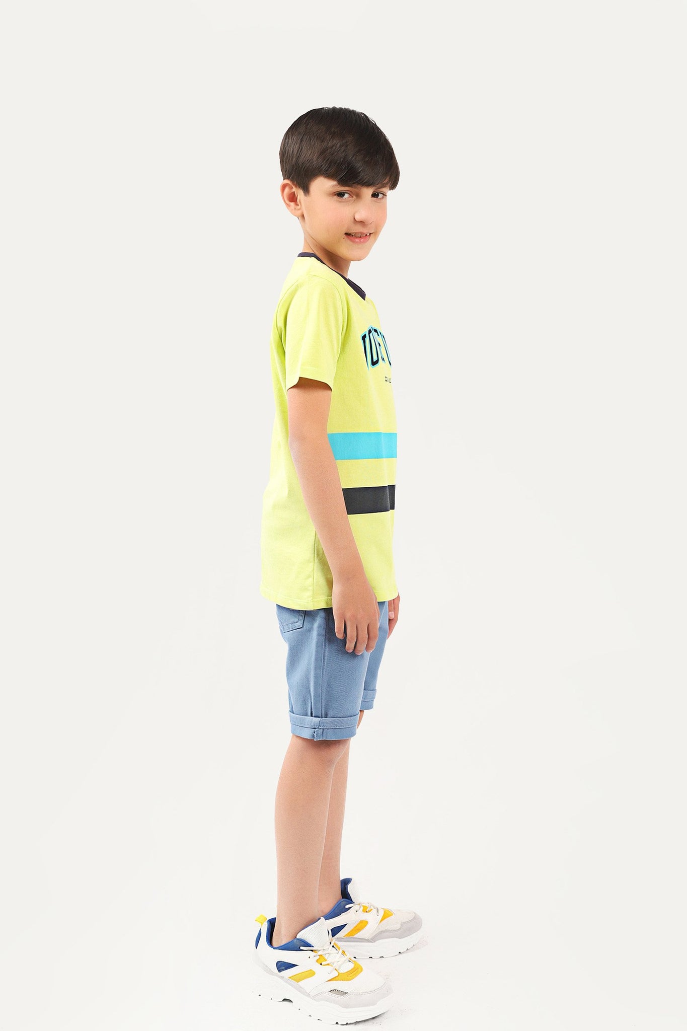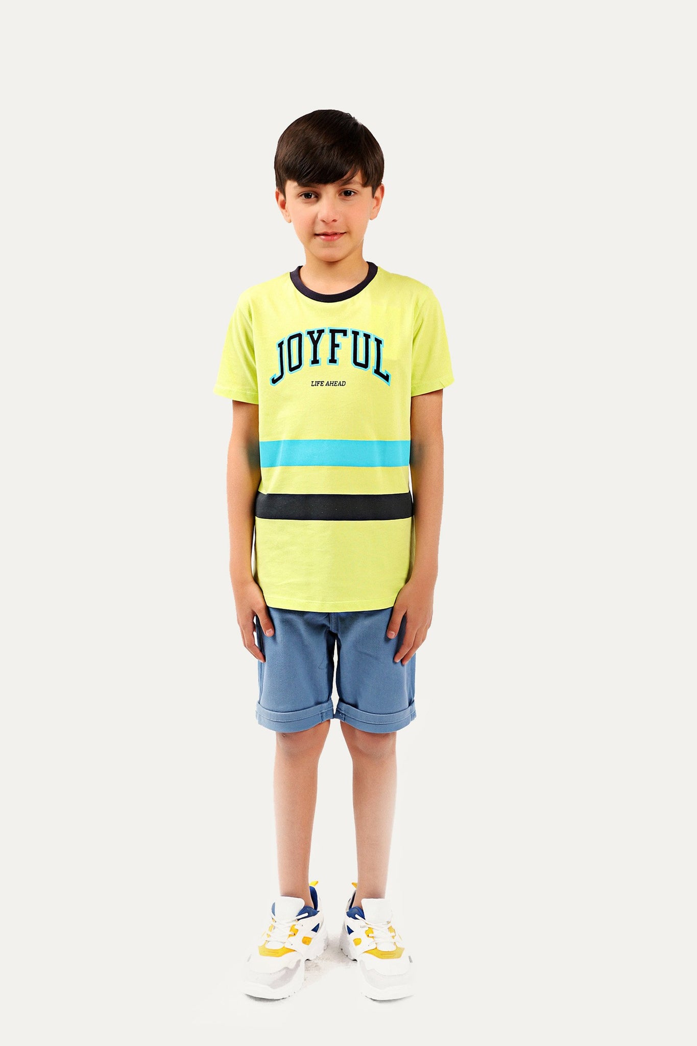 Half sleeve t-shirt featuring round neck with black piping and statement print on front