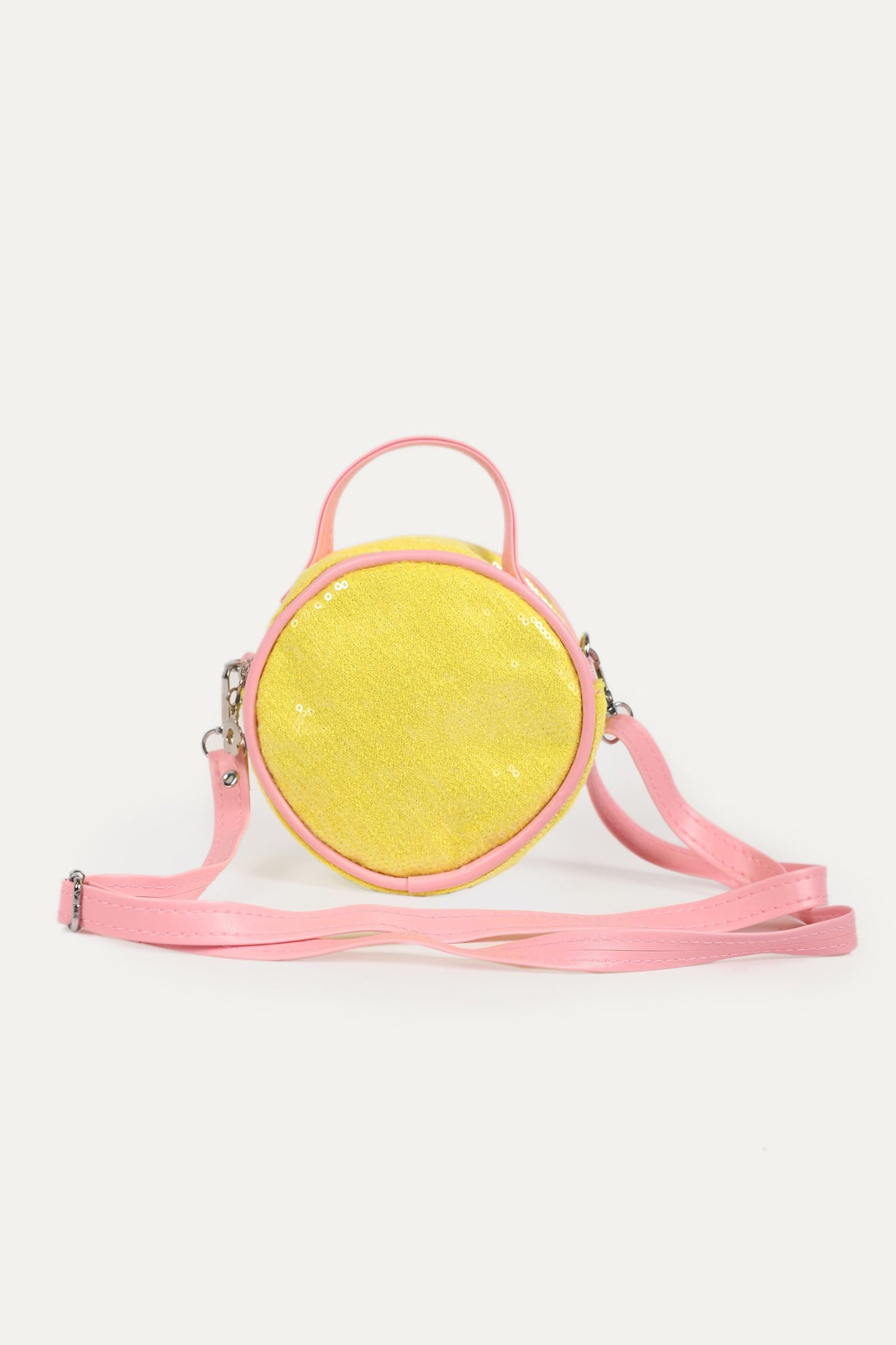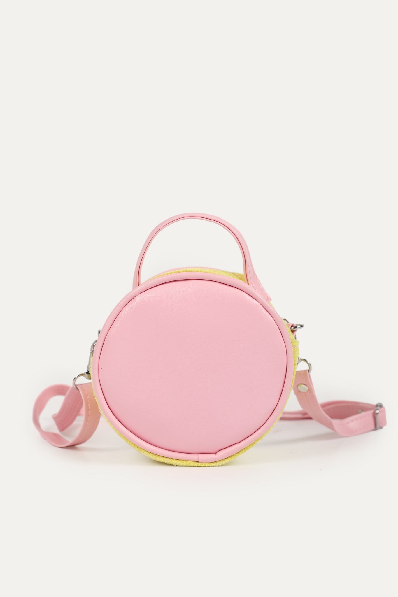 Bag with cross bosy strap, round shaped, zipper detail, glitter front and plain back