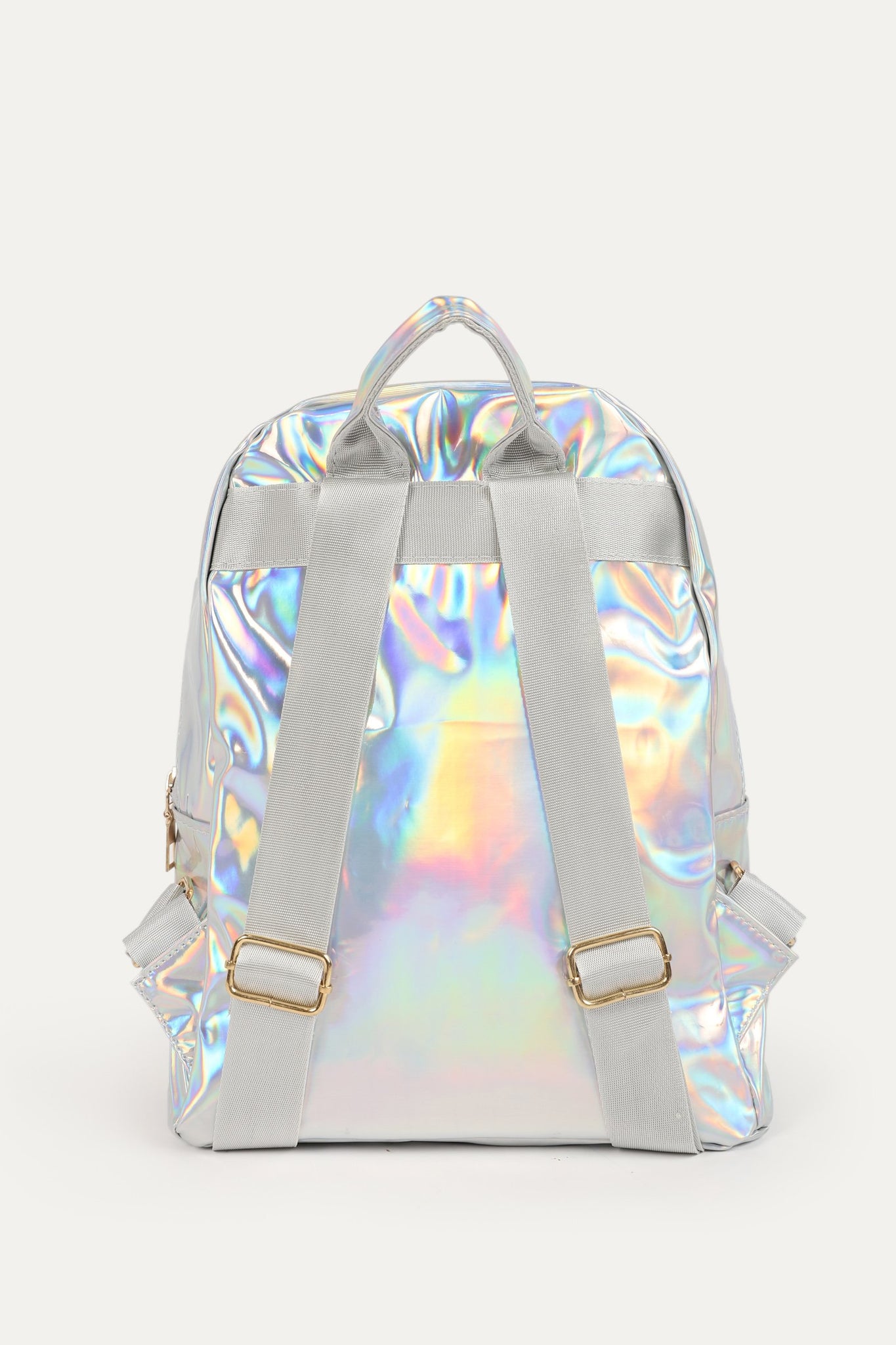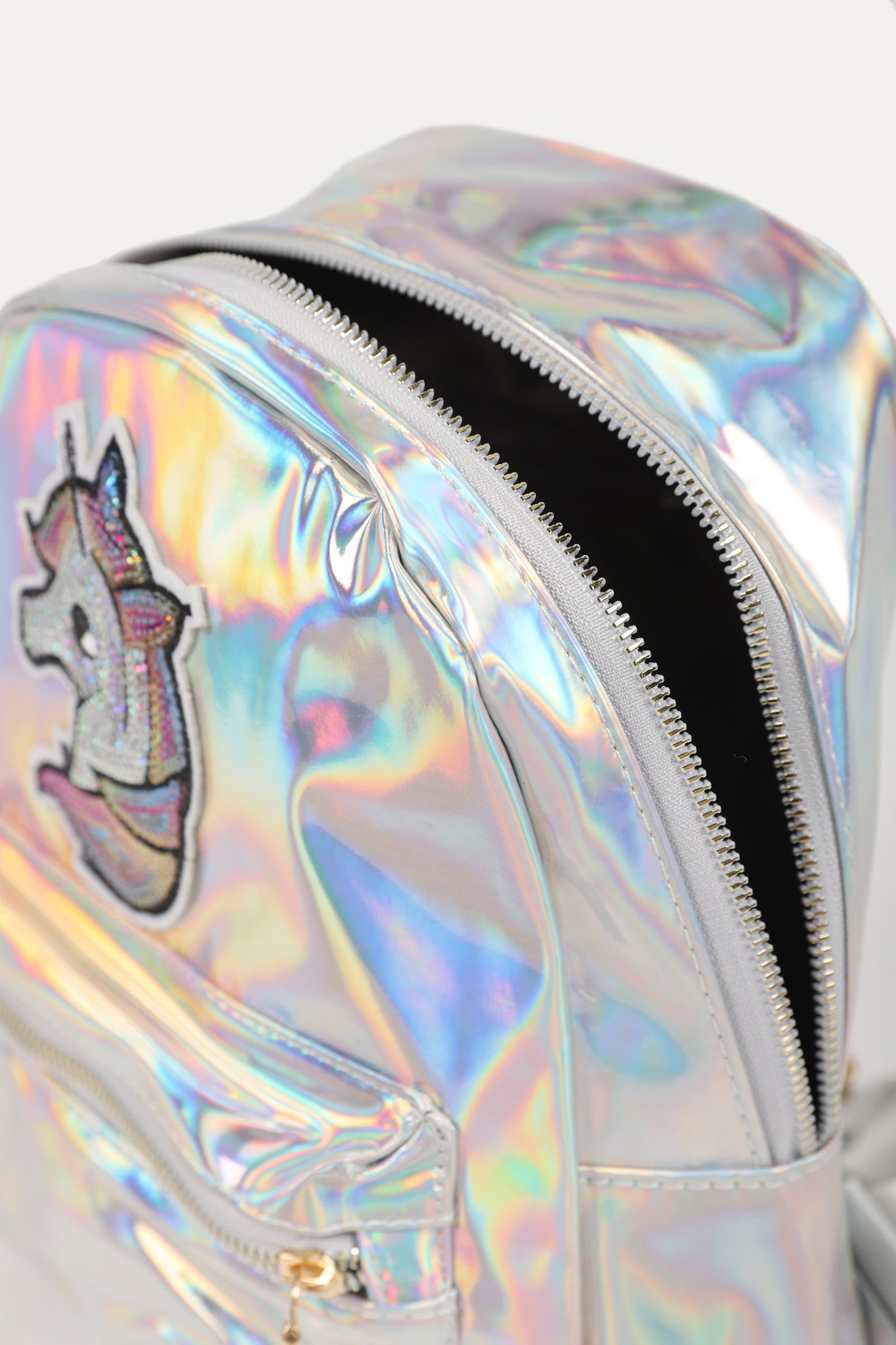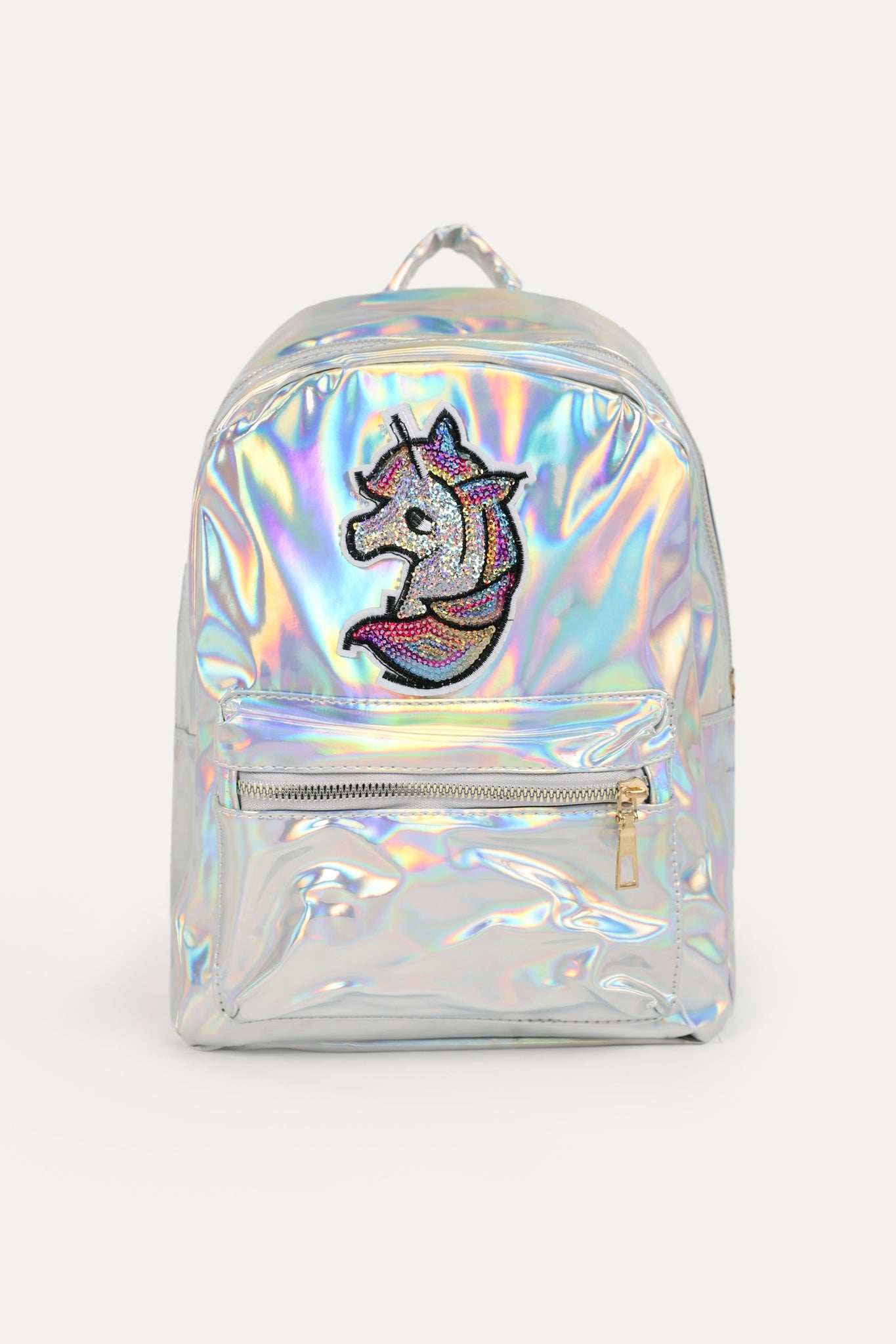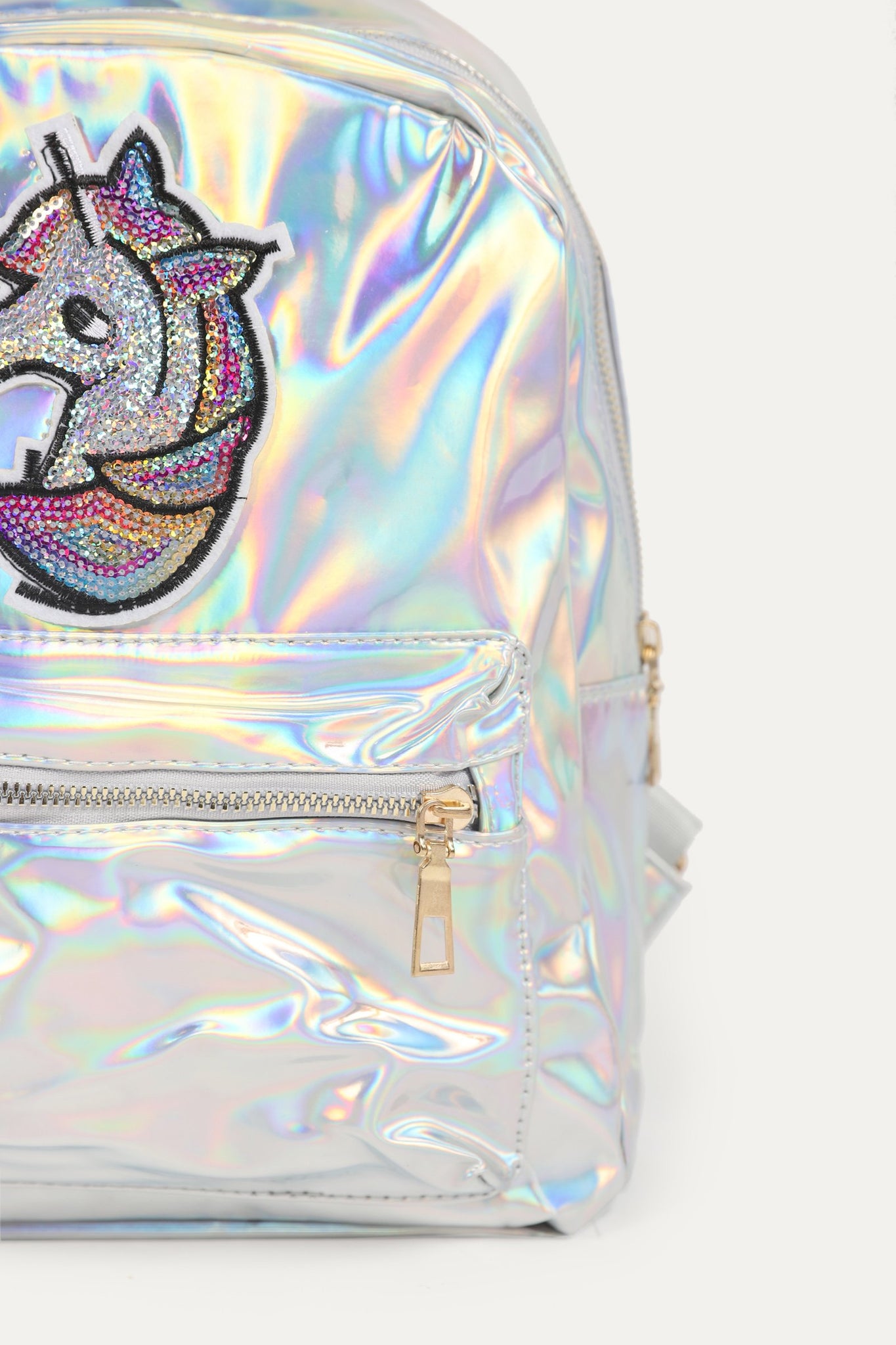 Back pack bag with zipper front pocket, zipper detail, back shoulder straps, sequin front and plain back