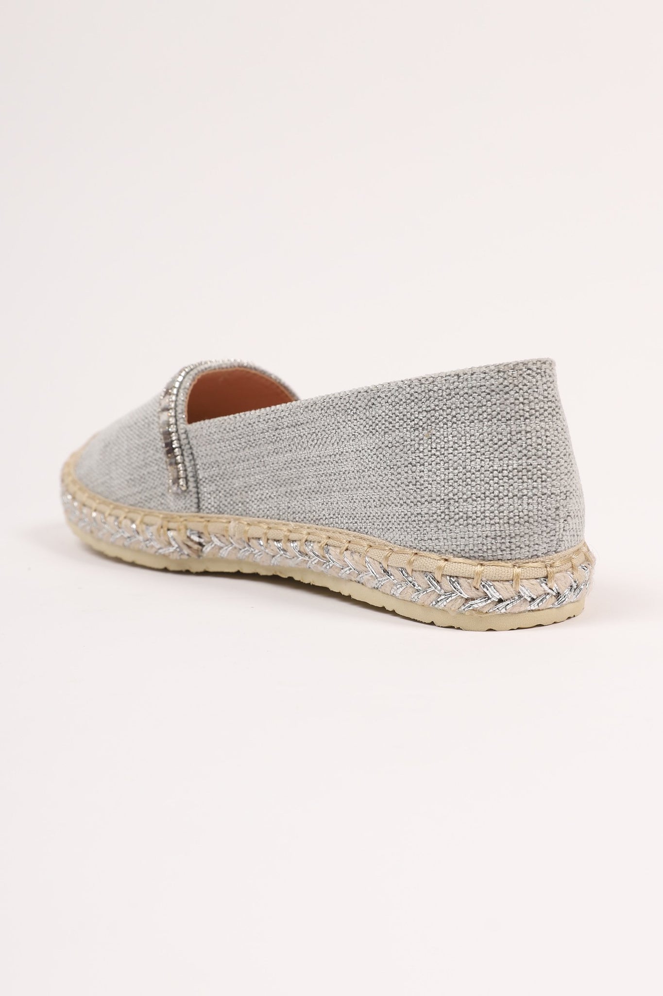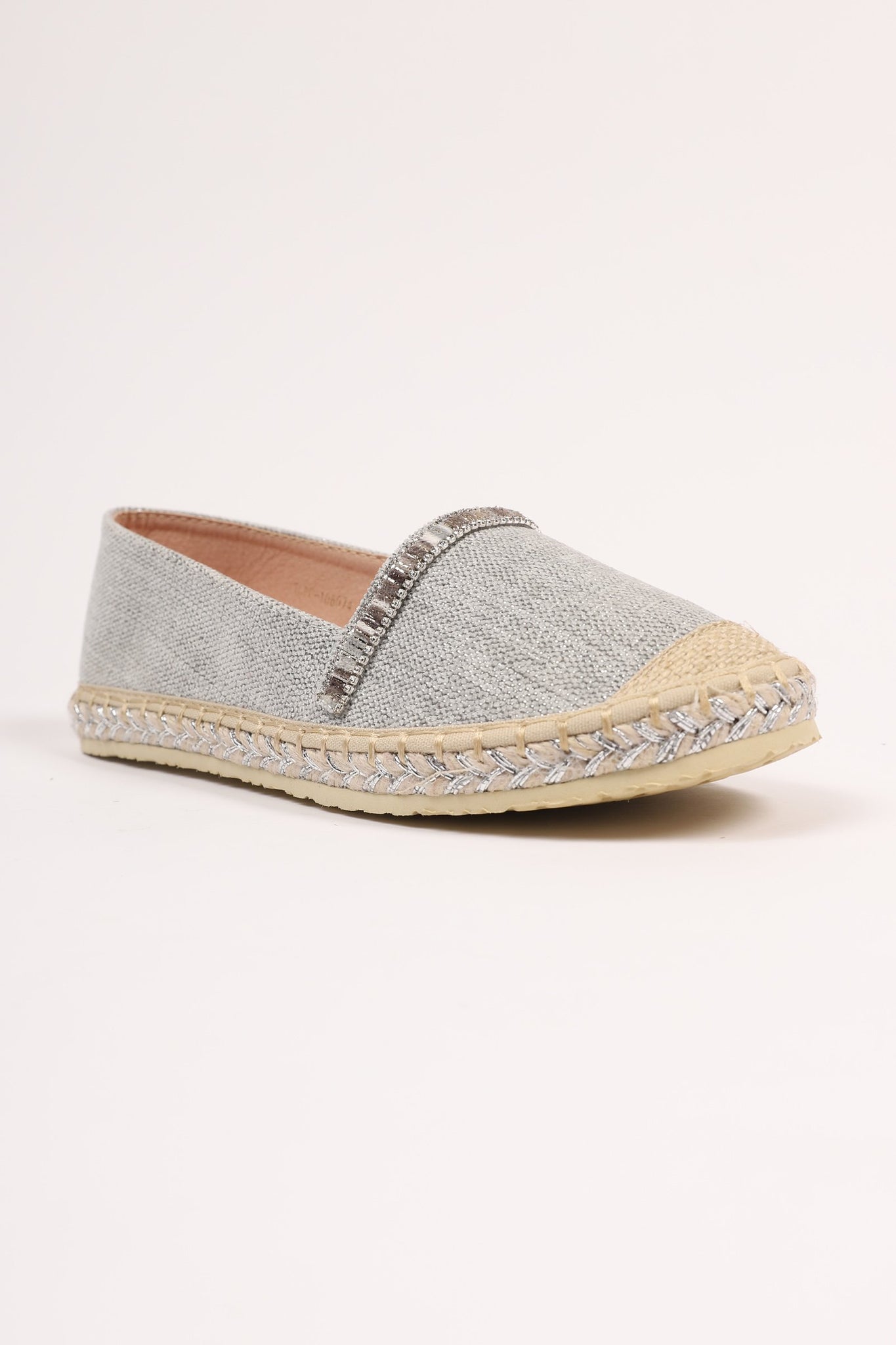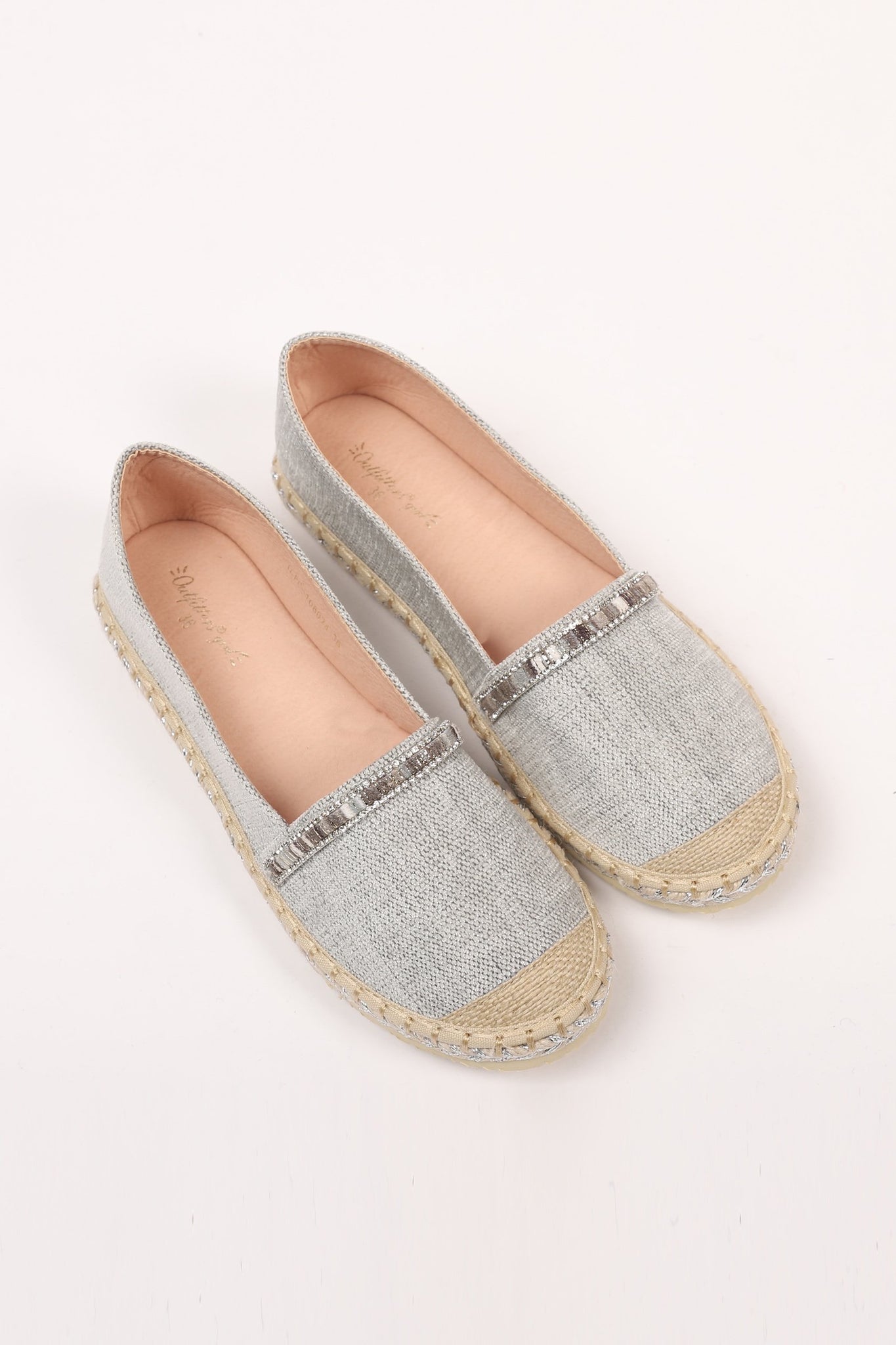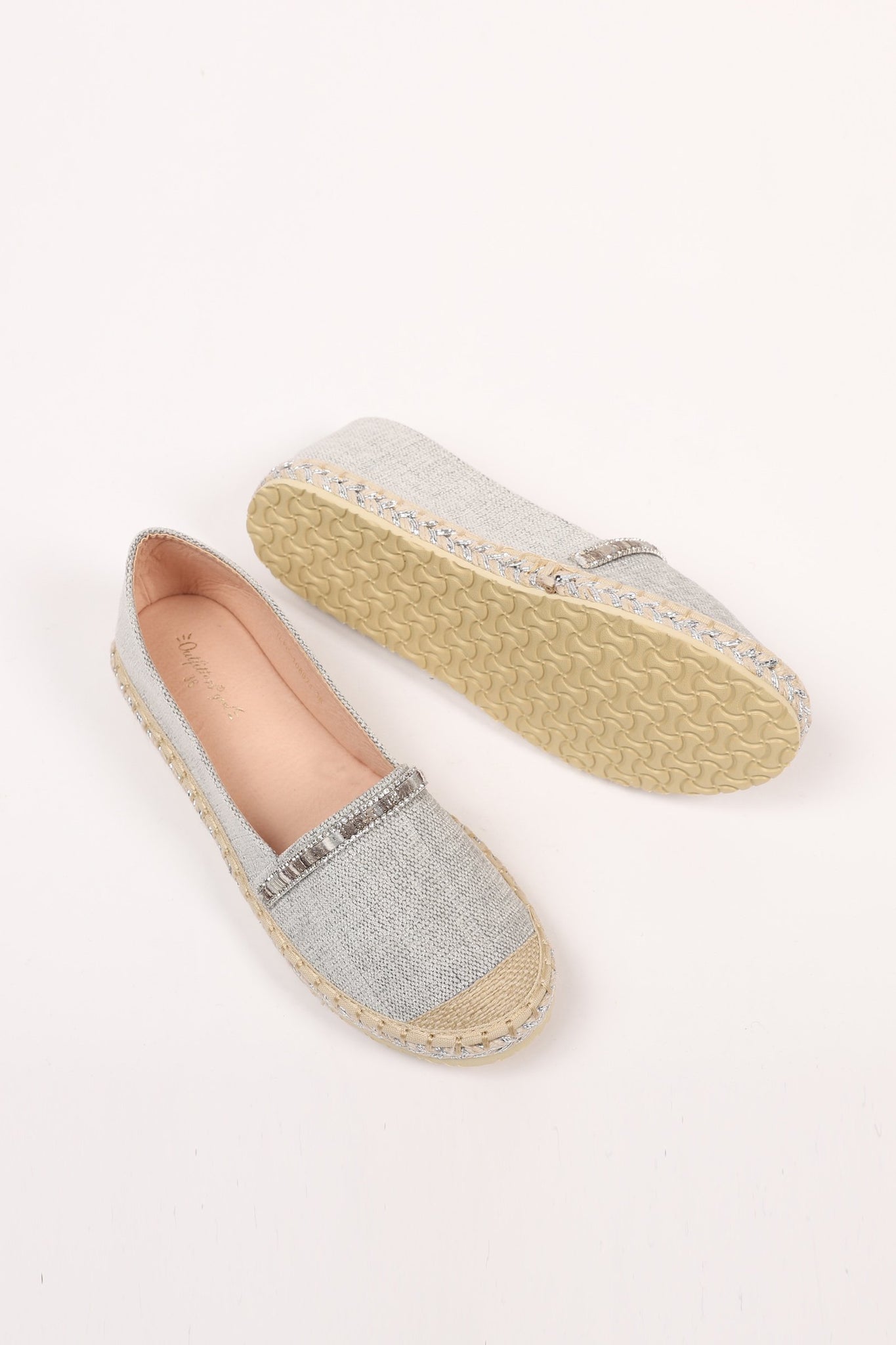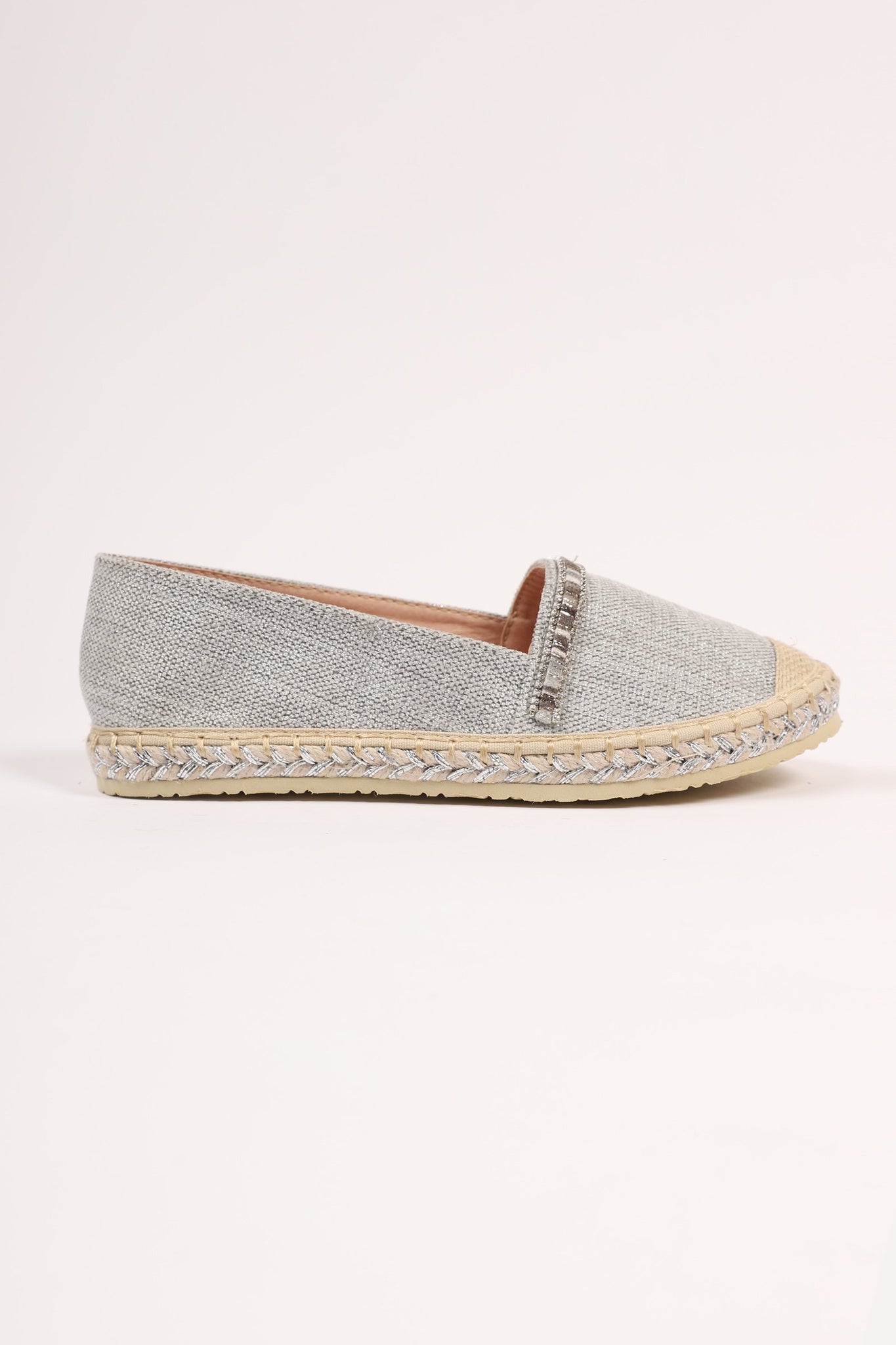 Shoes with espadrille style layered with canvas fabric over all, rubber sole and braided details