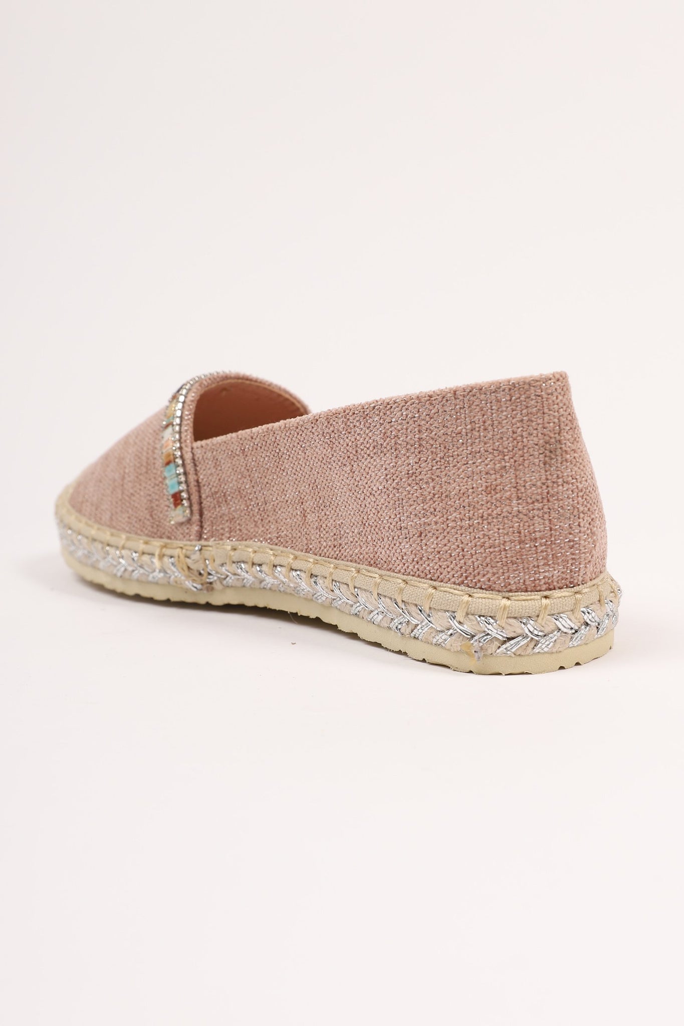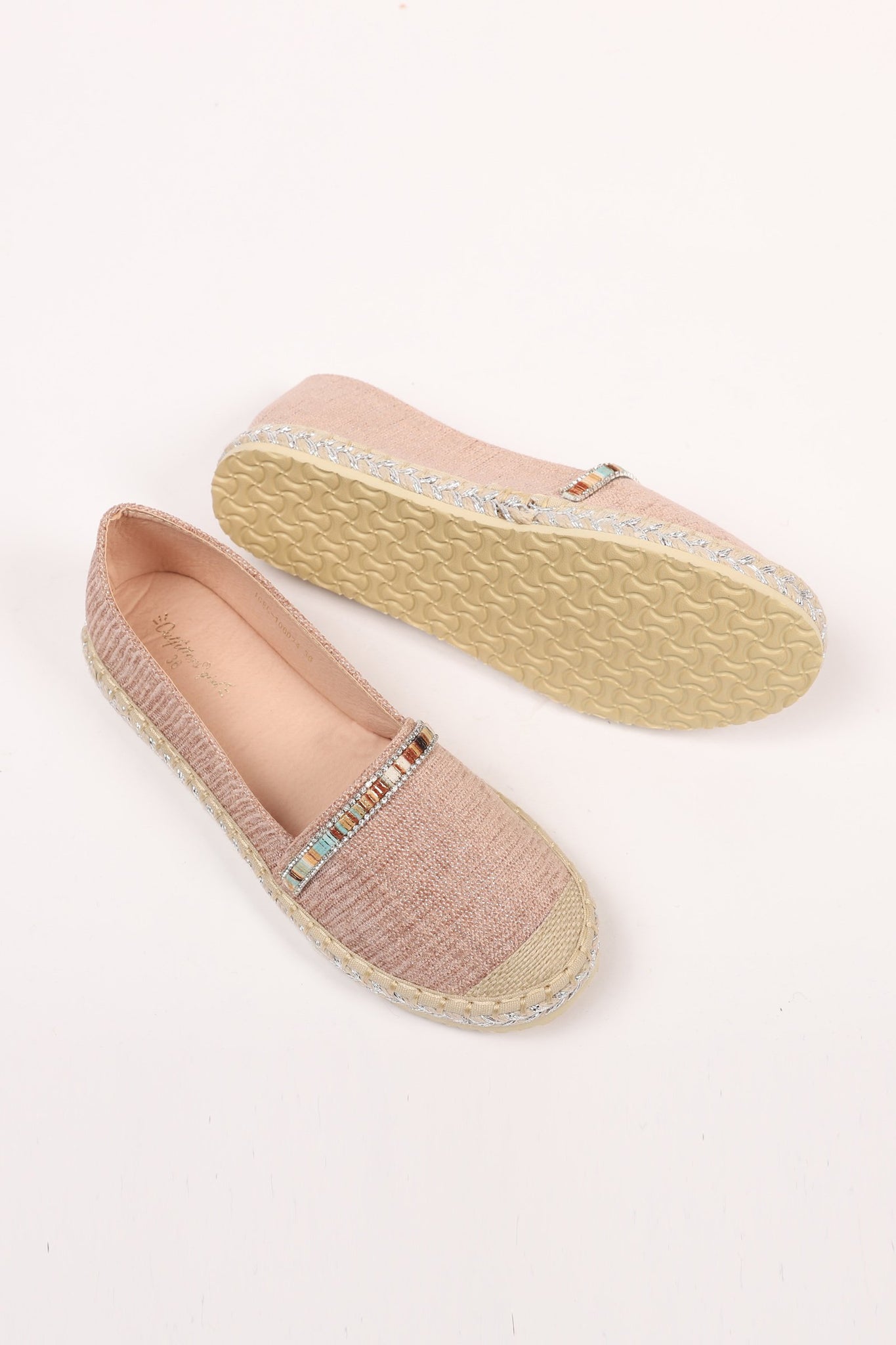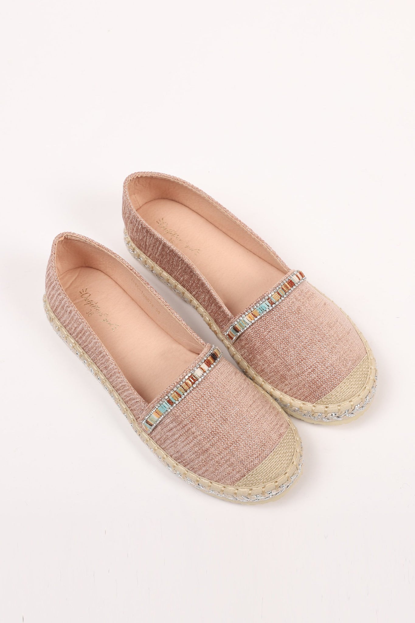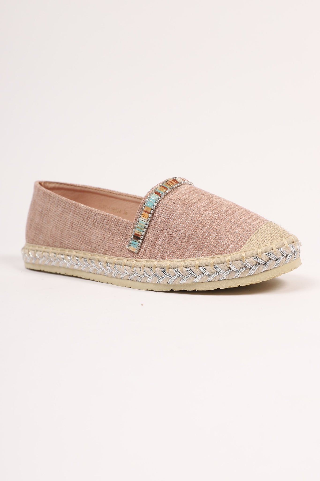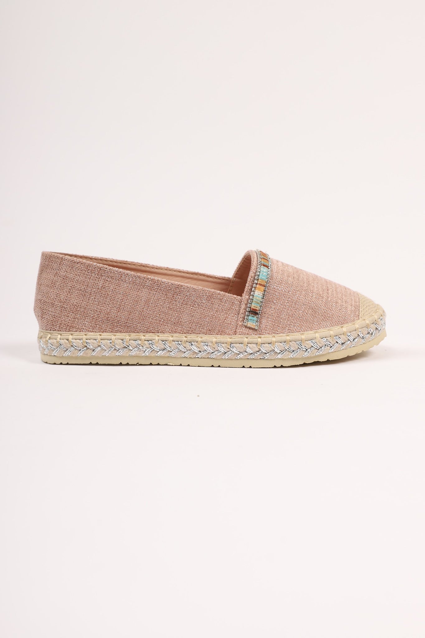 Shoes with espadrille style layered with canvas fabric over all, rubber sole and braided details