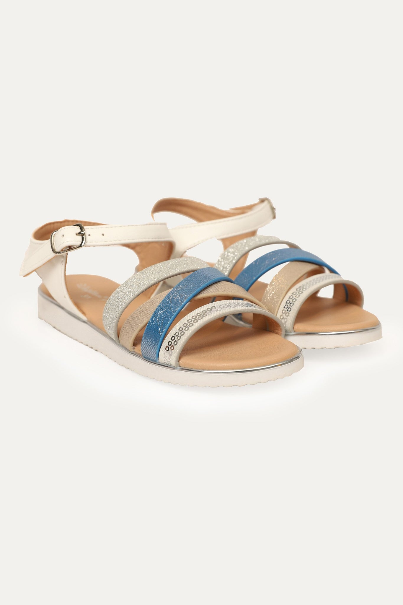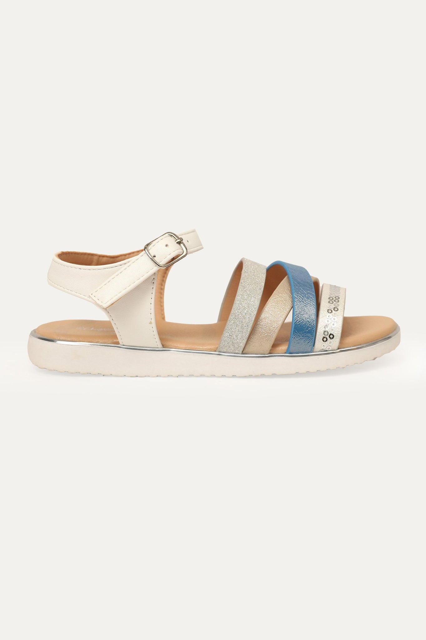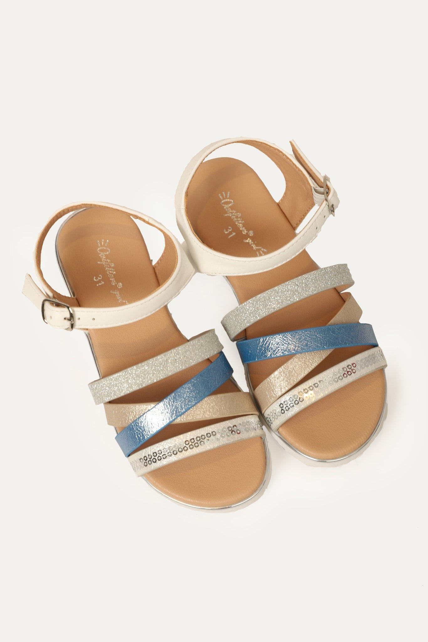 Multi color Shiny PU cross strap sandal with white sole that has Shiny edge pimping