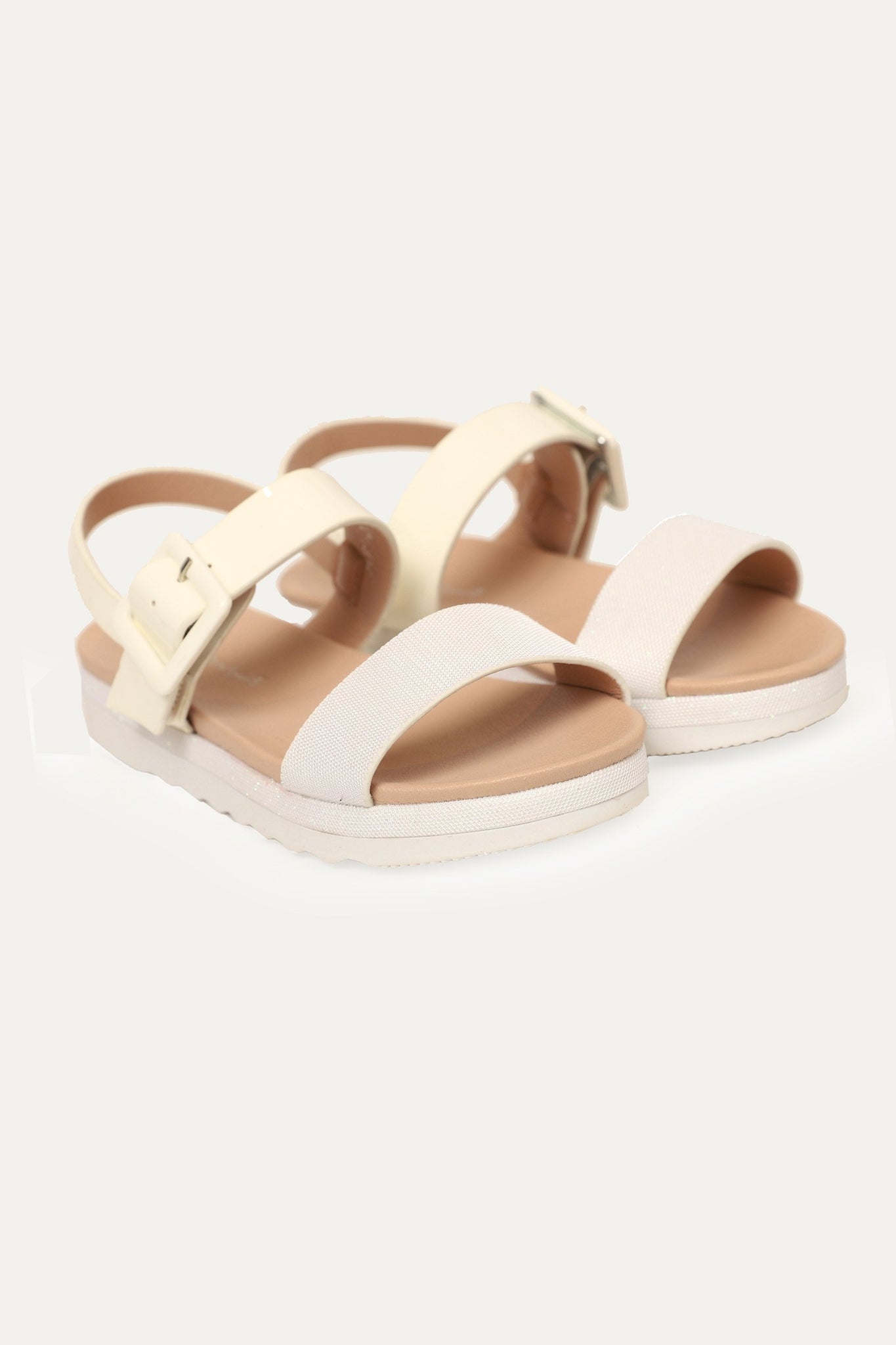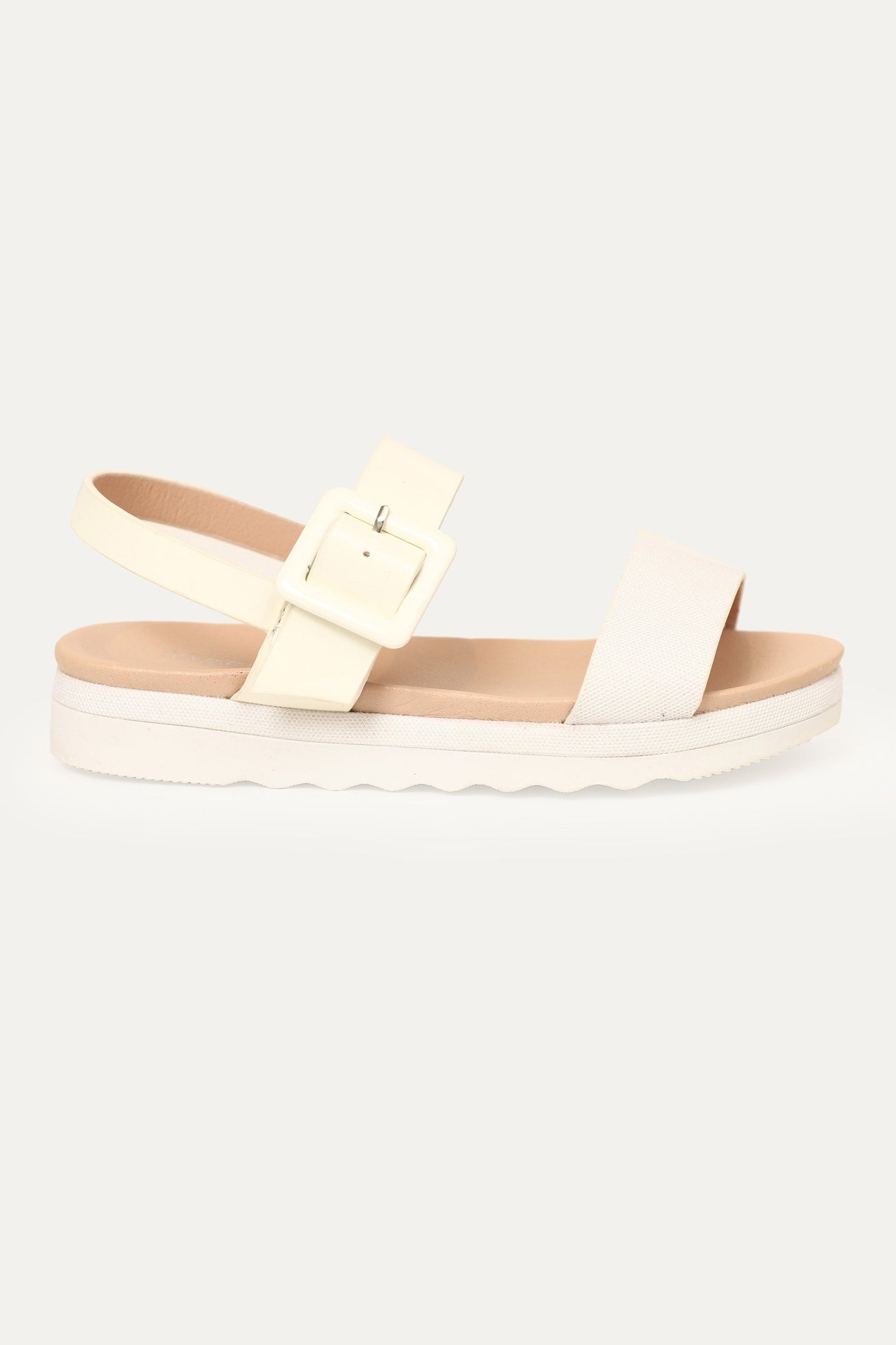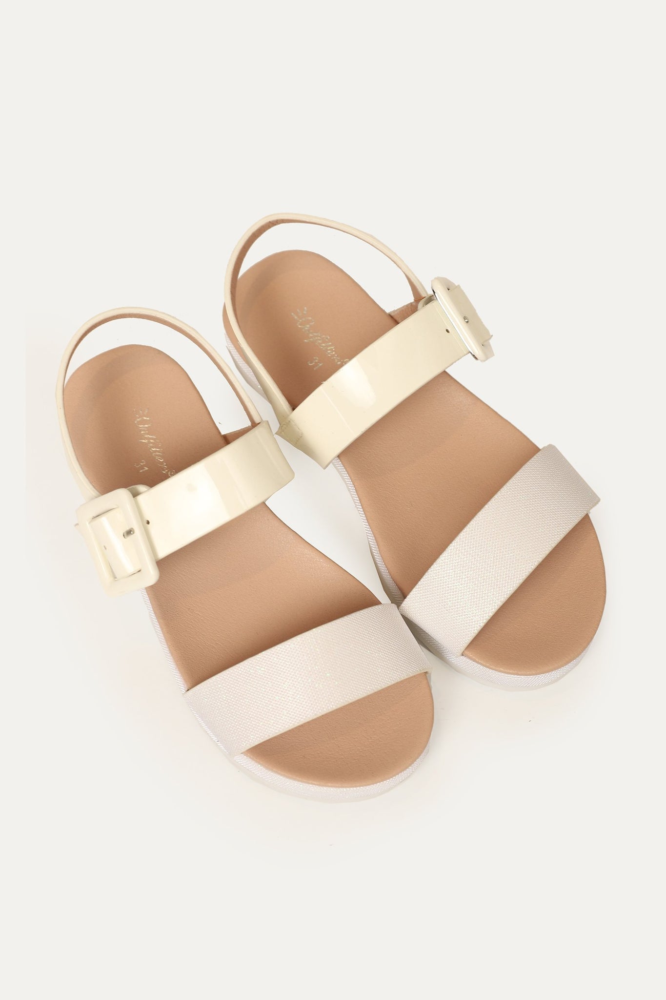 - Sandal with front Shiny PU strap and Patent back strap with buckle and white sole that has braided and Shiny egde pimping