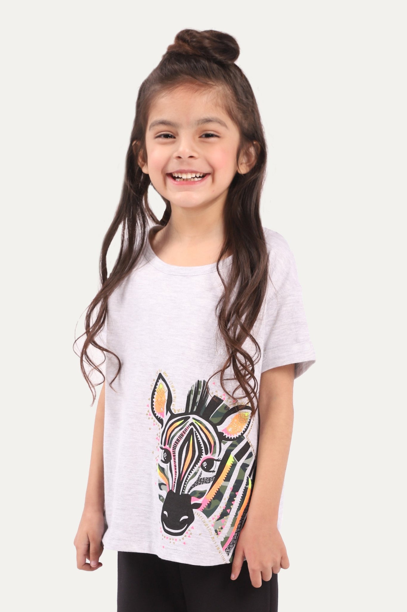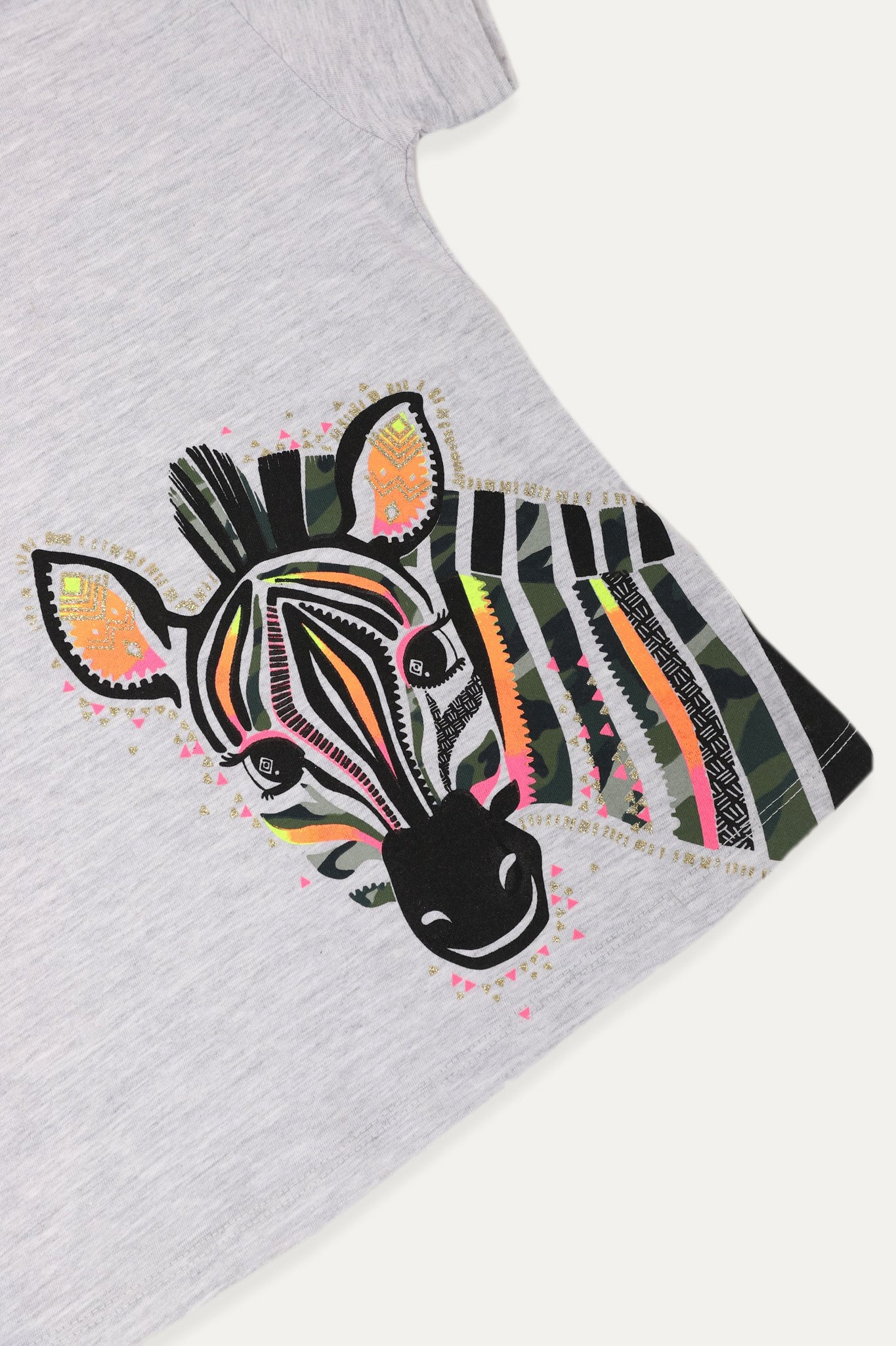 Round neck t-shirt with turned-up half sleeves and colorful zebra print with glittery details