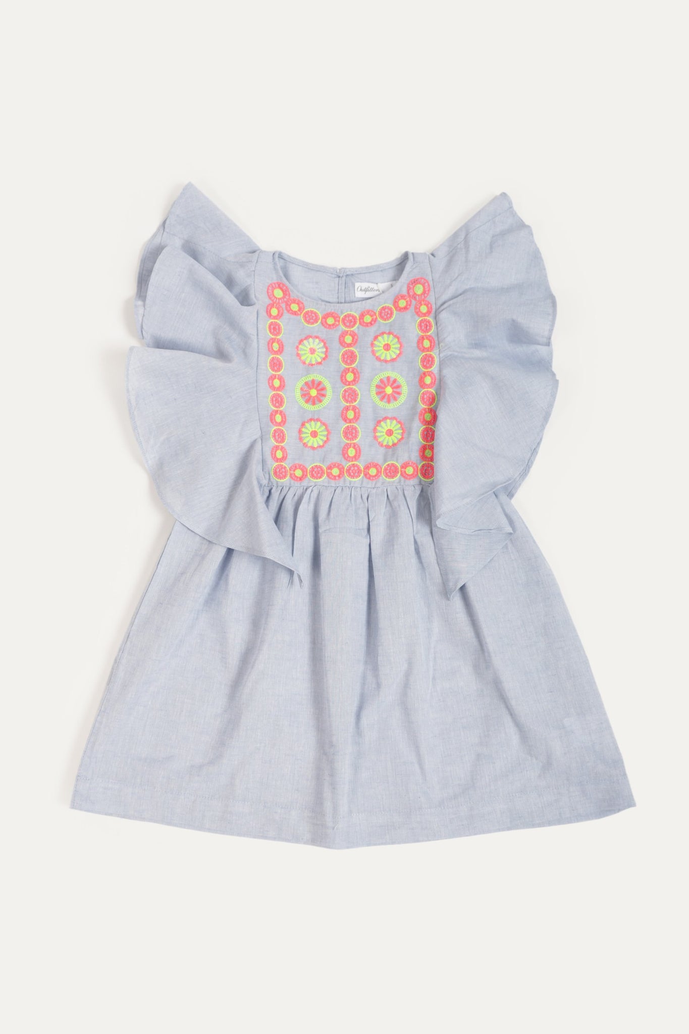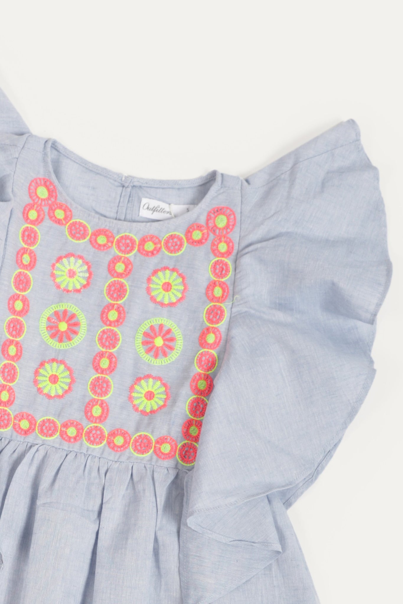 Shirt with embroidered detail ruffled front, round neck, sleevesless flare design front and backComposition & Care: