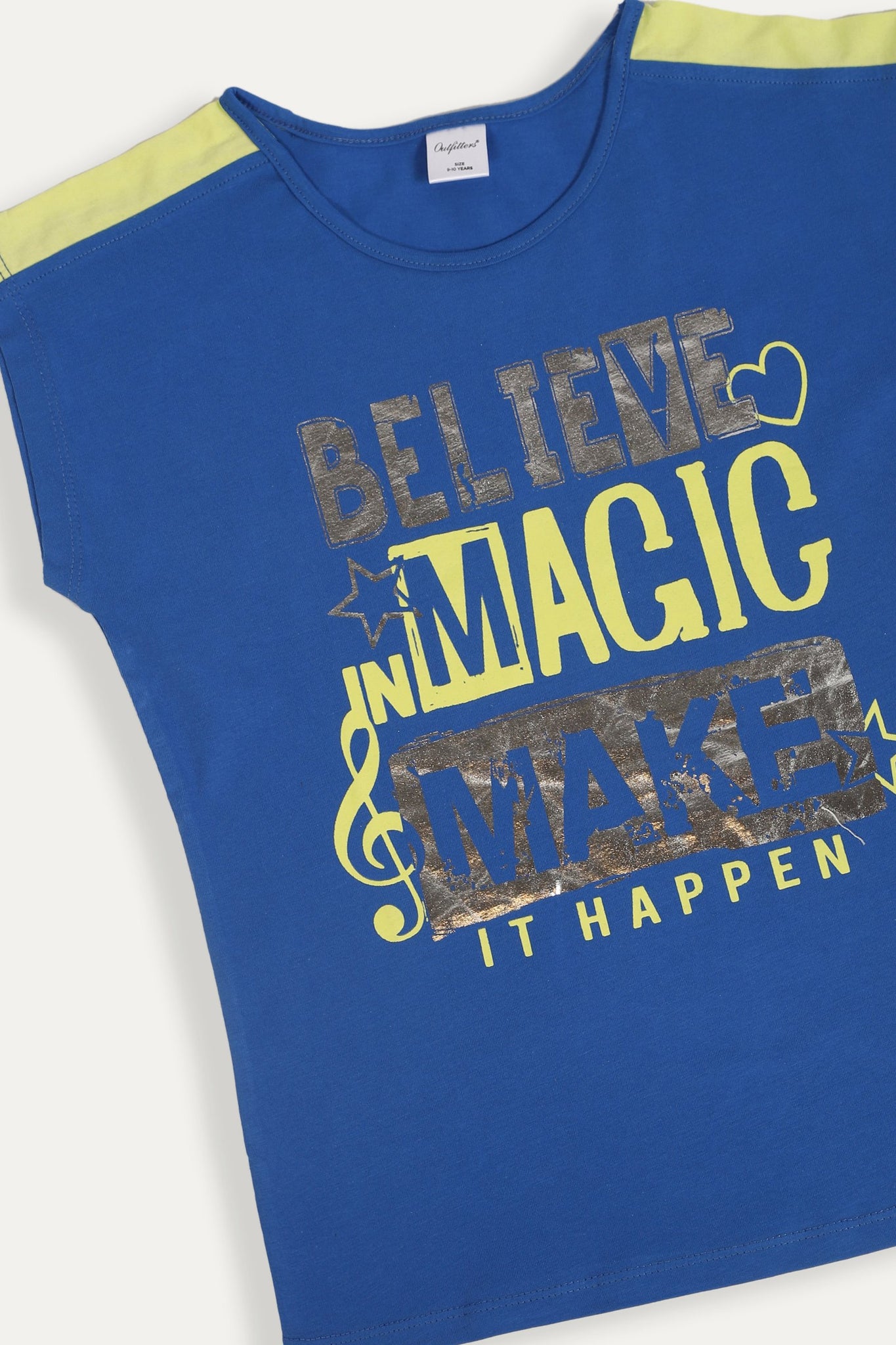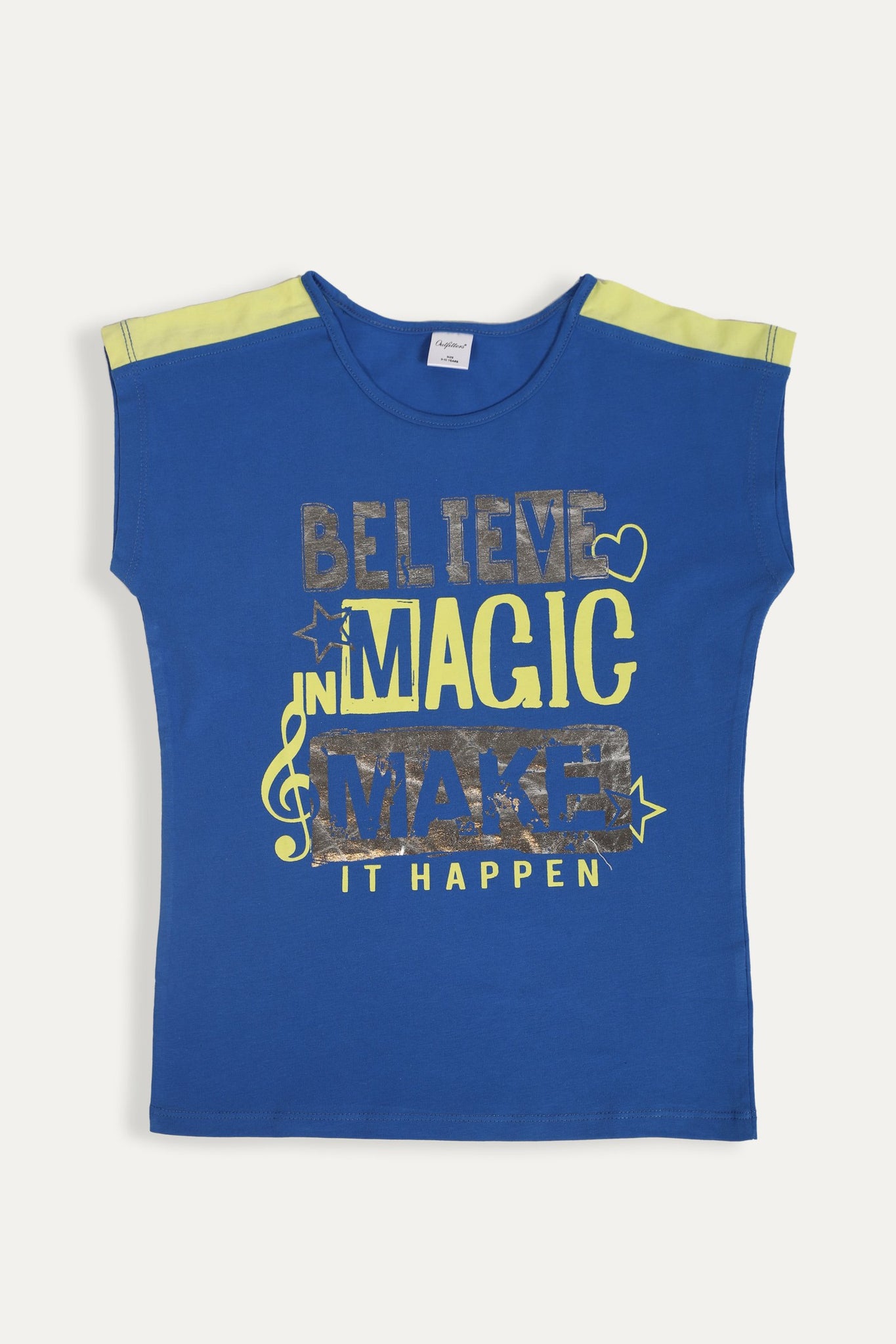 Graphic shirt with round neck, cap sleeves and glittered statement screen design on front