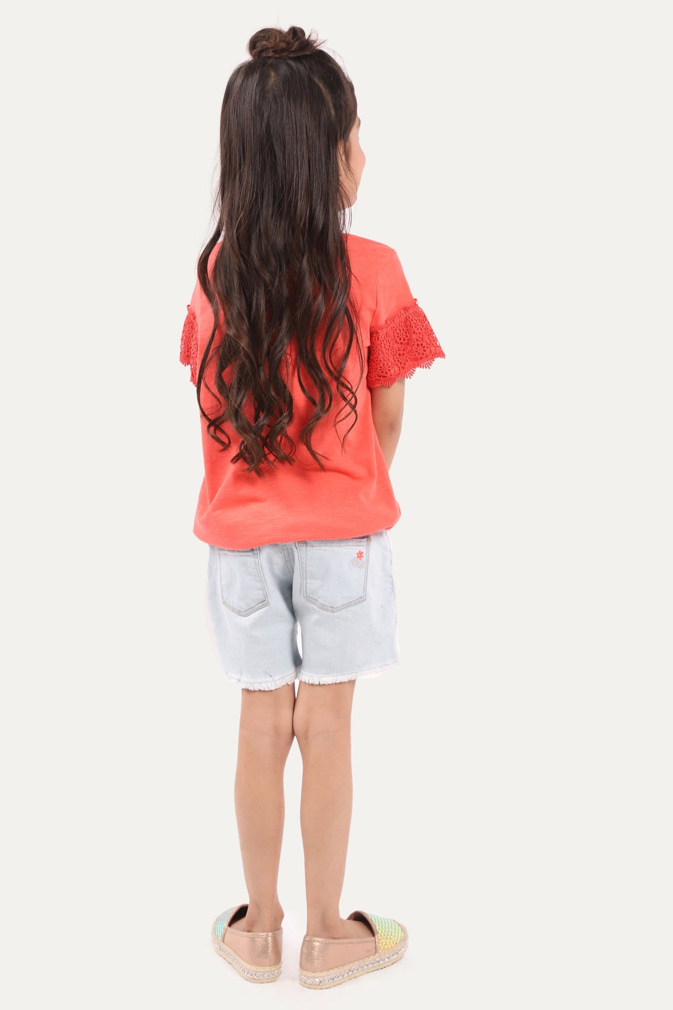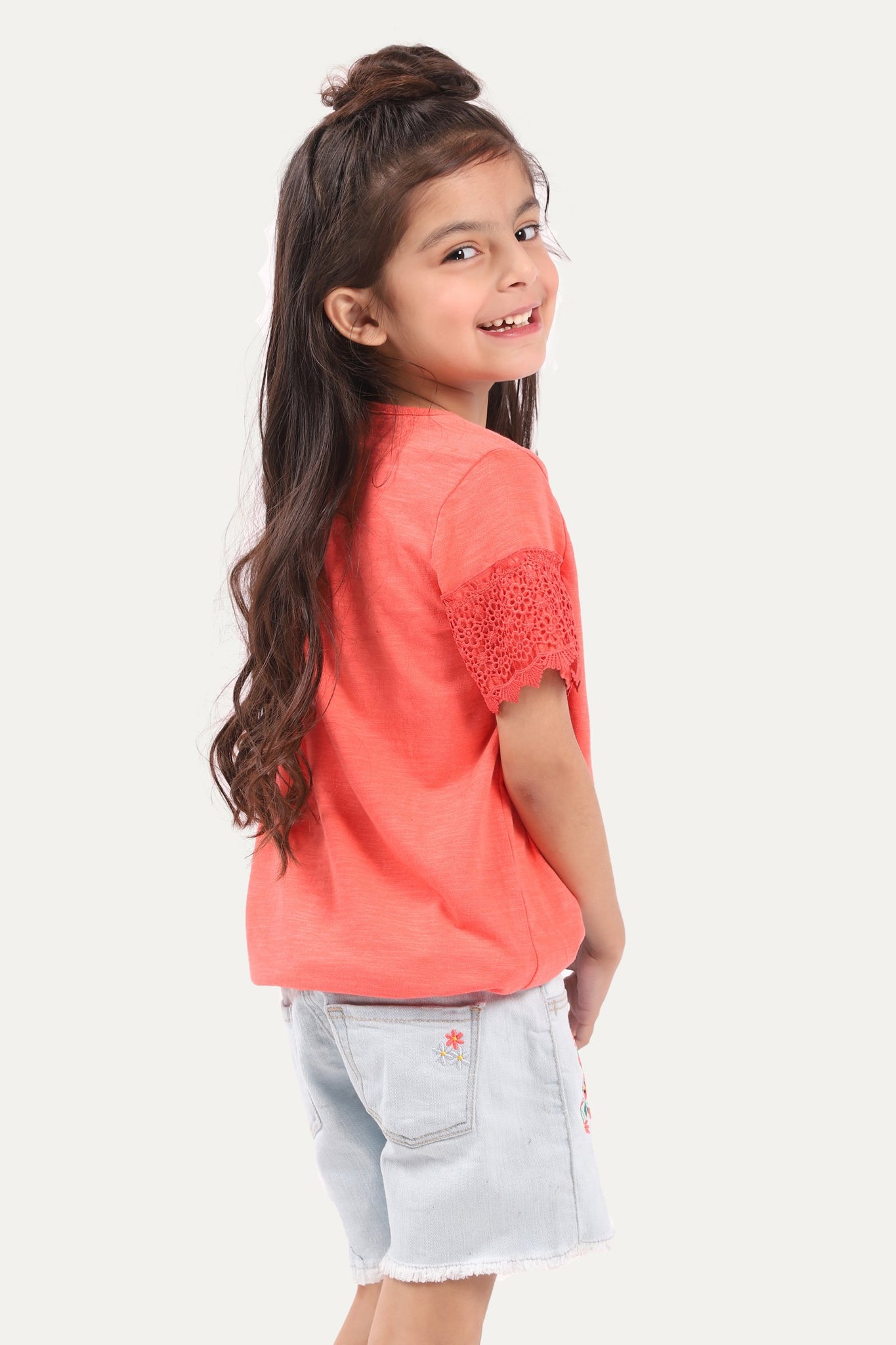 T-Shirt with lace detail half sleeves, round neck, perfect graphic front and plain back
