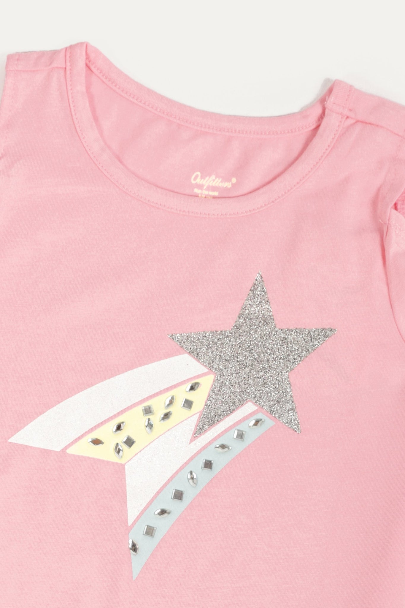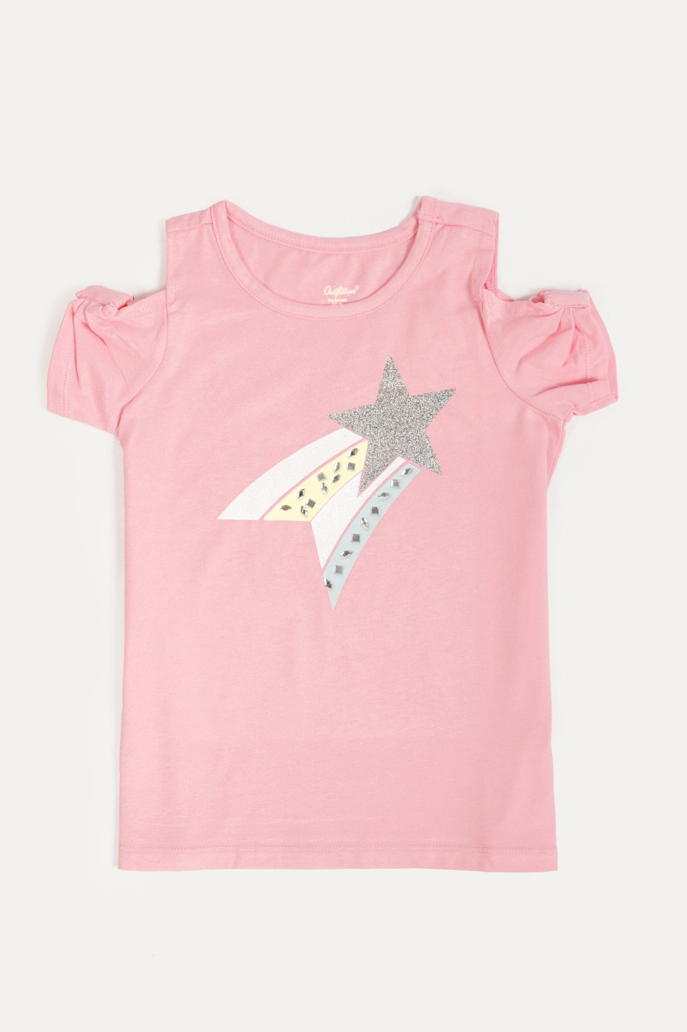 Shirt with sequin detail front and plain tights, off shoulder half sleeves and round neck