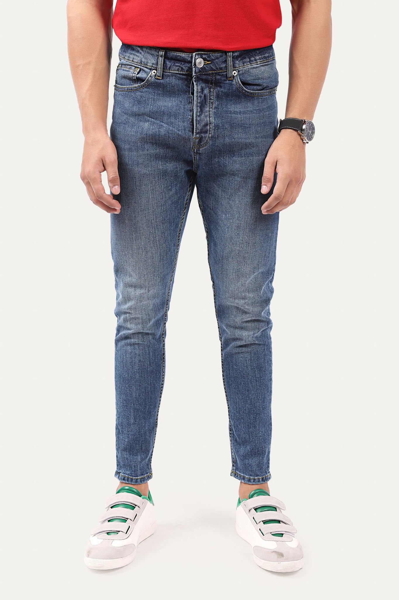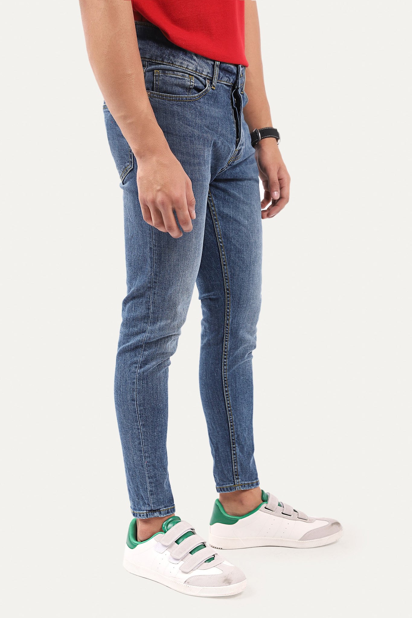 Denim Jeans with belt loops, pockets, zip fly and one button fastening