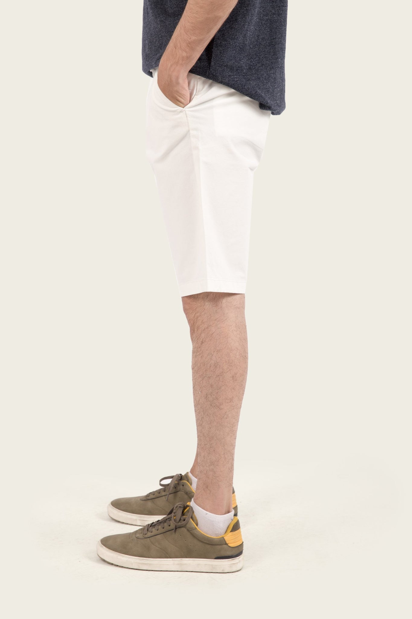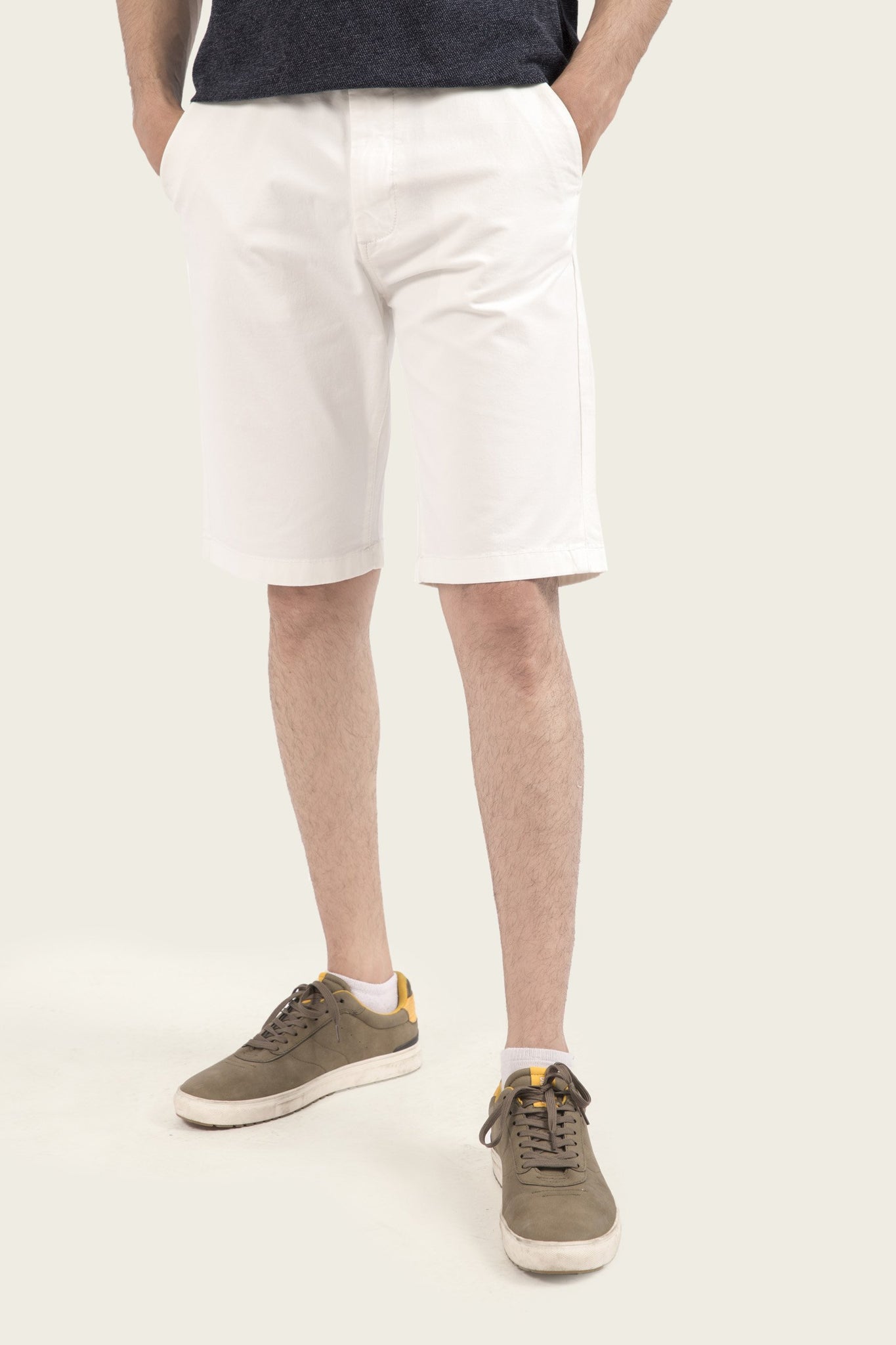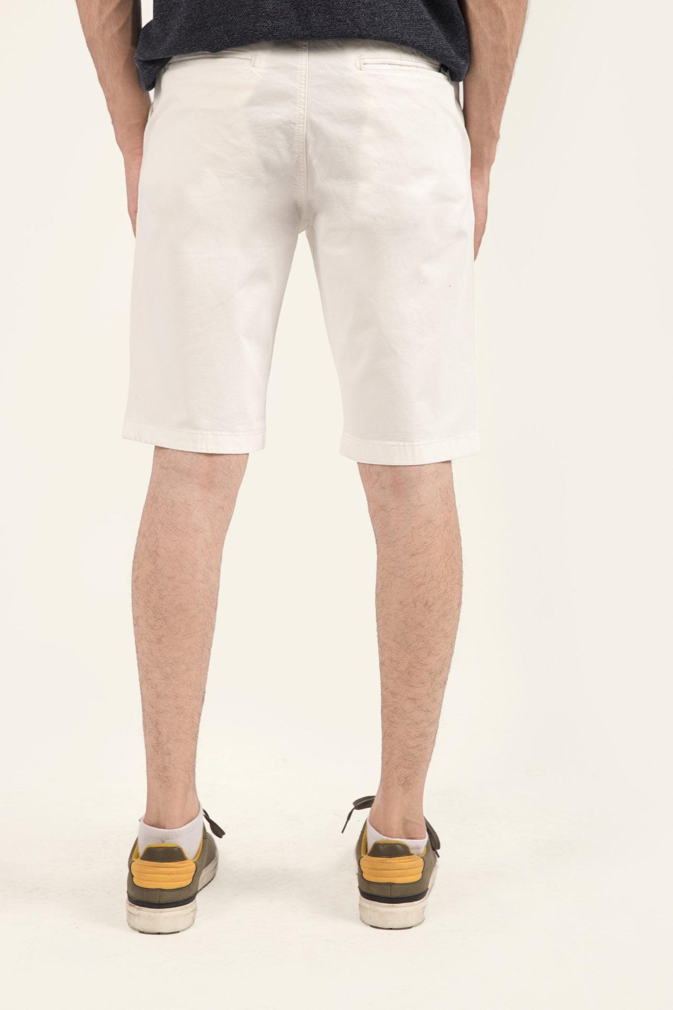 Basic shorts with belt loops, pockets, zip fly and one contrast button fastening