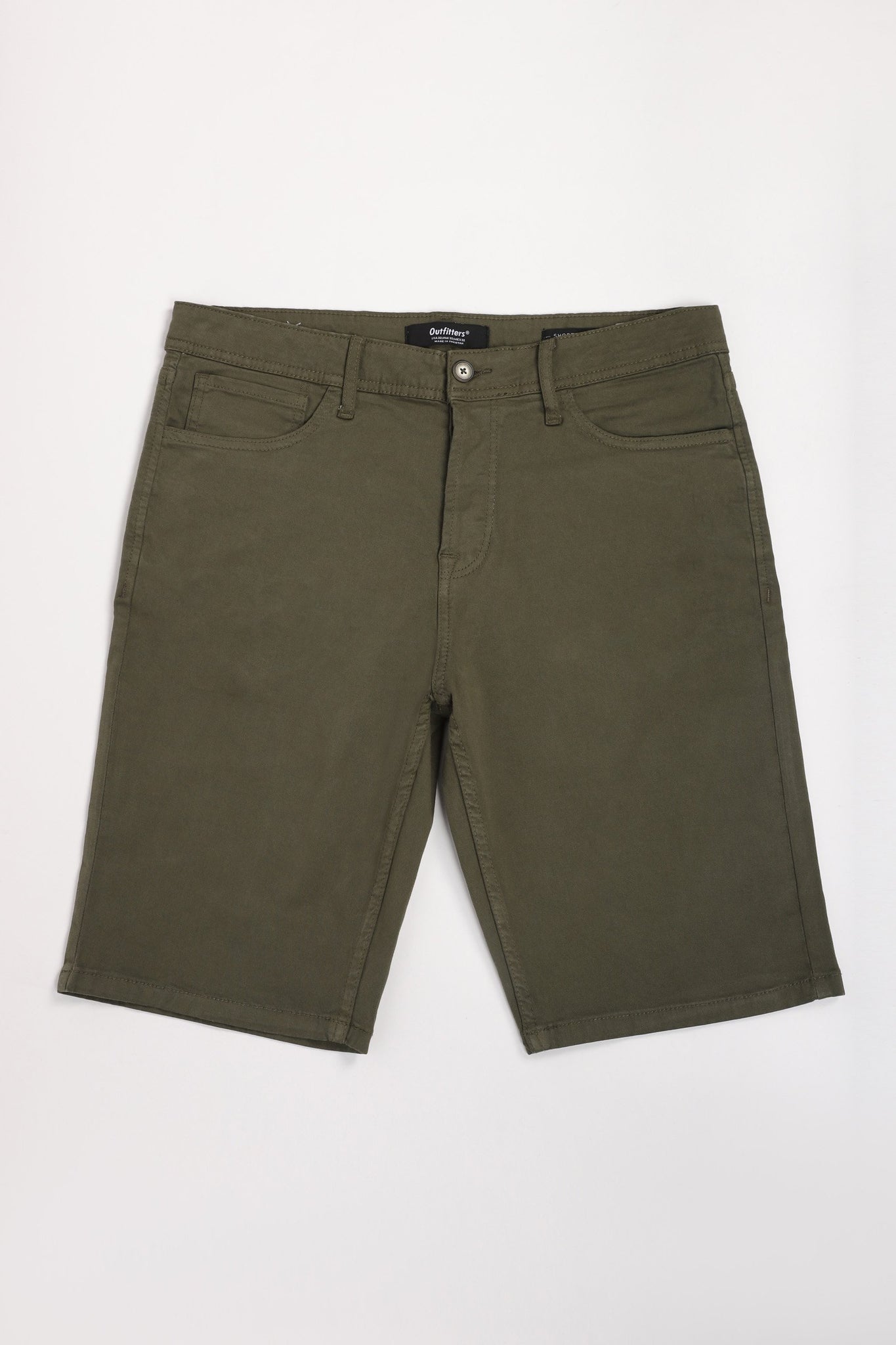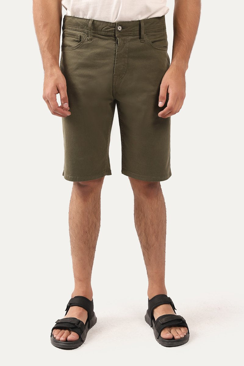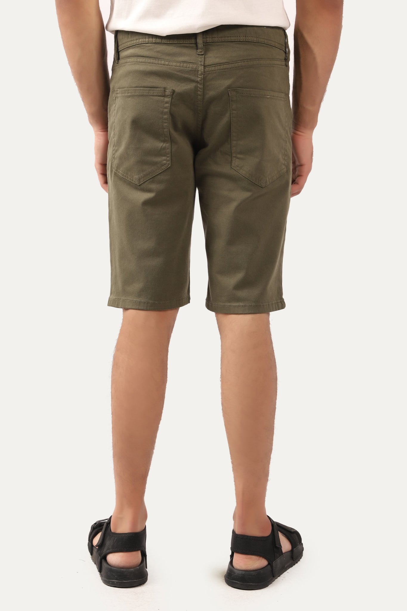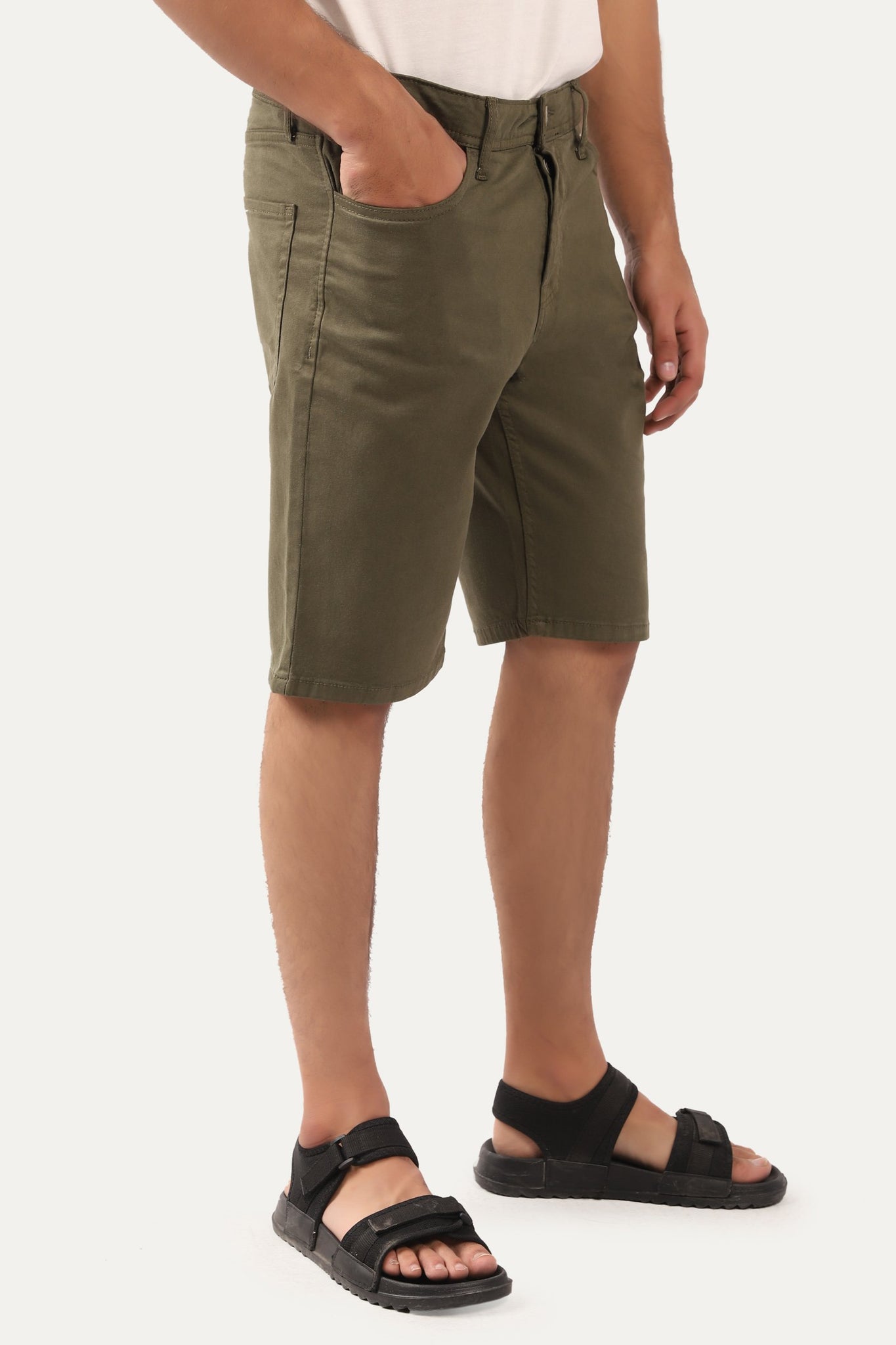 Five pocket shorts with belt loops. Zip fly and top contrast button fastening