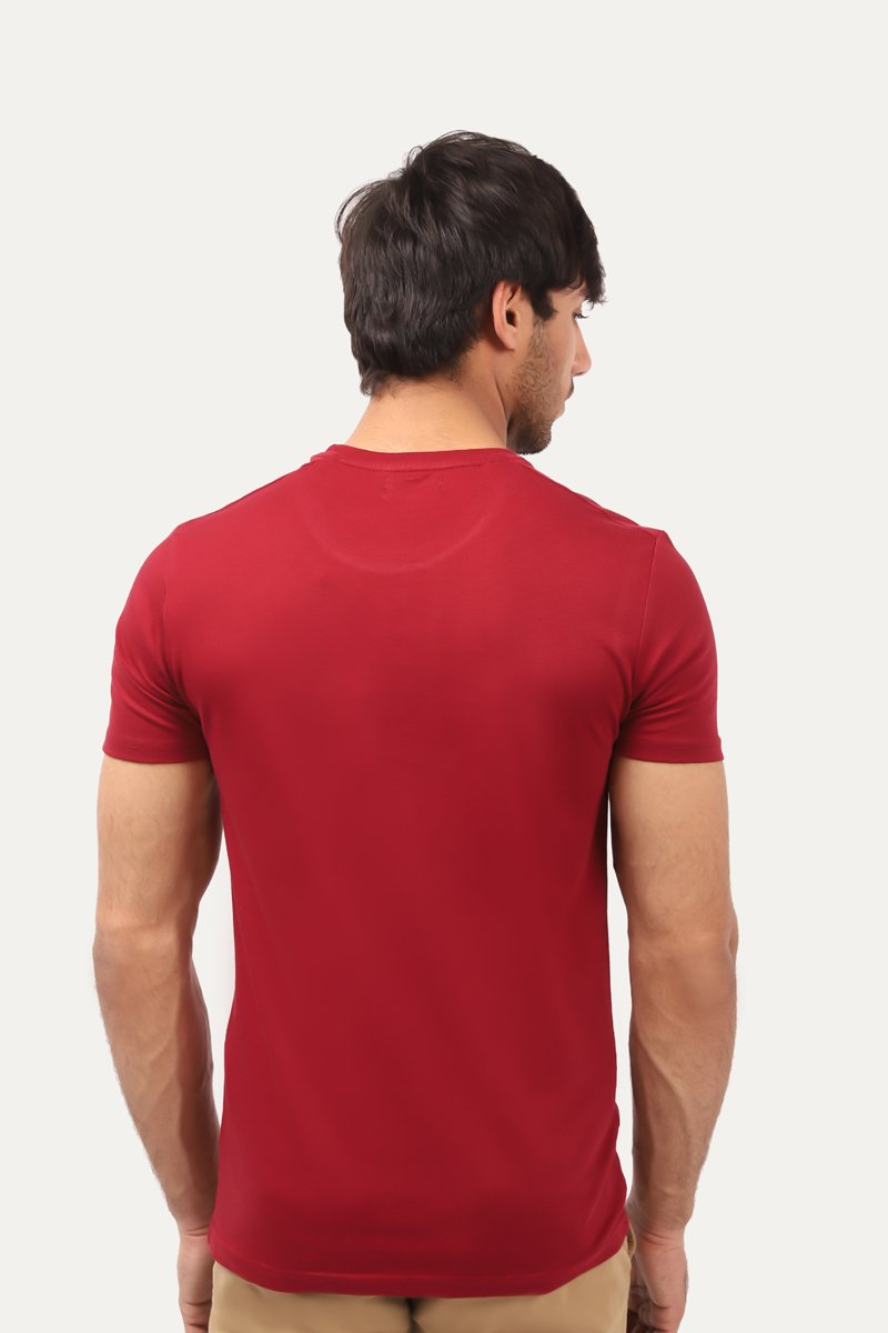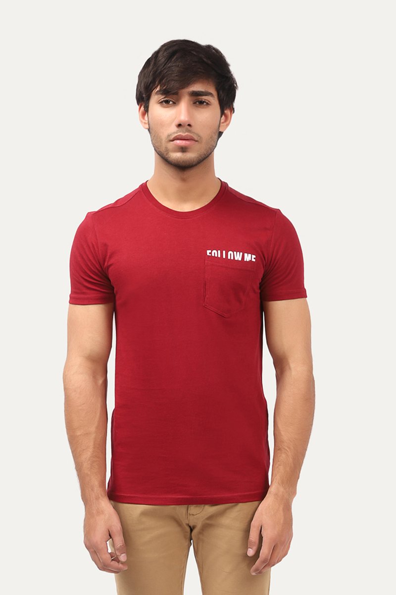 Round neck shirt with half sleeves and one chest pocket with slogan print