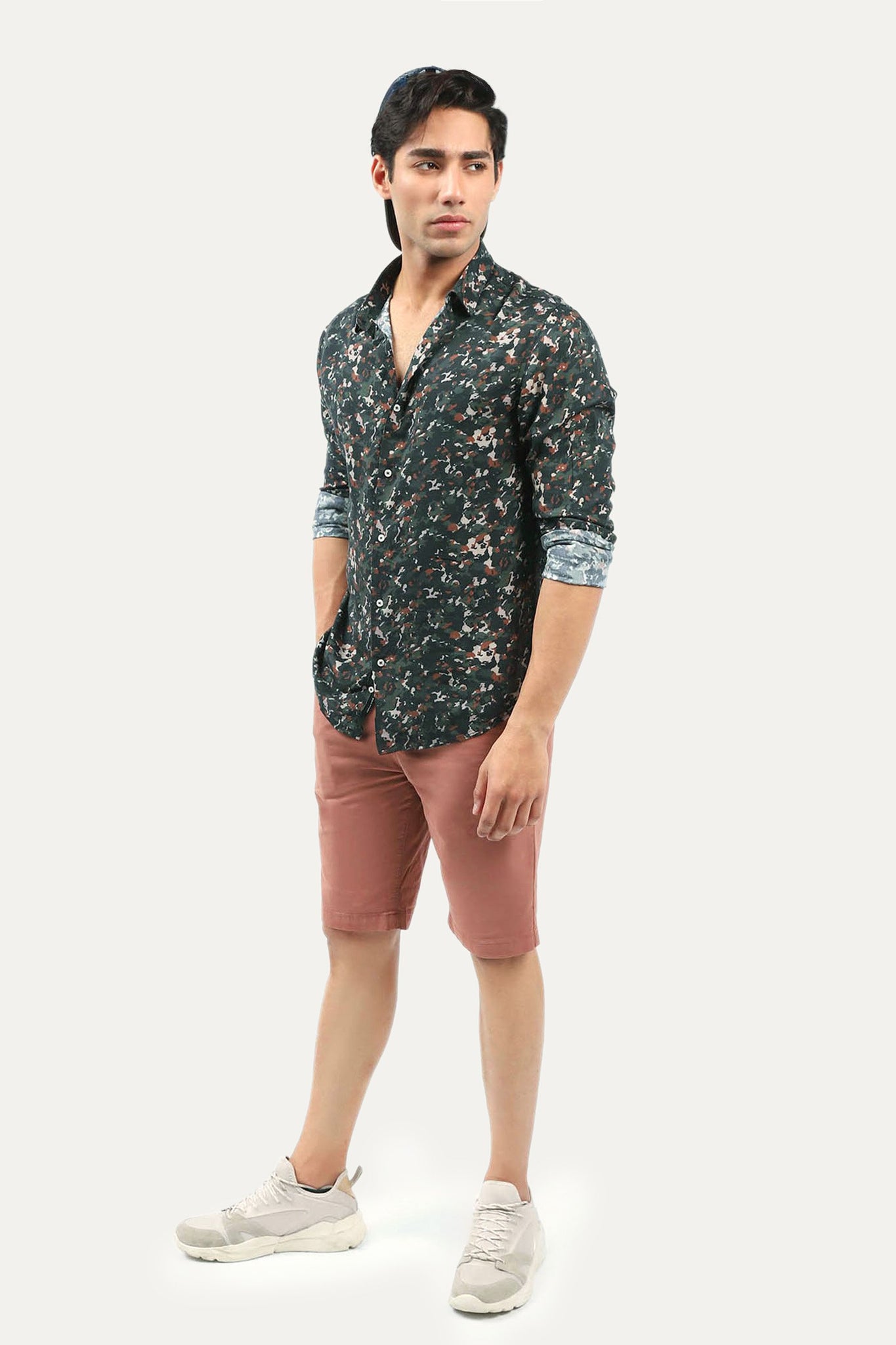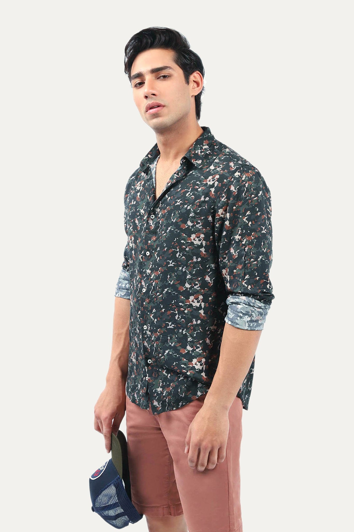 Long sleeve shirt with buttoned cuffs, classic collar, printed designed and button up front