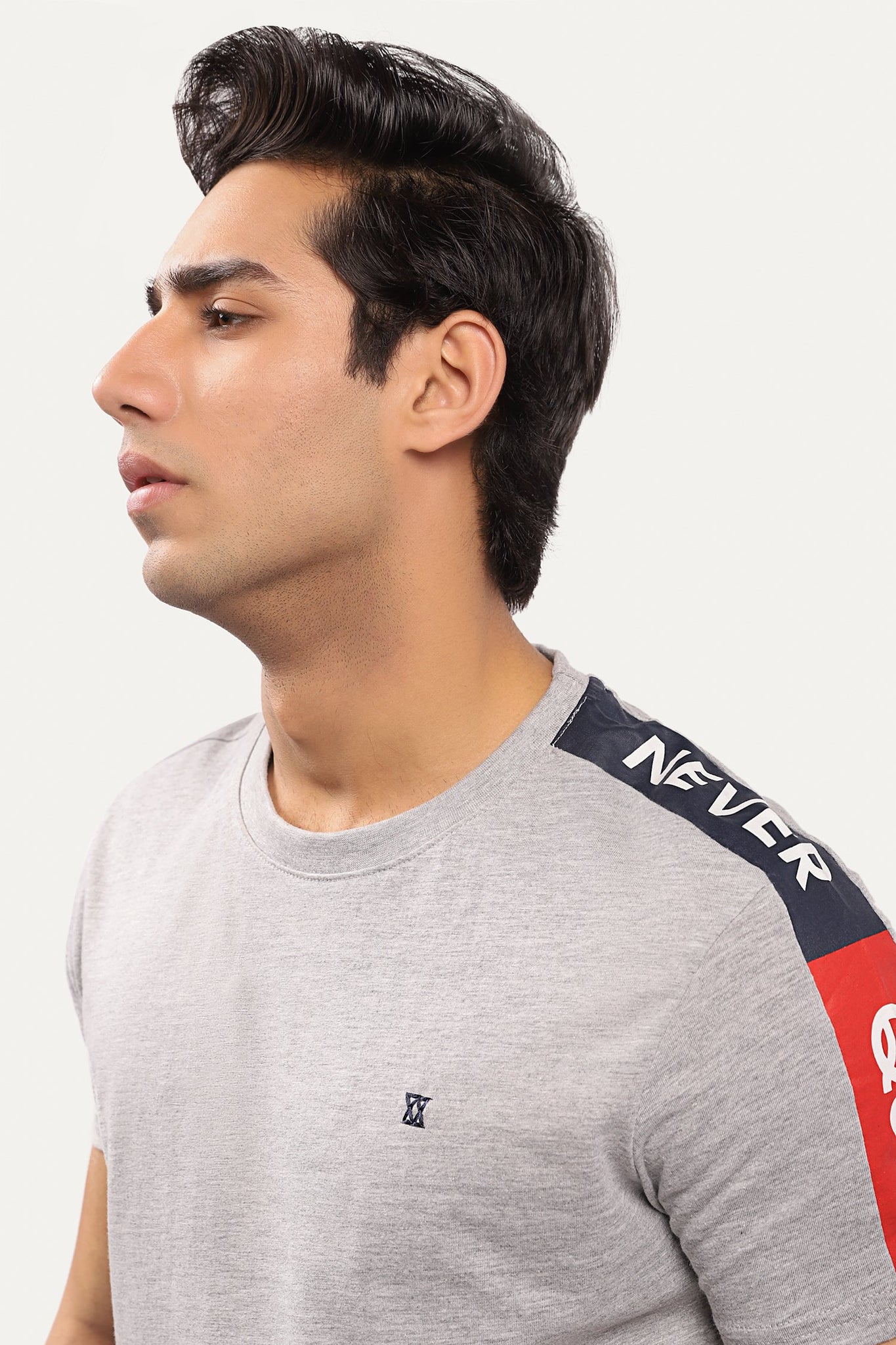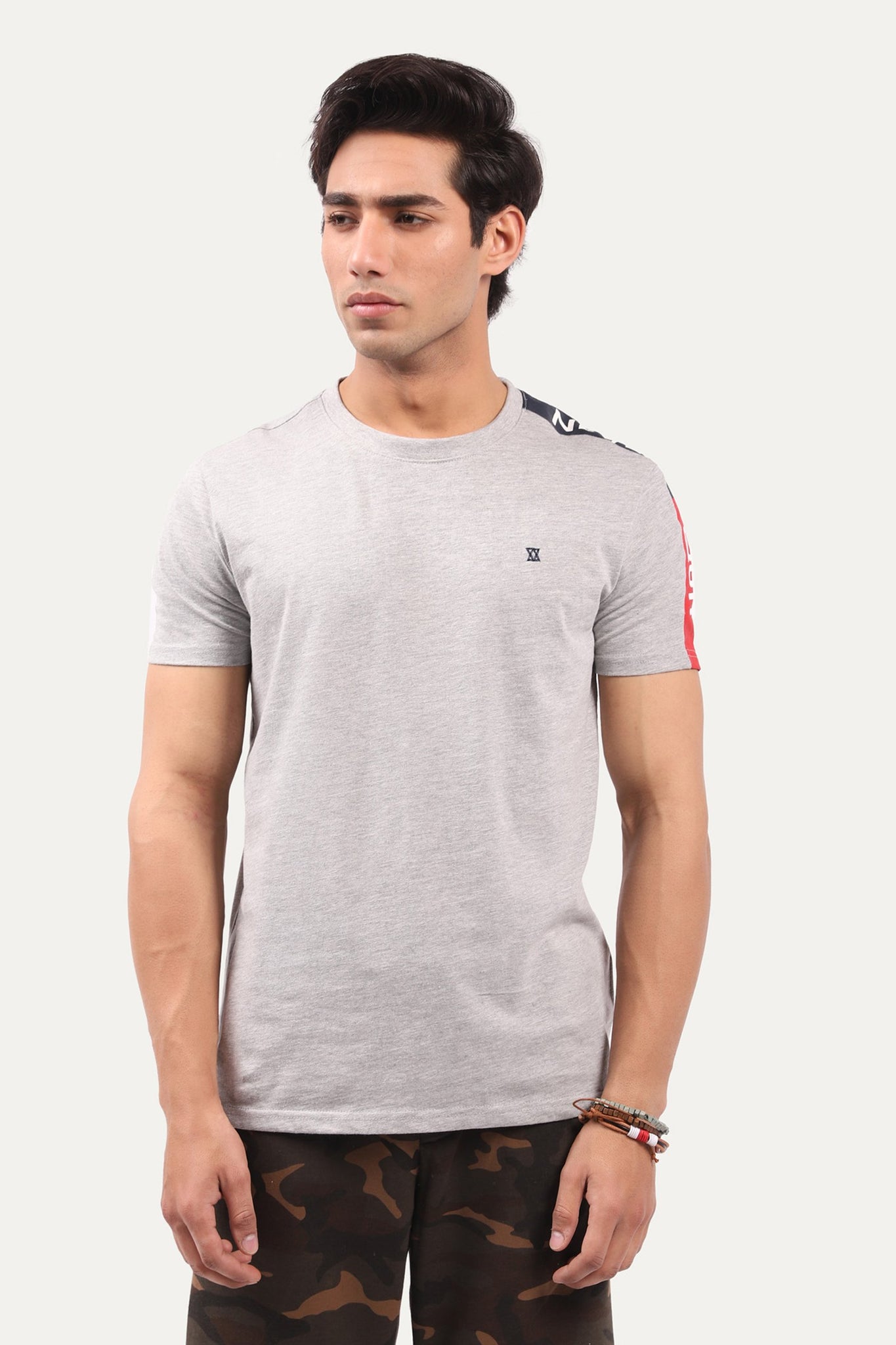 Round neck shirt with half sleeves, emblem on chest and statement taping on both sleeves
