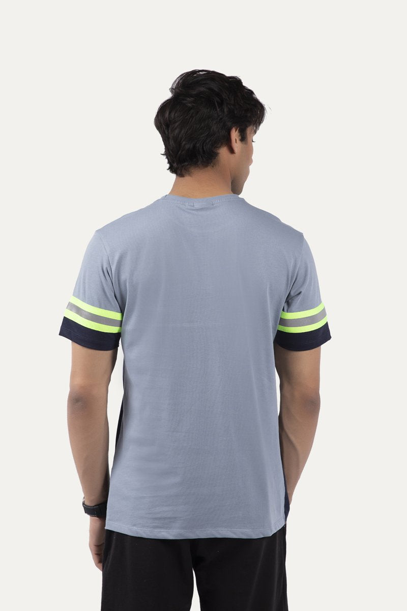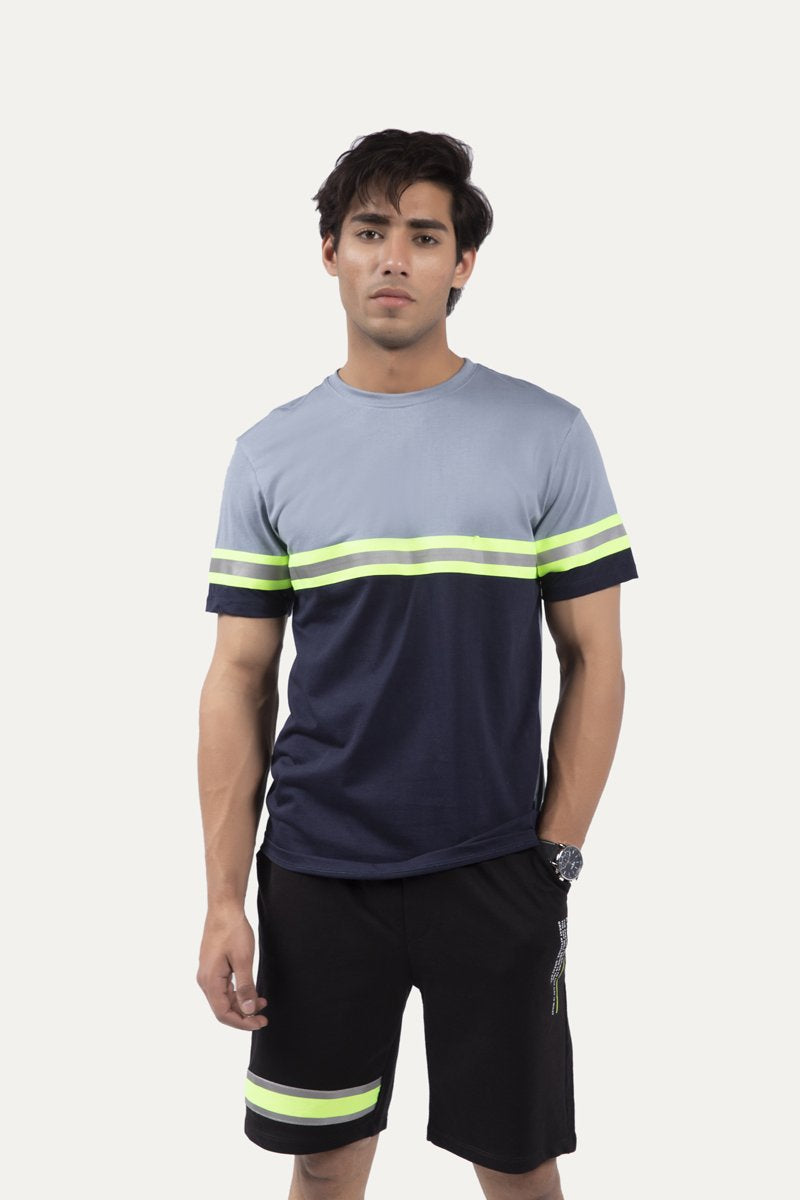 Color block t-shirt with half sleeves, round neck and and neon stripes running horizontally