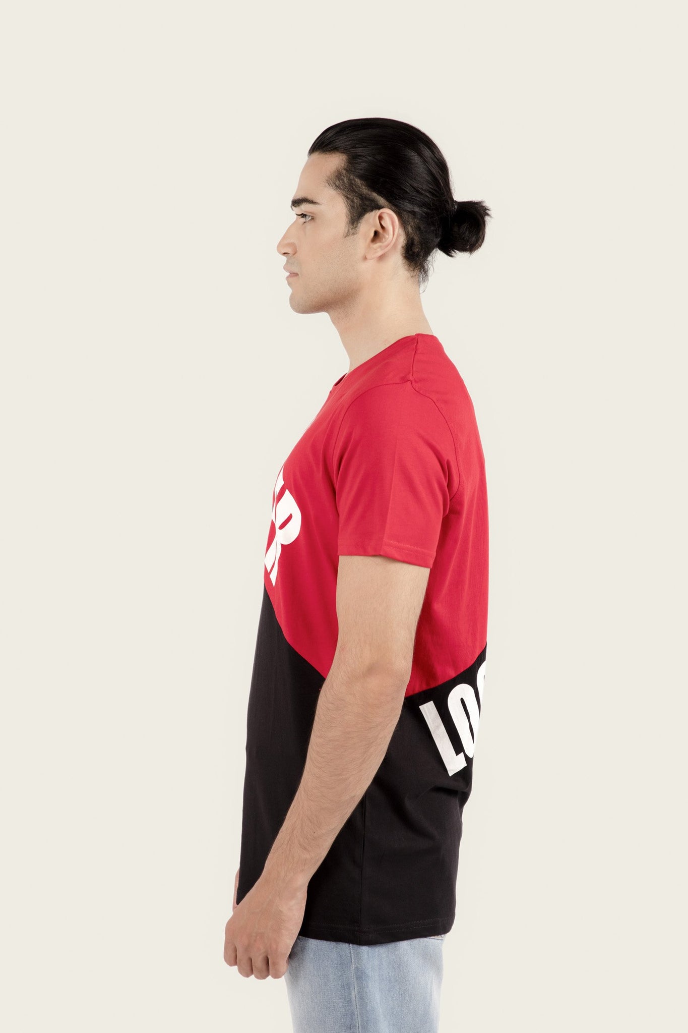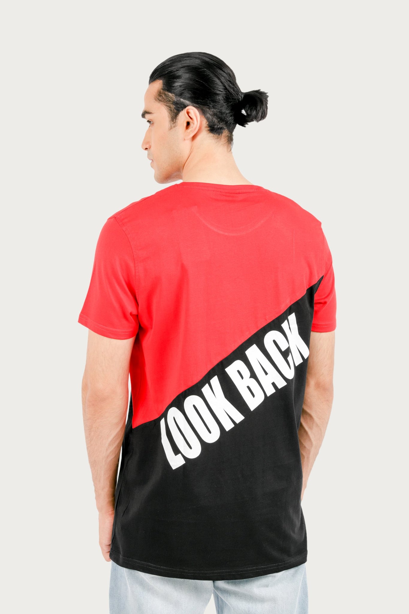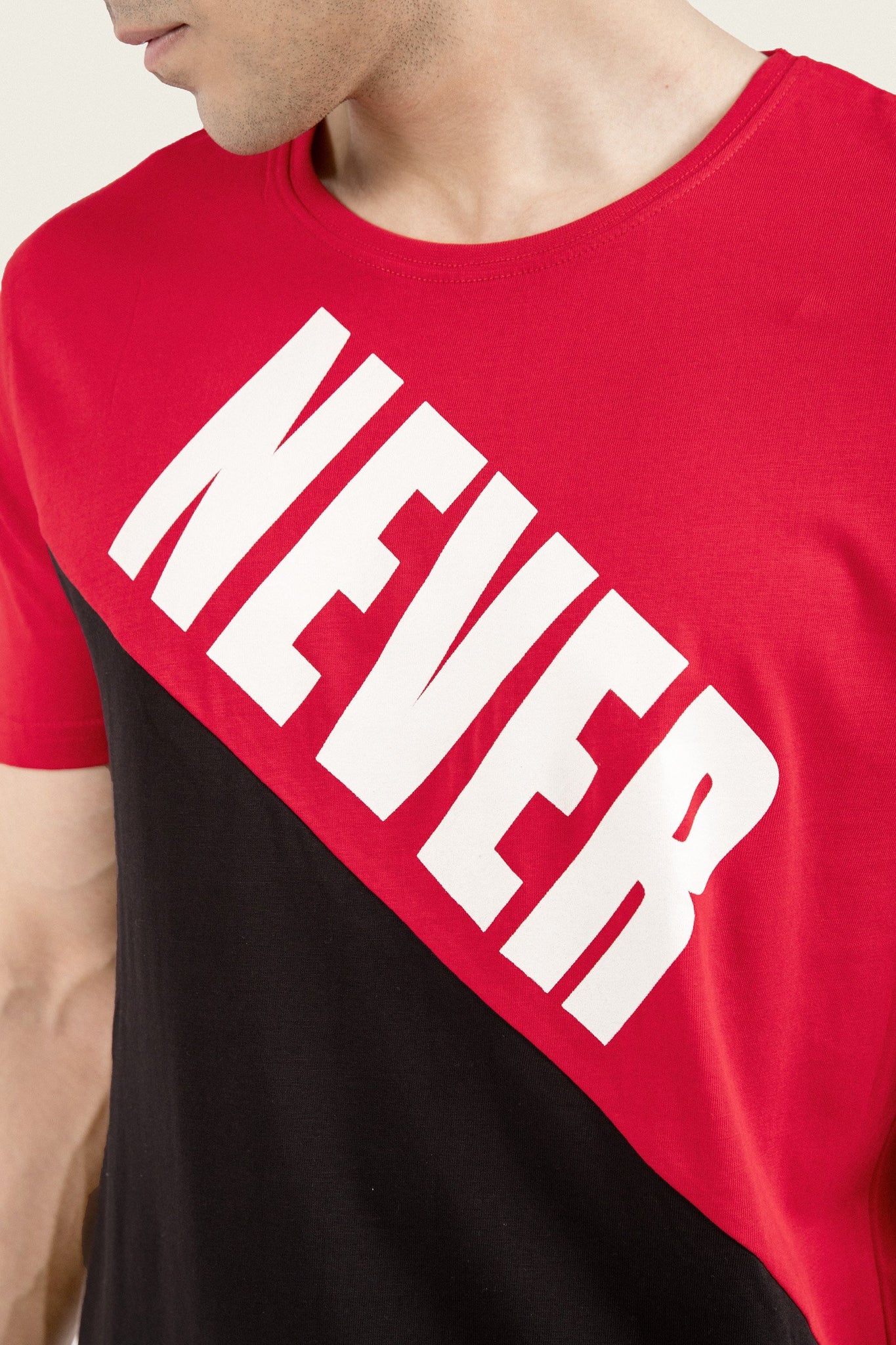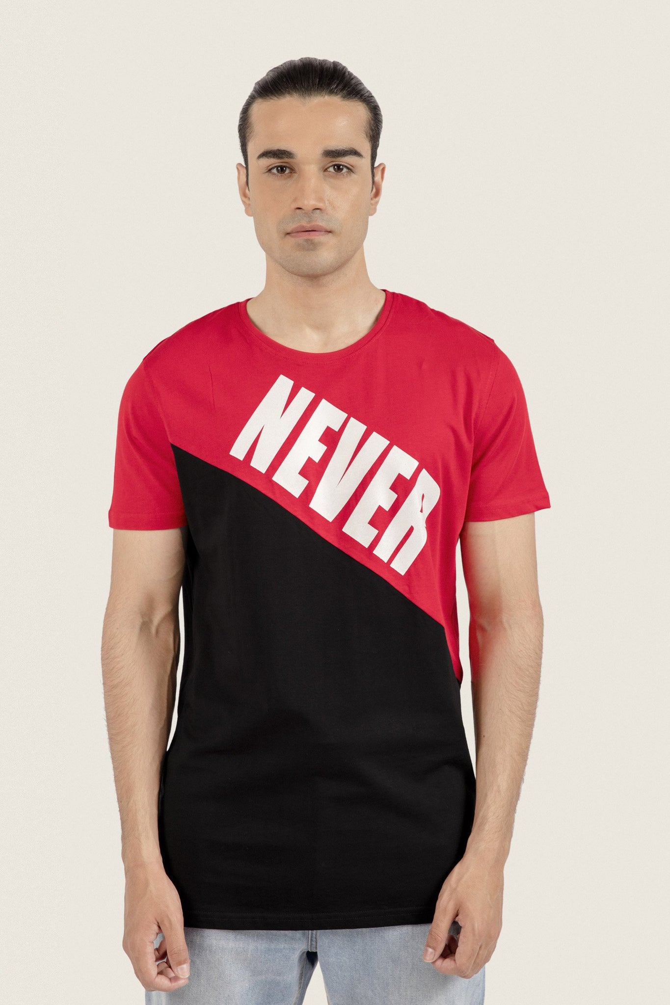 Half sleeve t-shirt with round neck, dual colored and never look back printed design