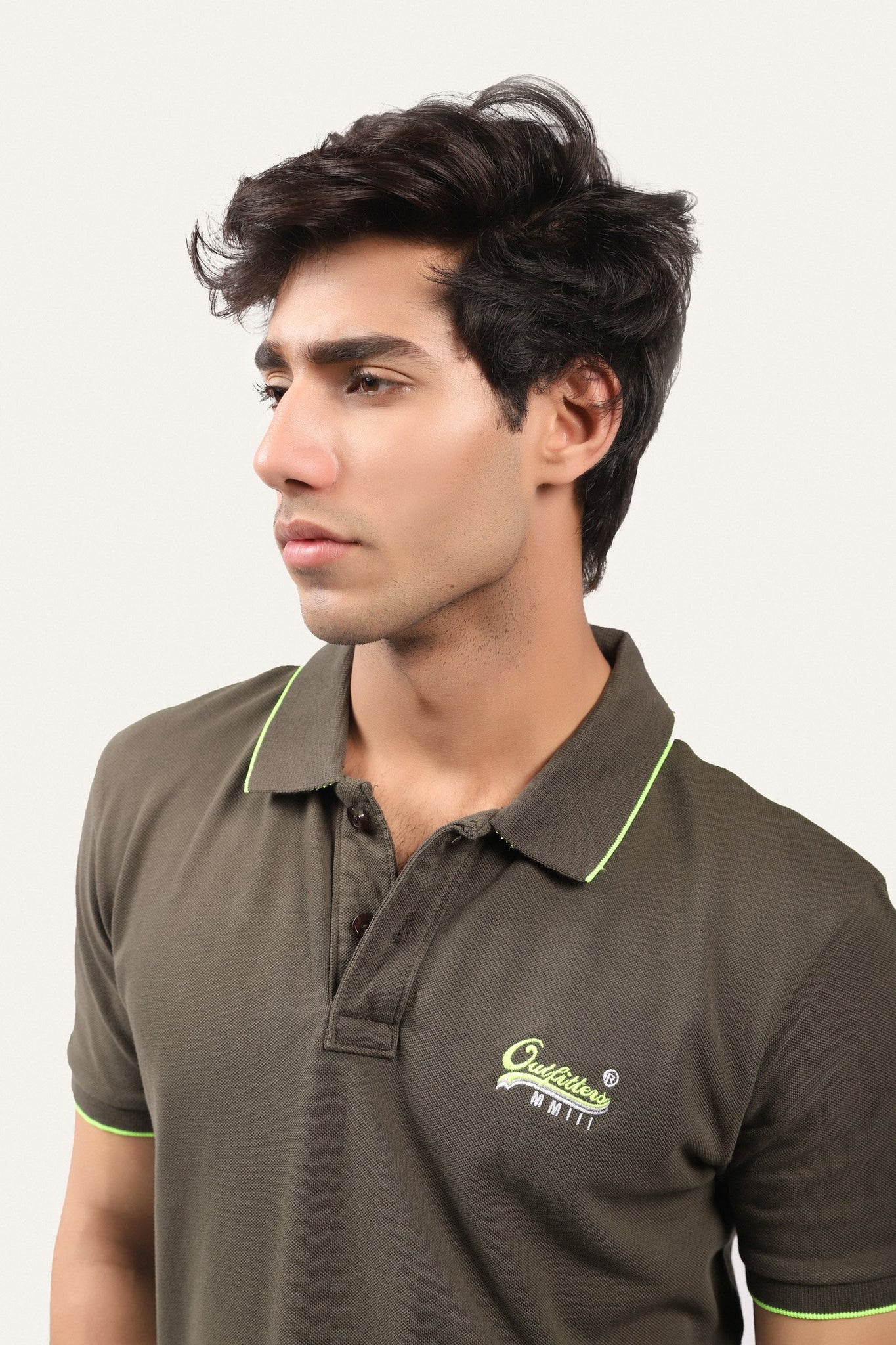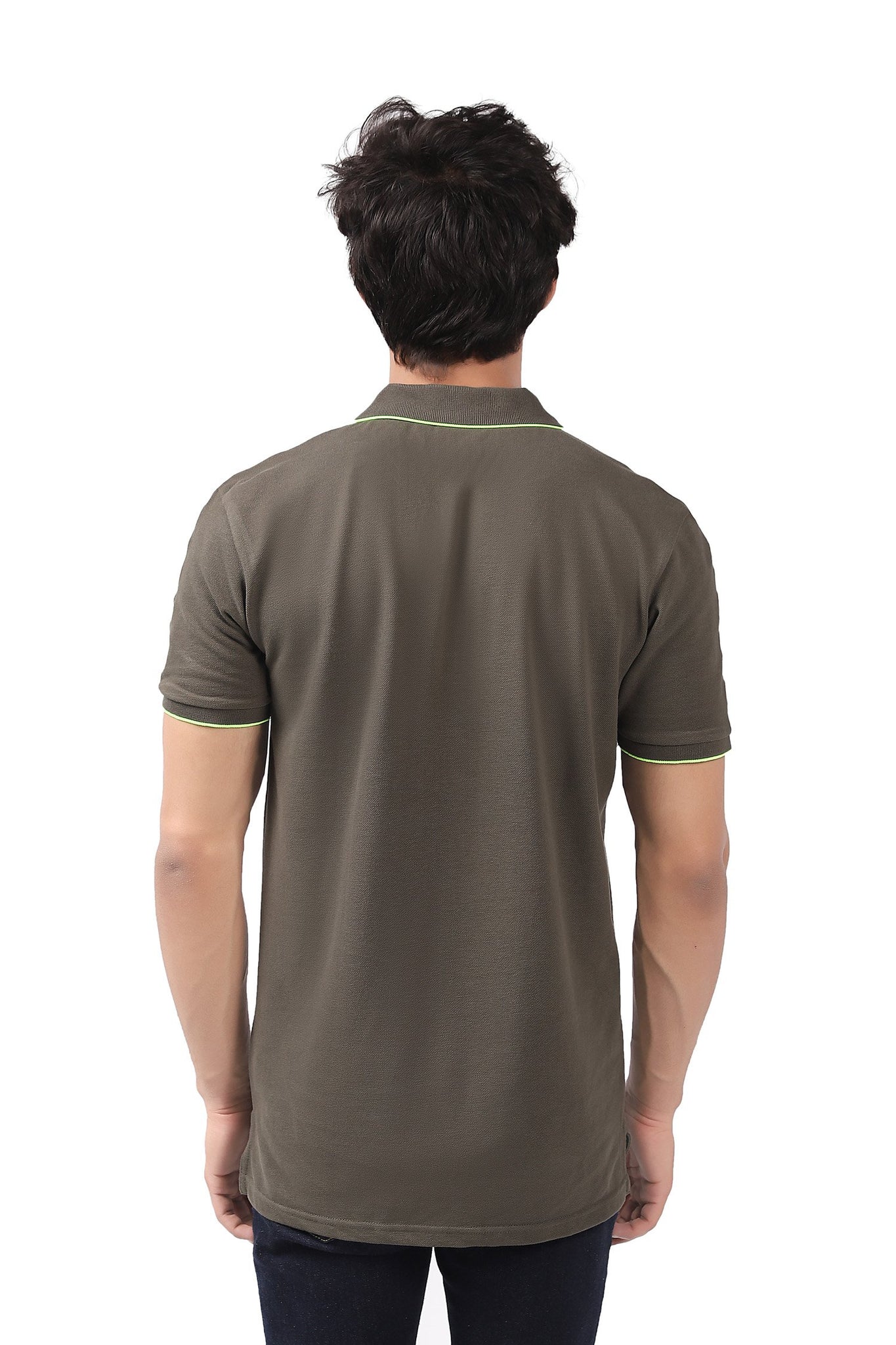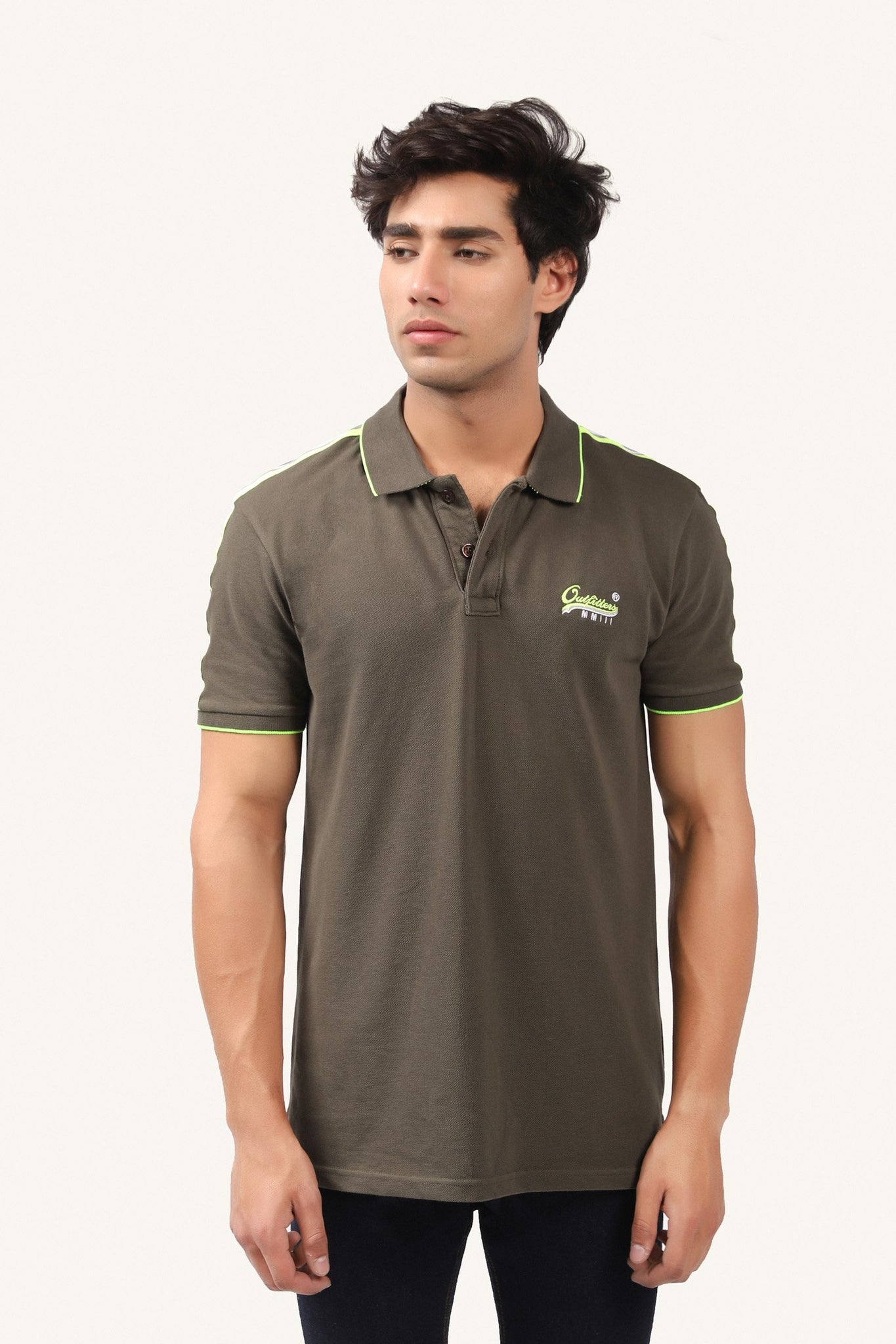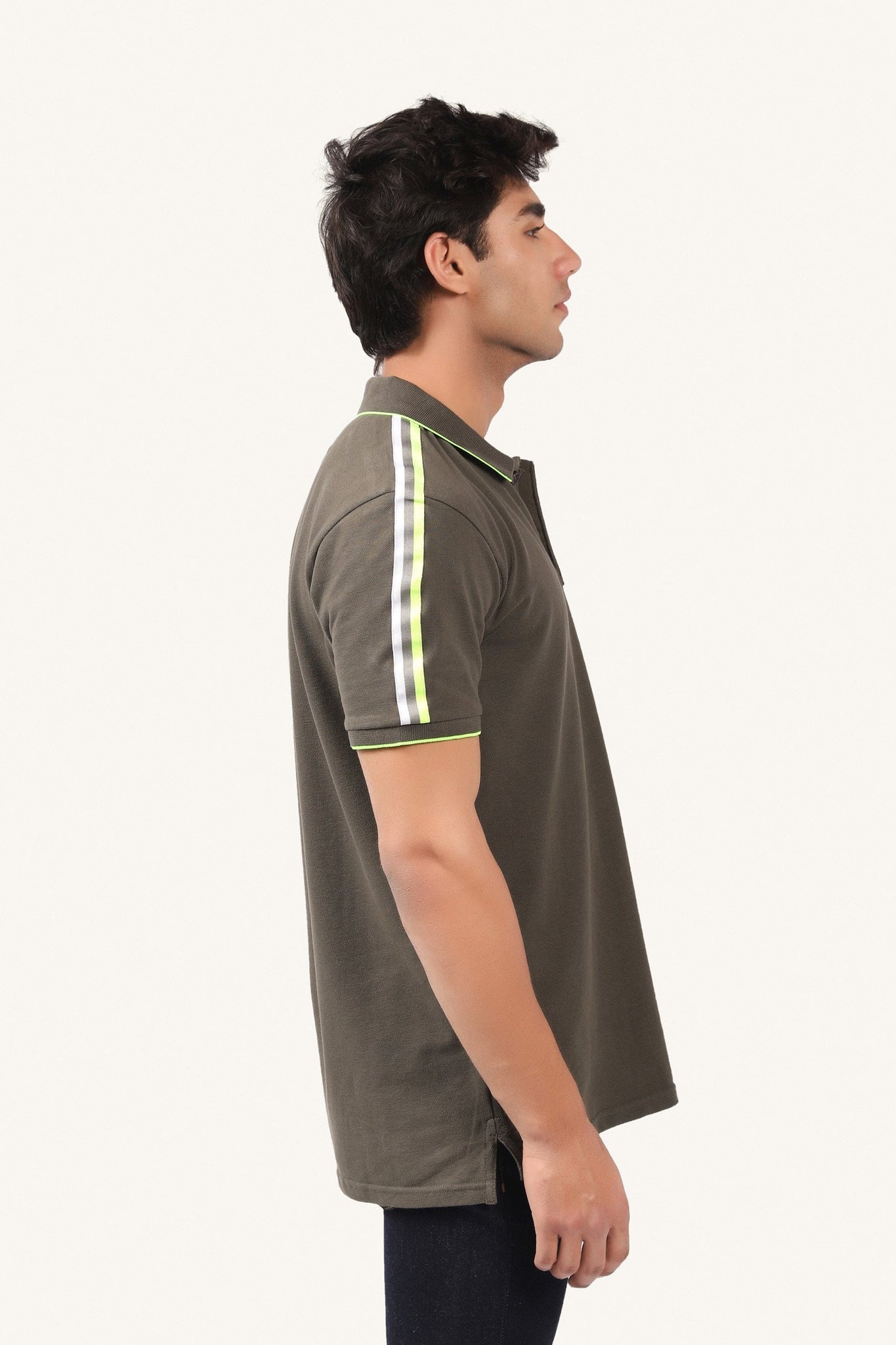 Short-sleeved shirt with polo-style neck design, emblem on chest and neon striped on sleeves