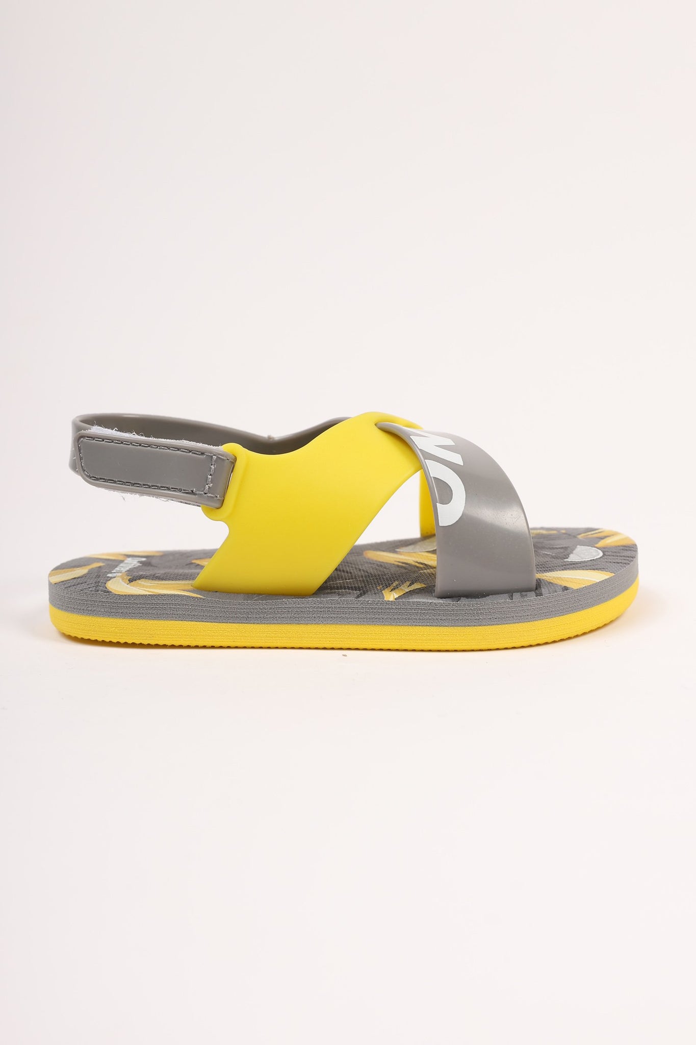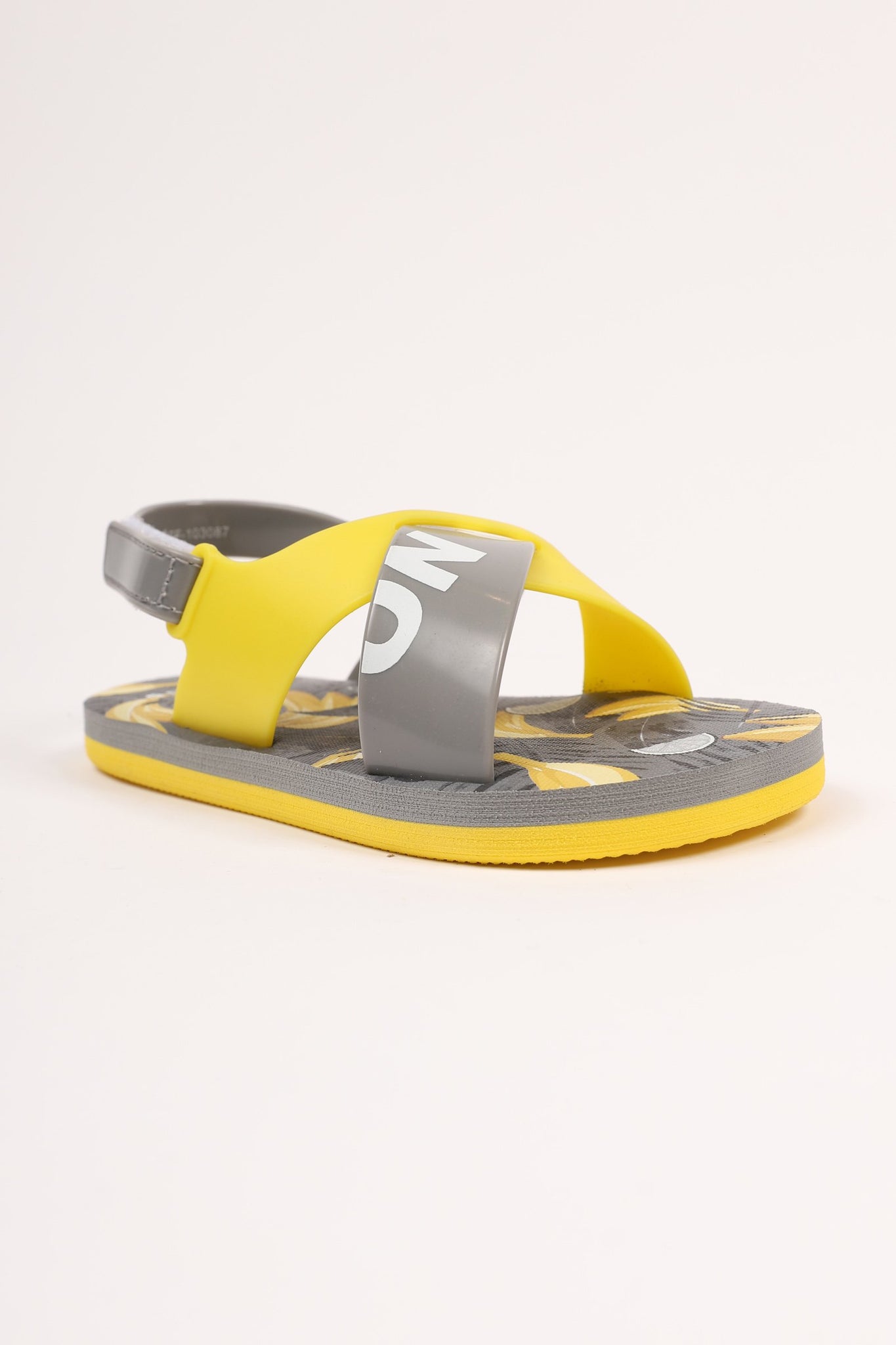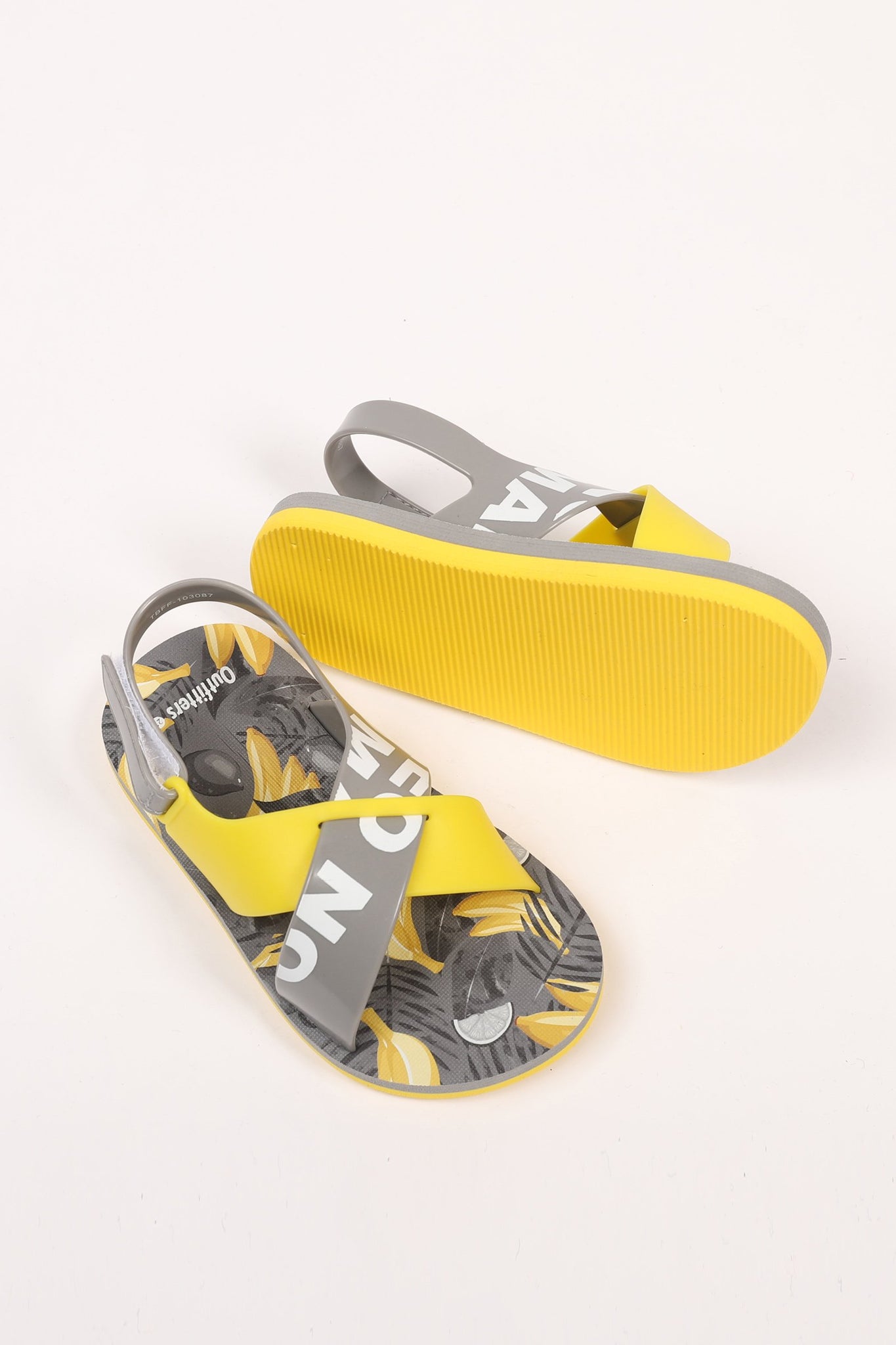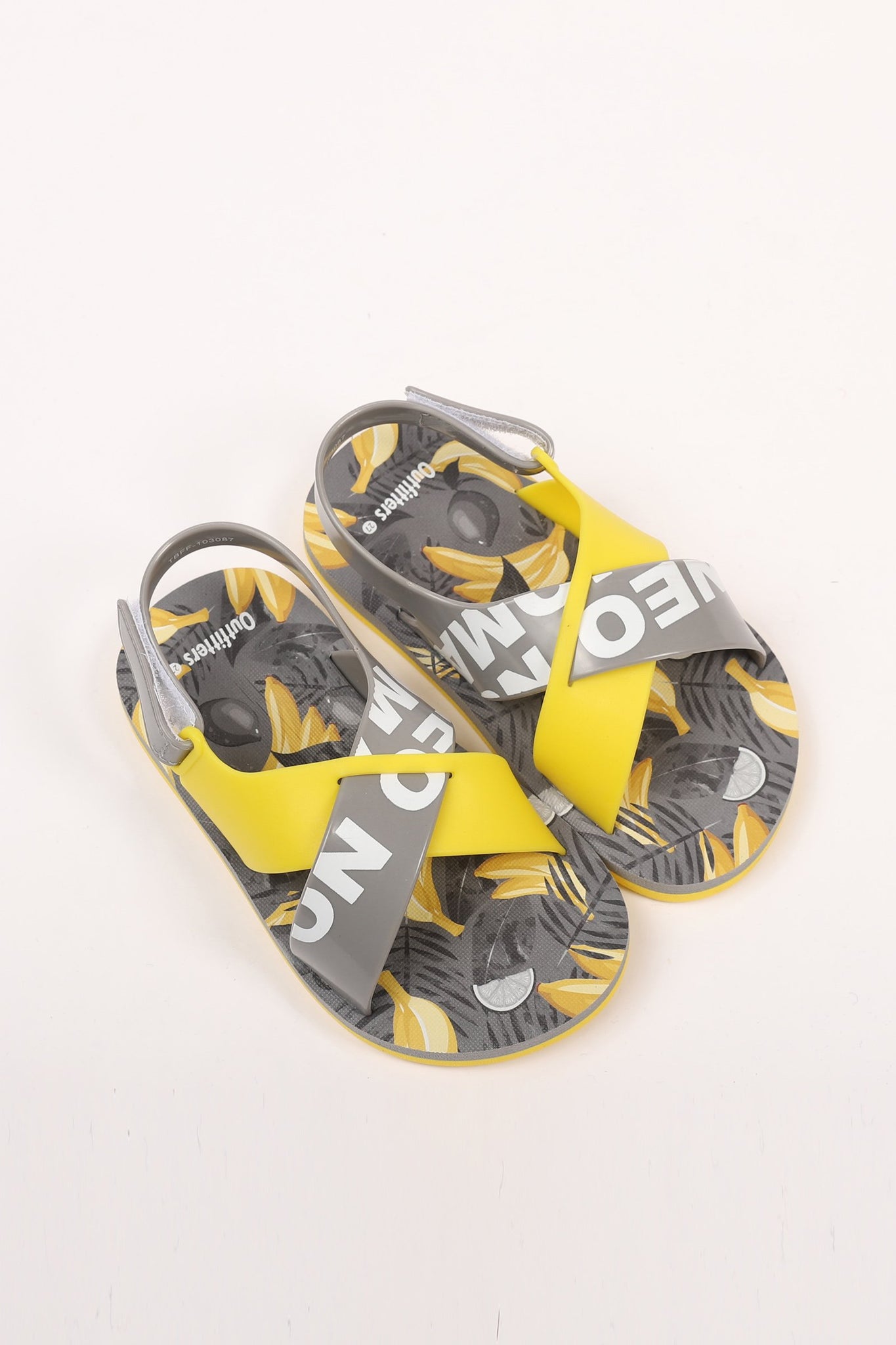 Banana print footbed sandals with broad straps and adjustable velcro fastening