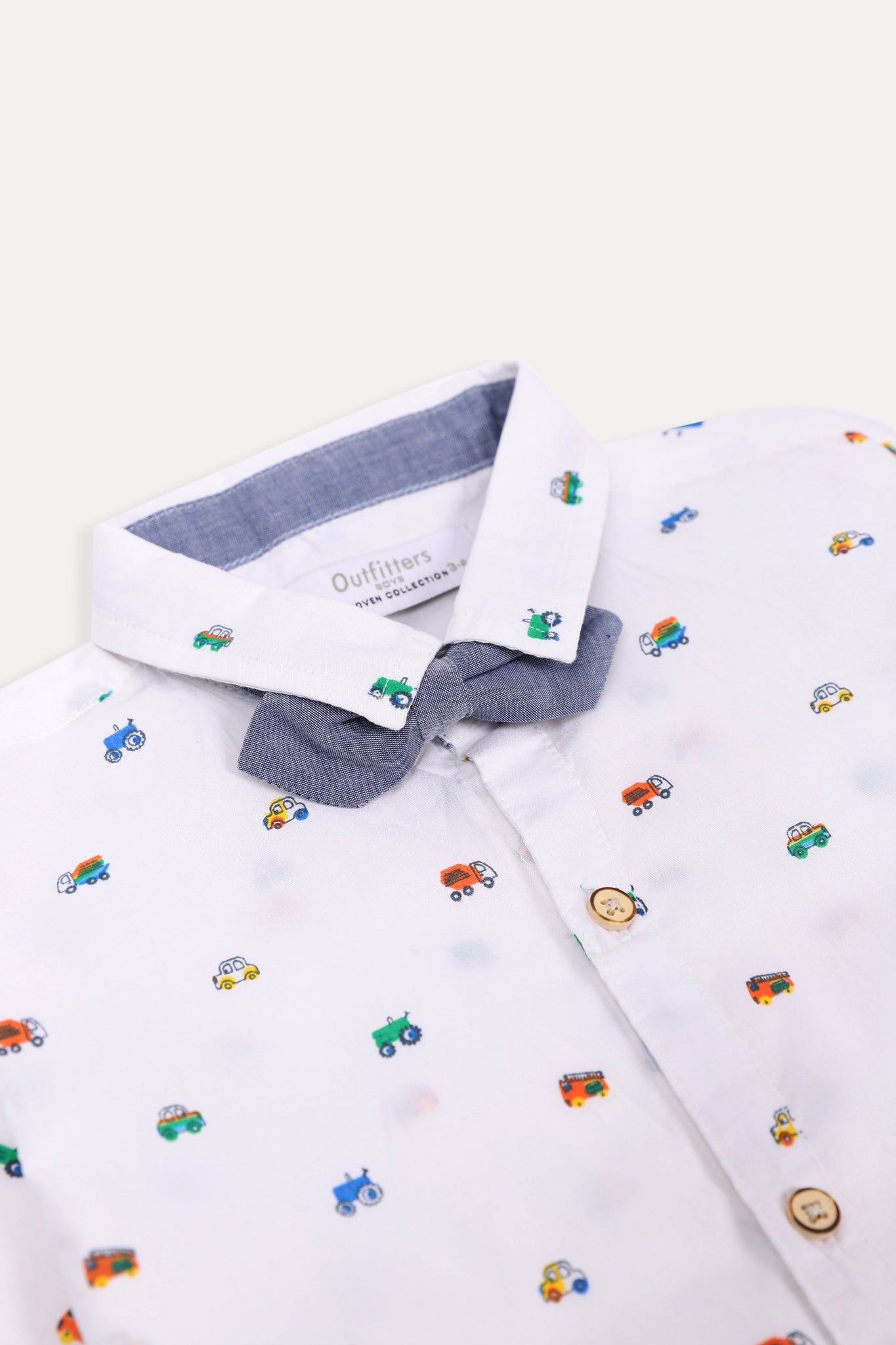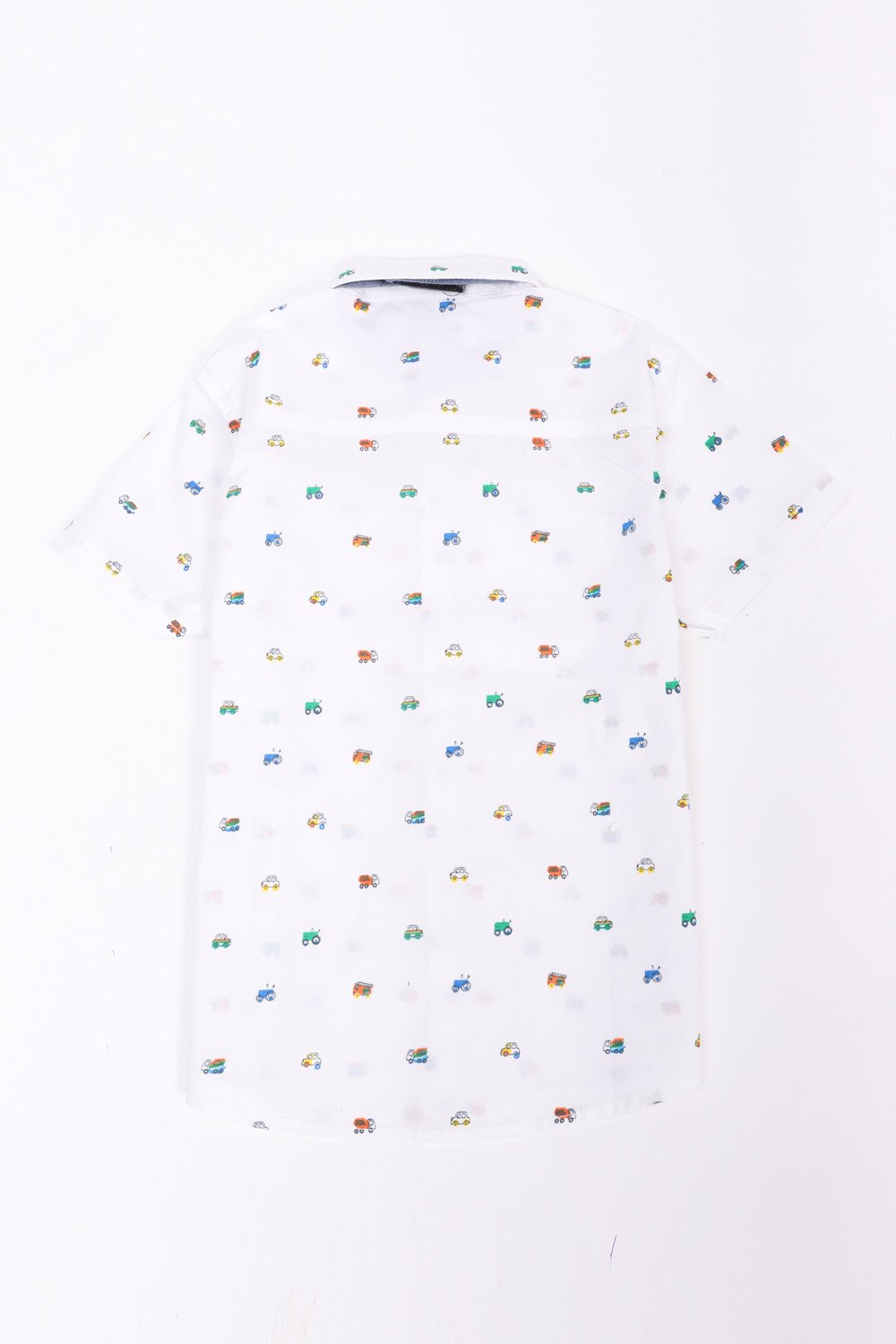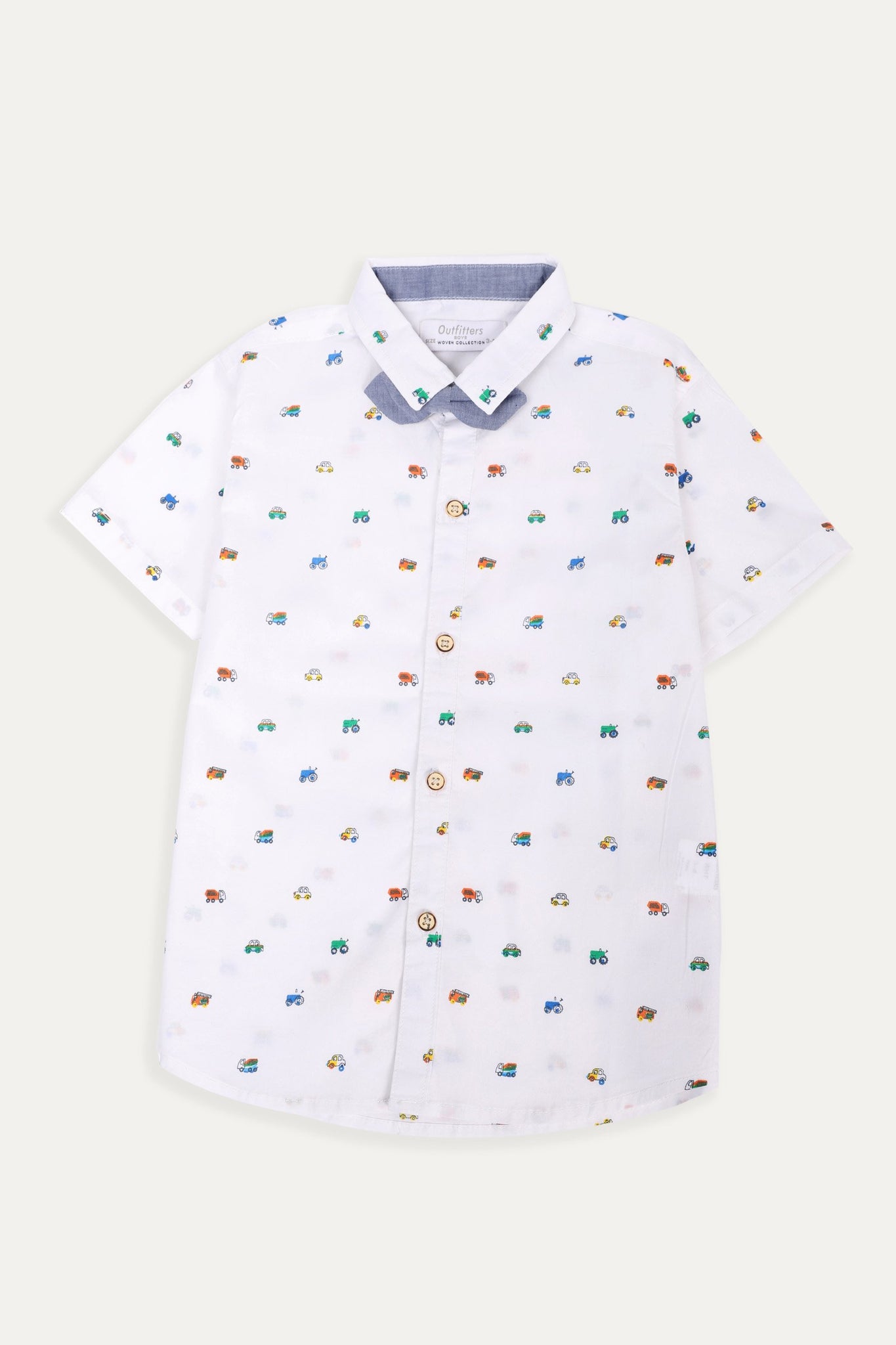 Half sleeve shirt with multicolor vehicle print, classic collar, button down front and bow details