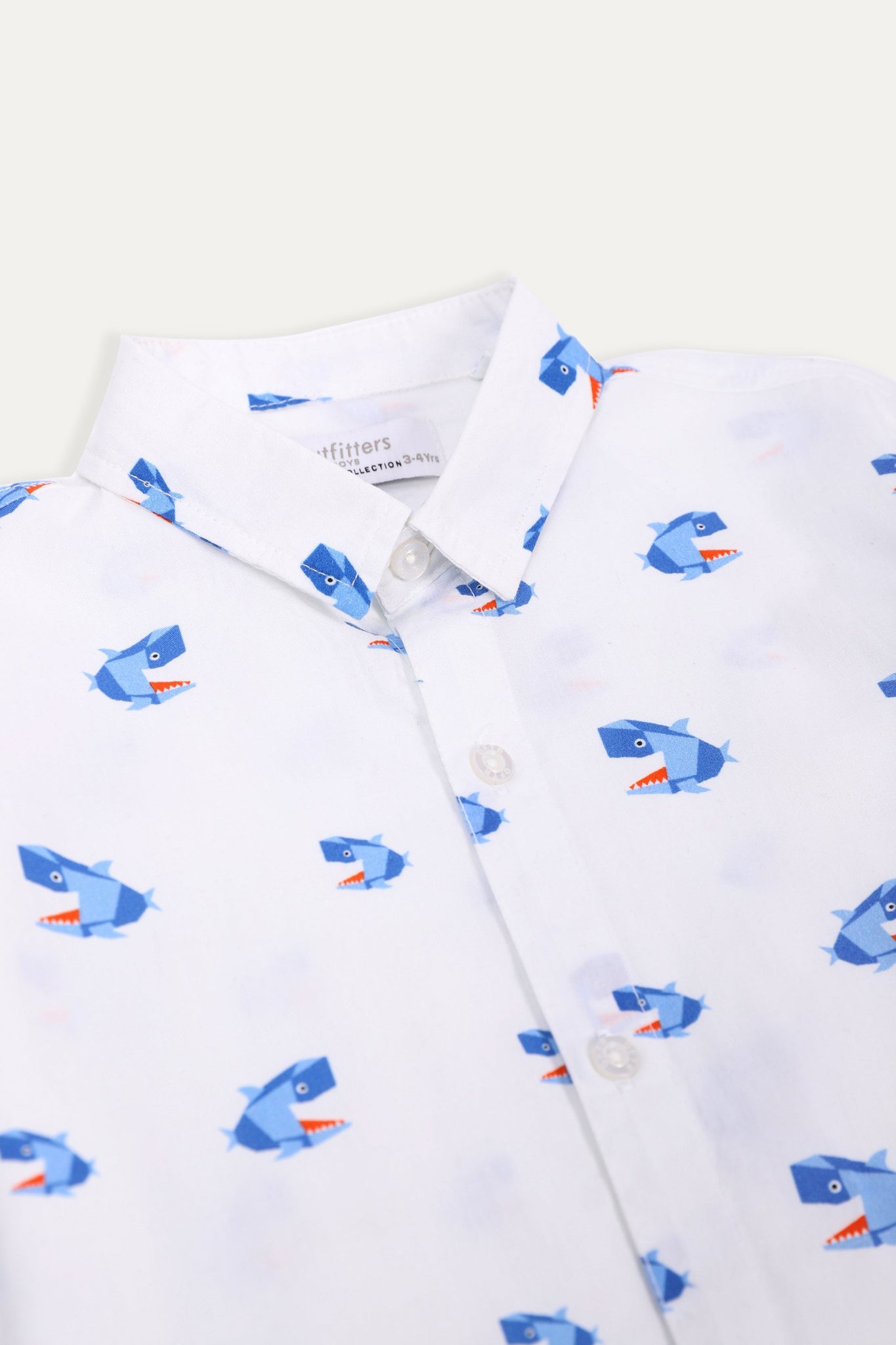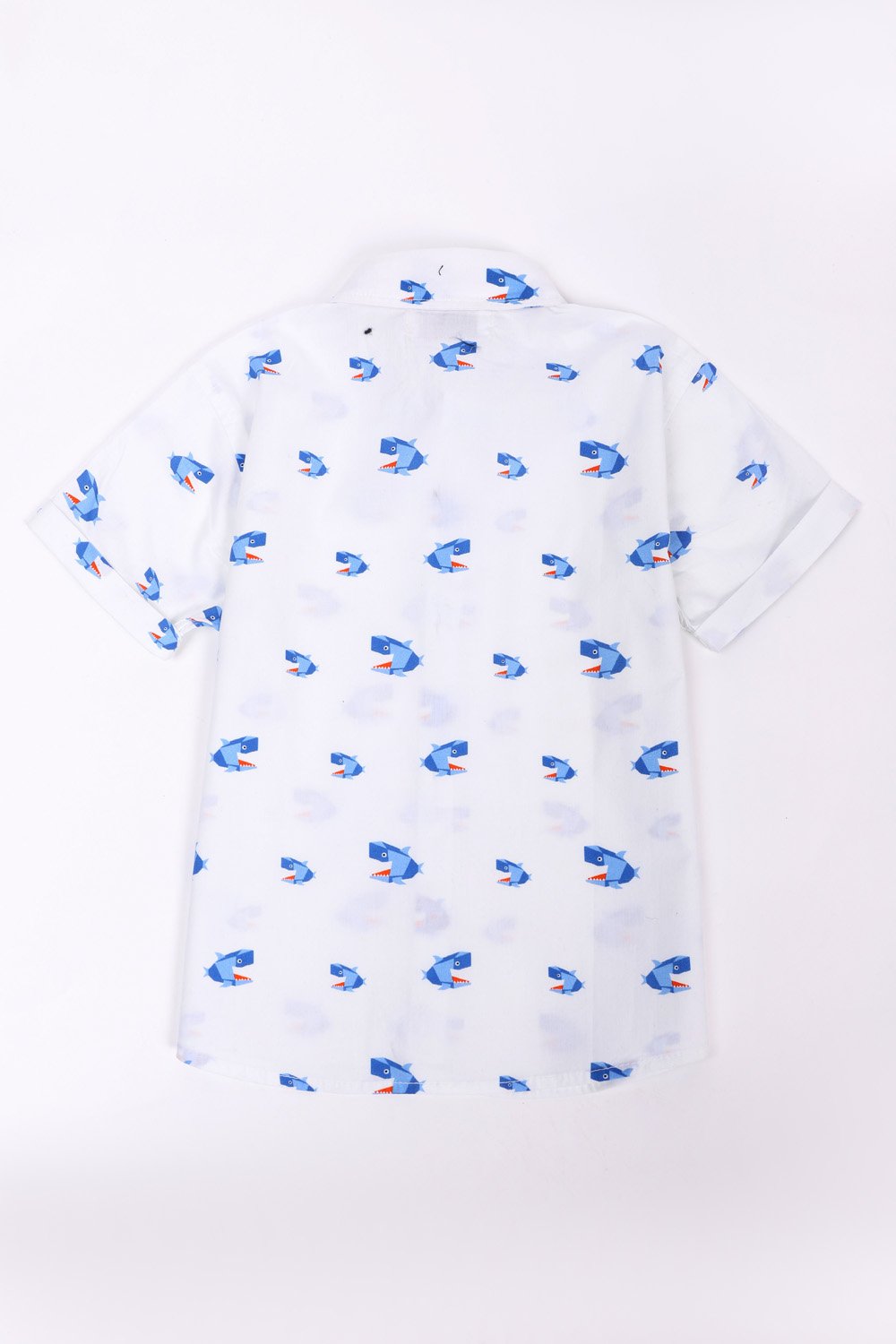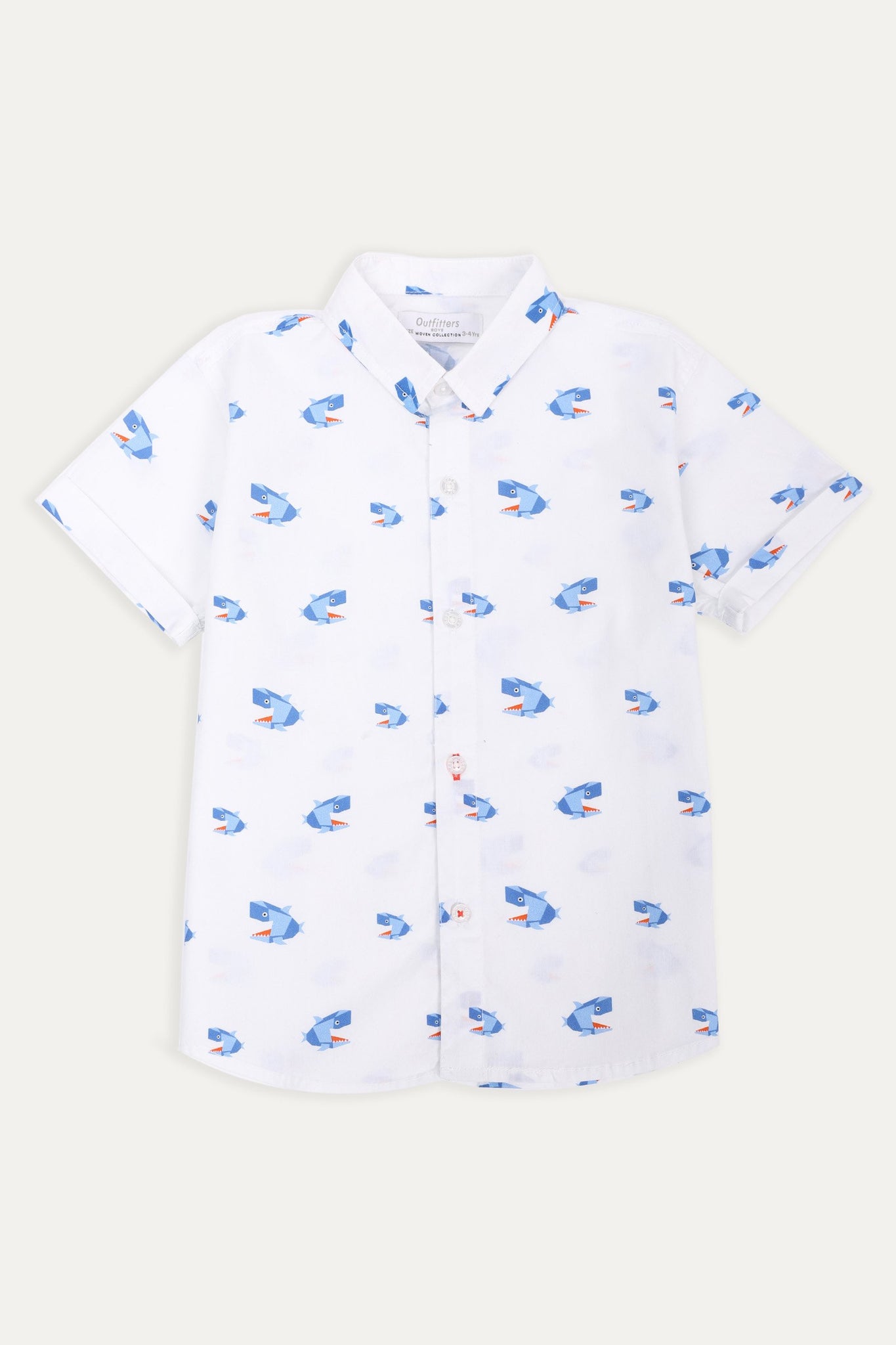 Classic collar shirt featuring half sleeves, button up front and origami shark running print on front