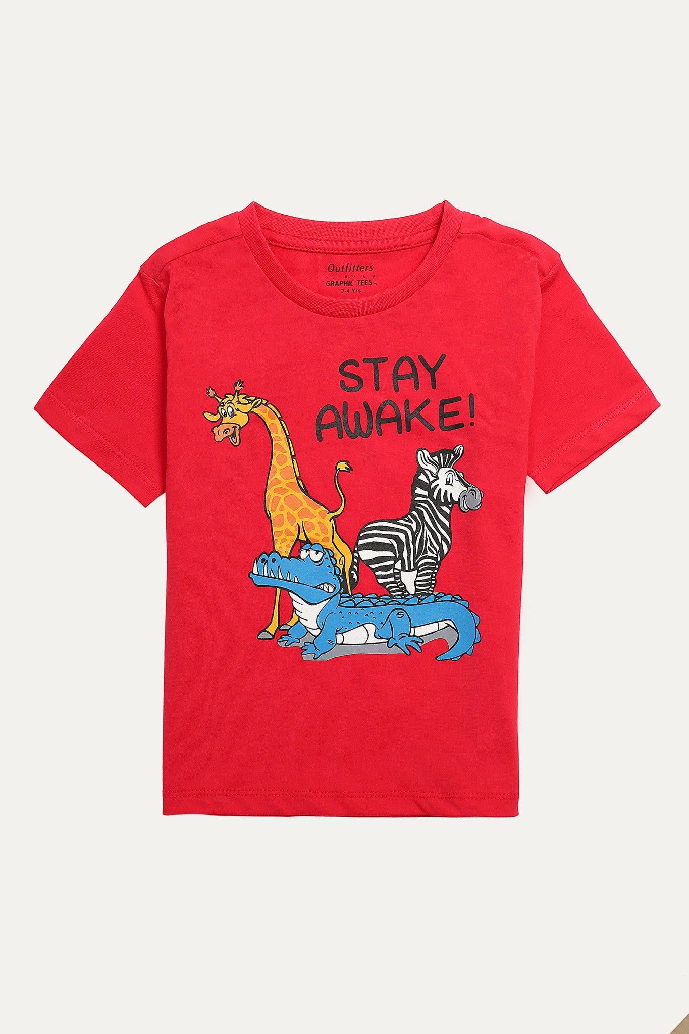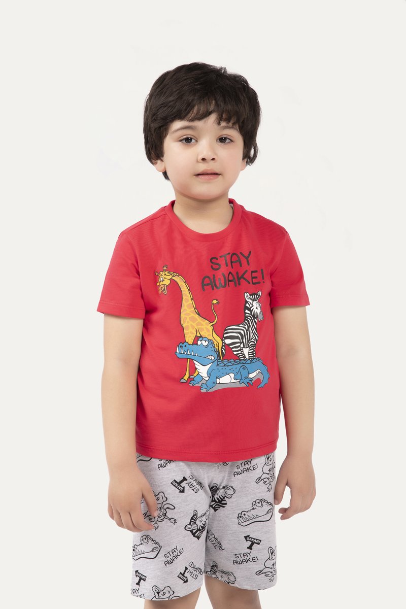 Night suit featuring round neck shirt with animal print on front and shorts with elastic waist