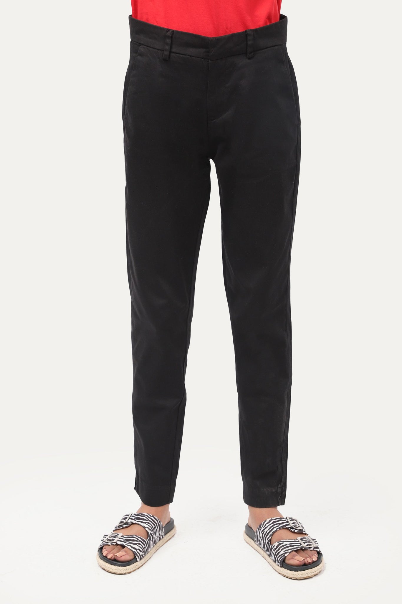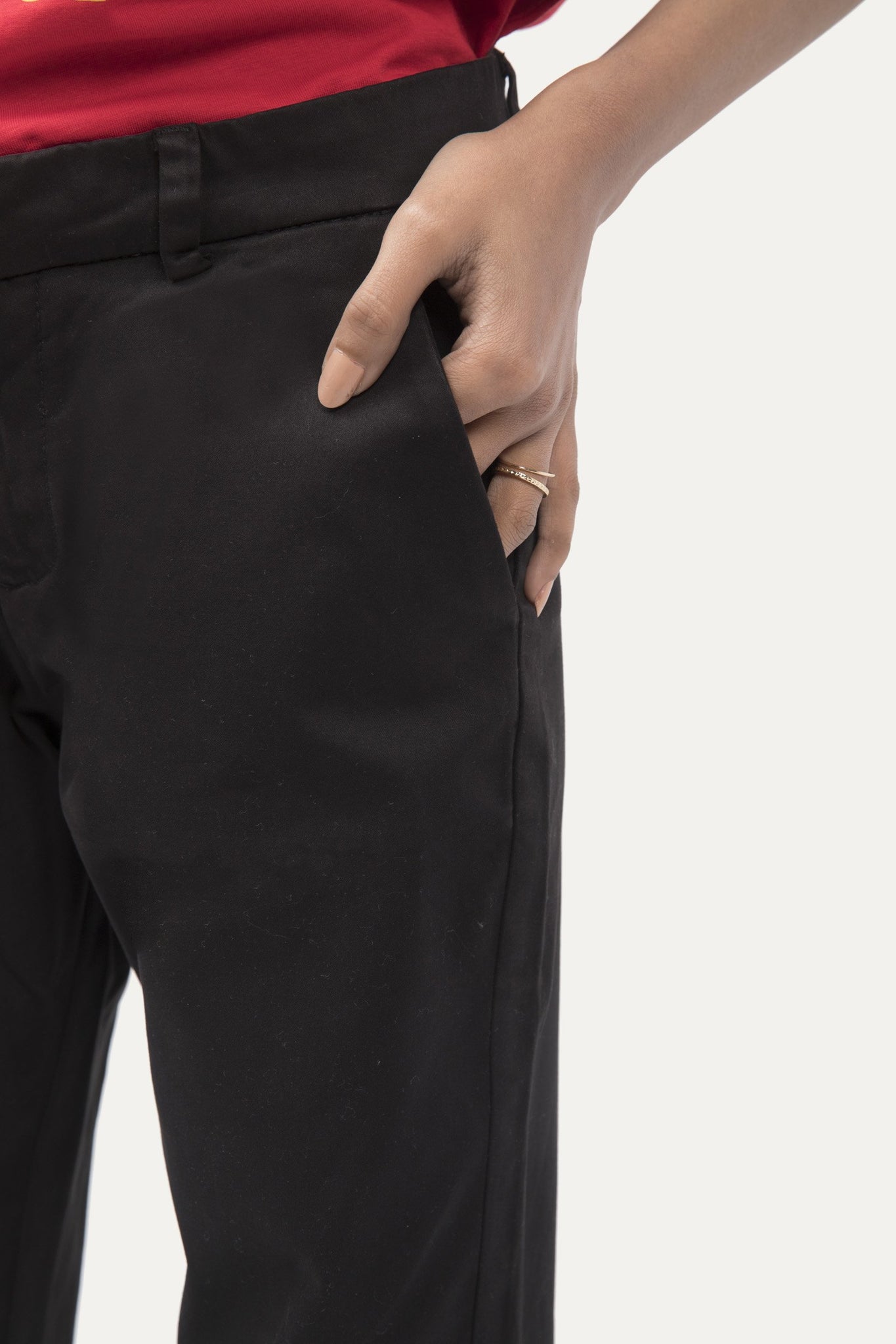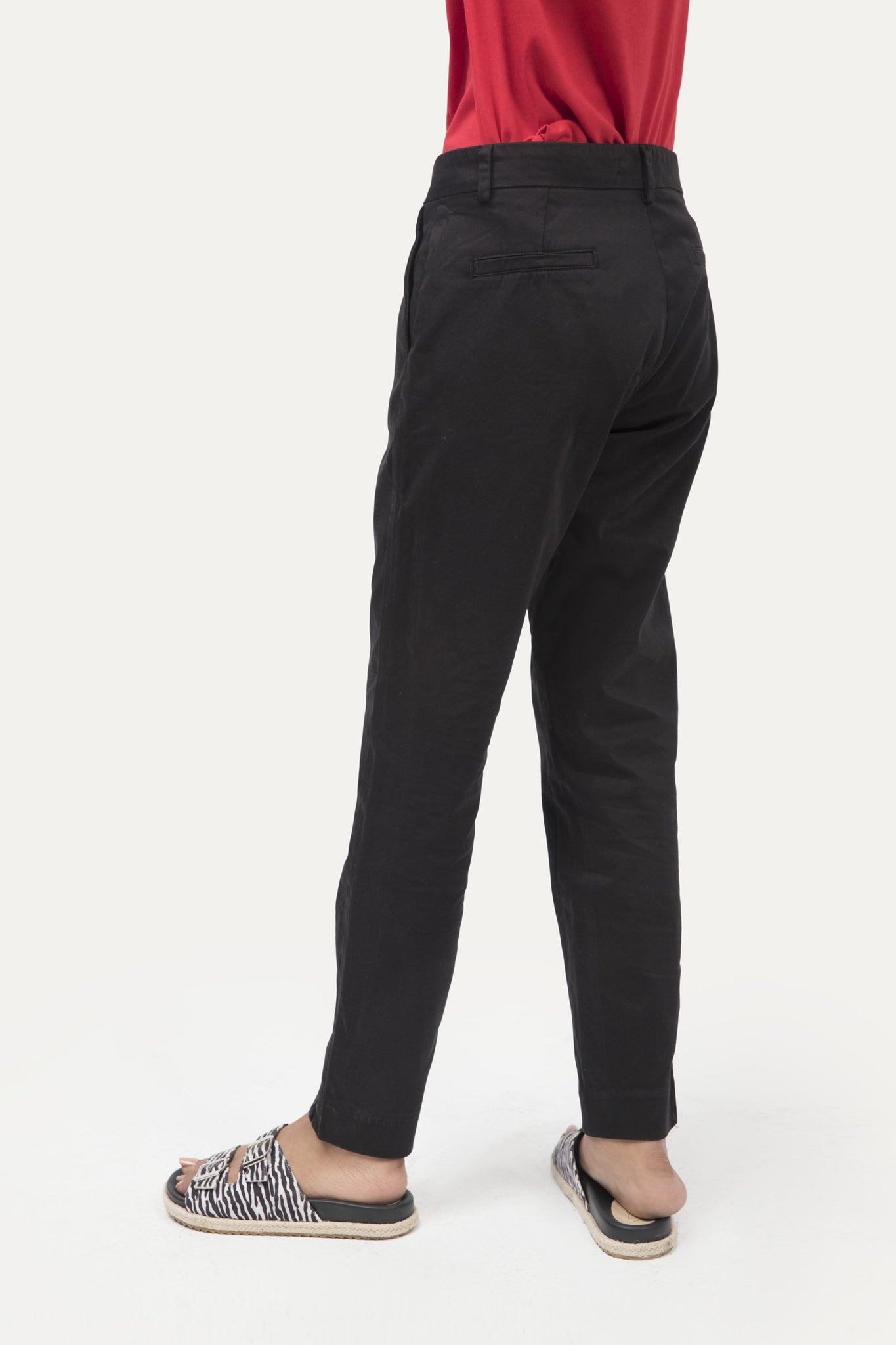 Basic pant with four pockets, slit design at hem, zip fly and top hook fastening