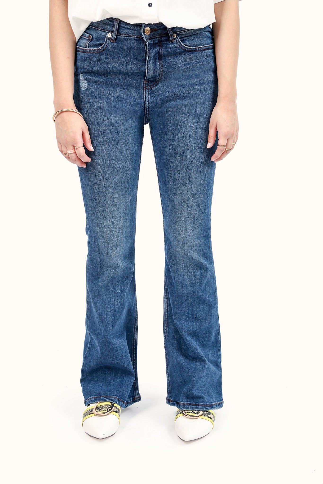 Denim jeans featuring bell bottom, ripped design, belt loops, zip fly and top button fastening