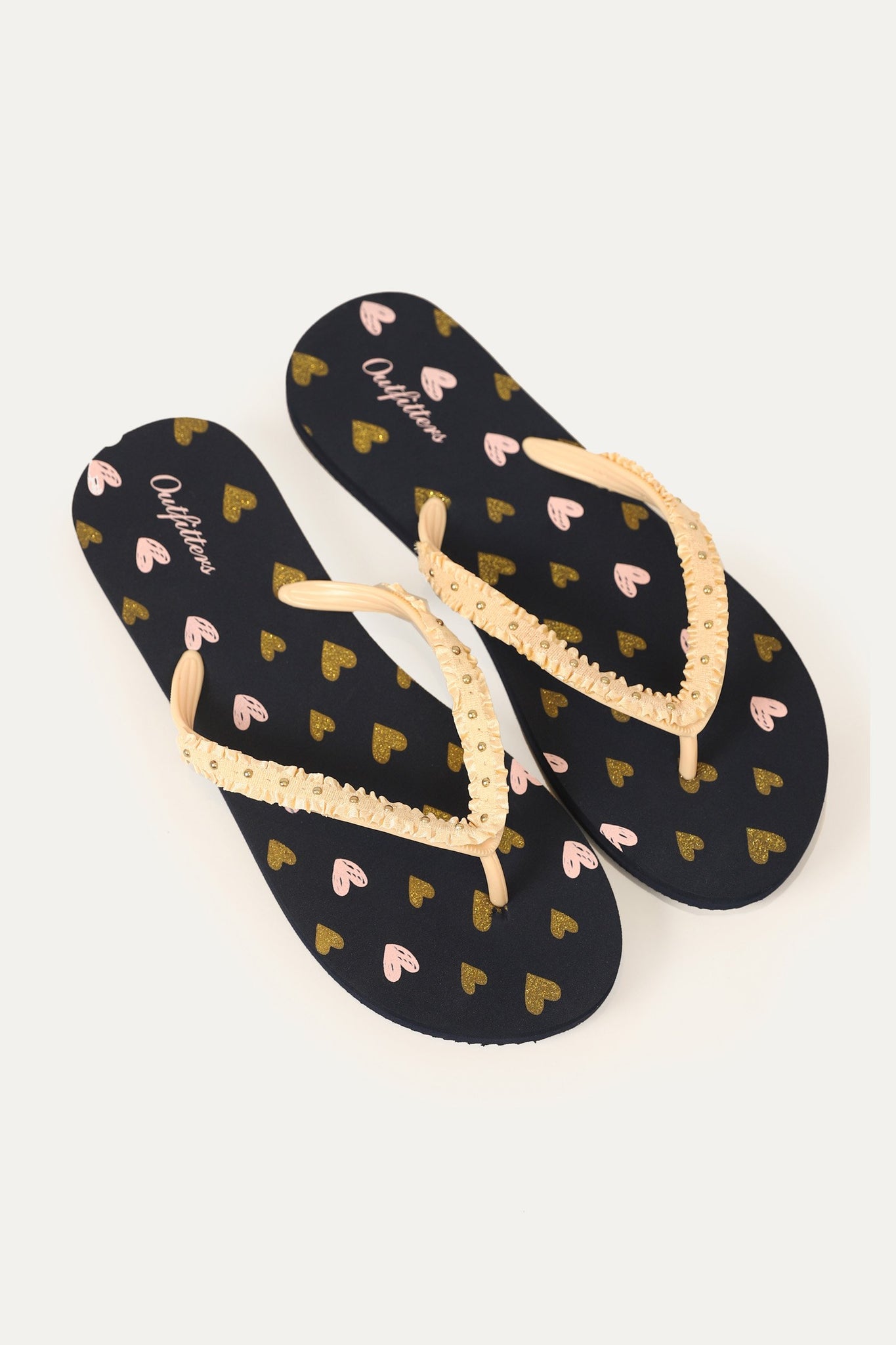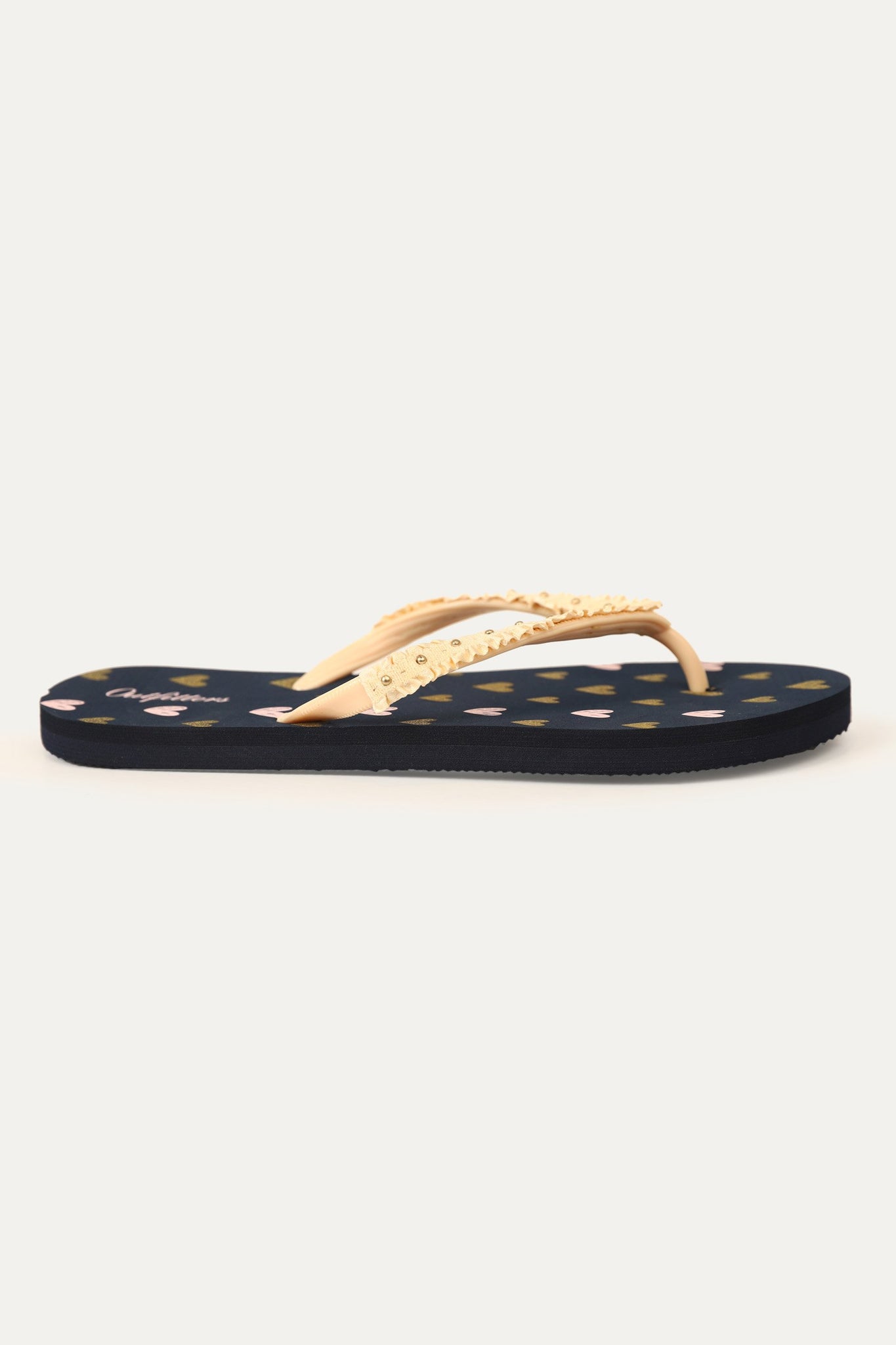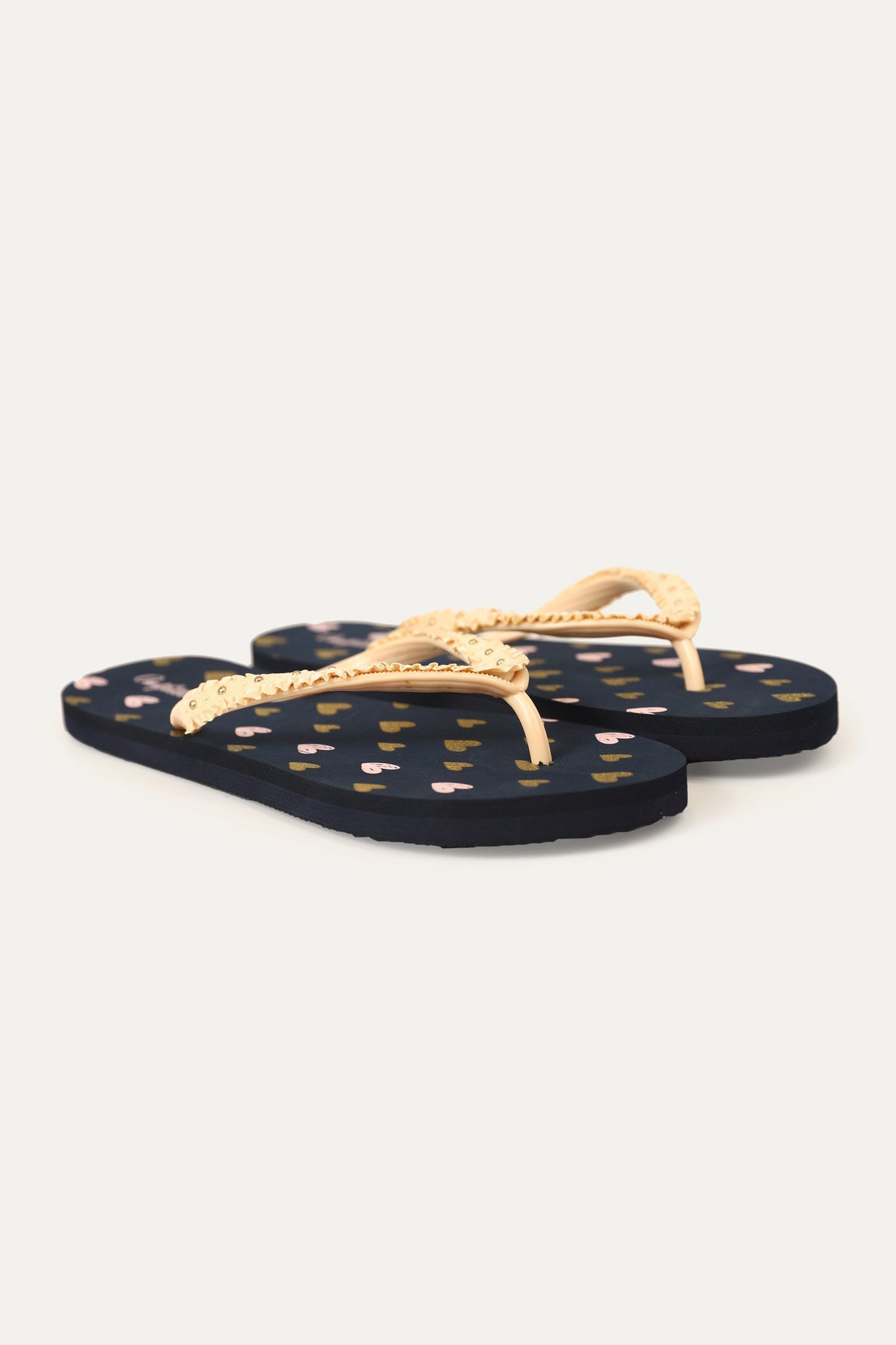 Rubber strap flip flop with fabric frill detail on top and EVA sheet sole and Shiny hearts detail on insole