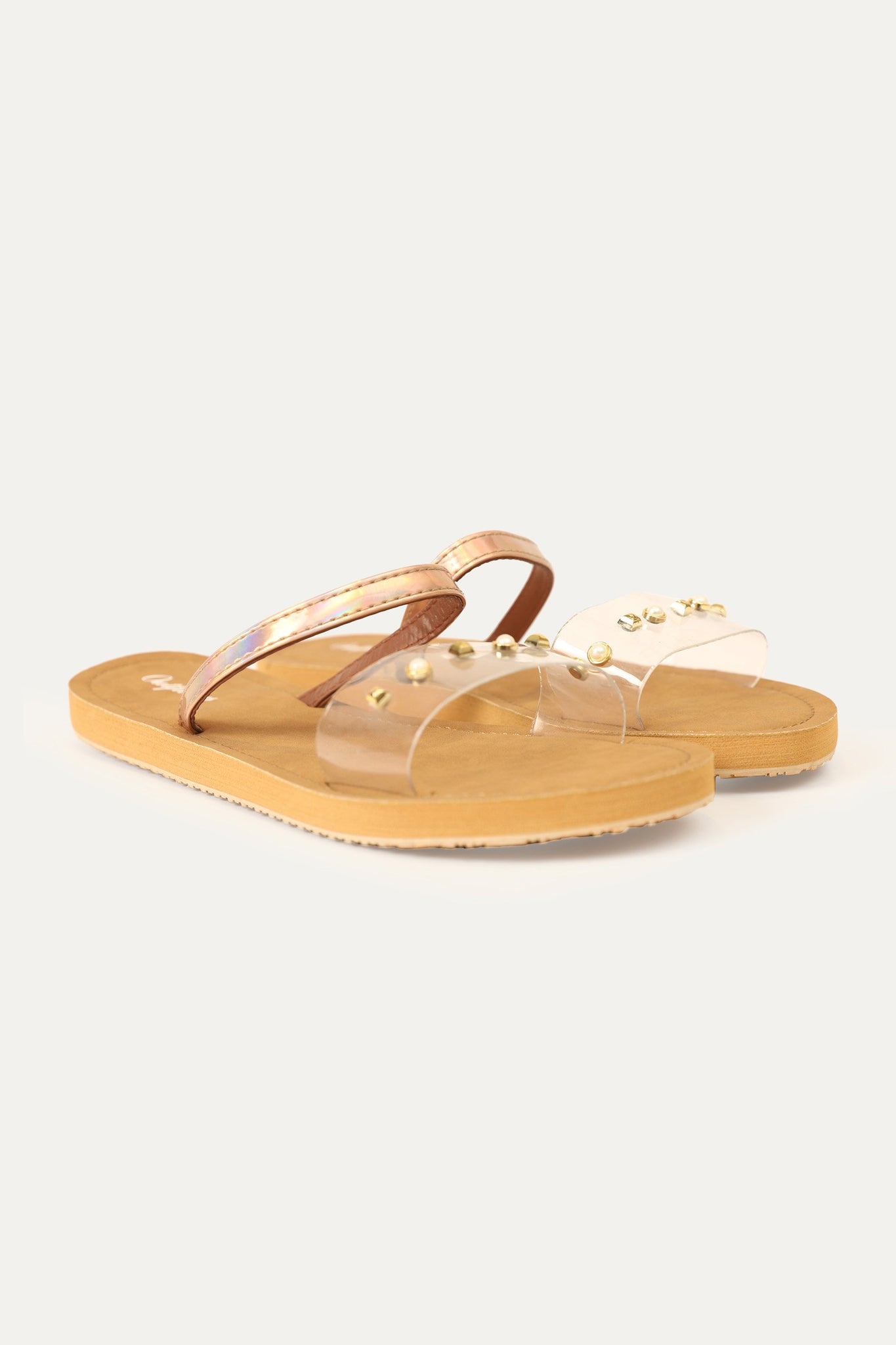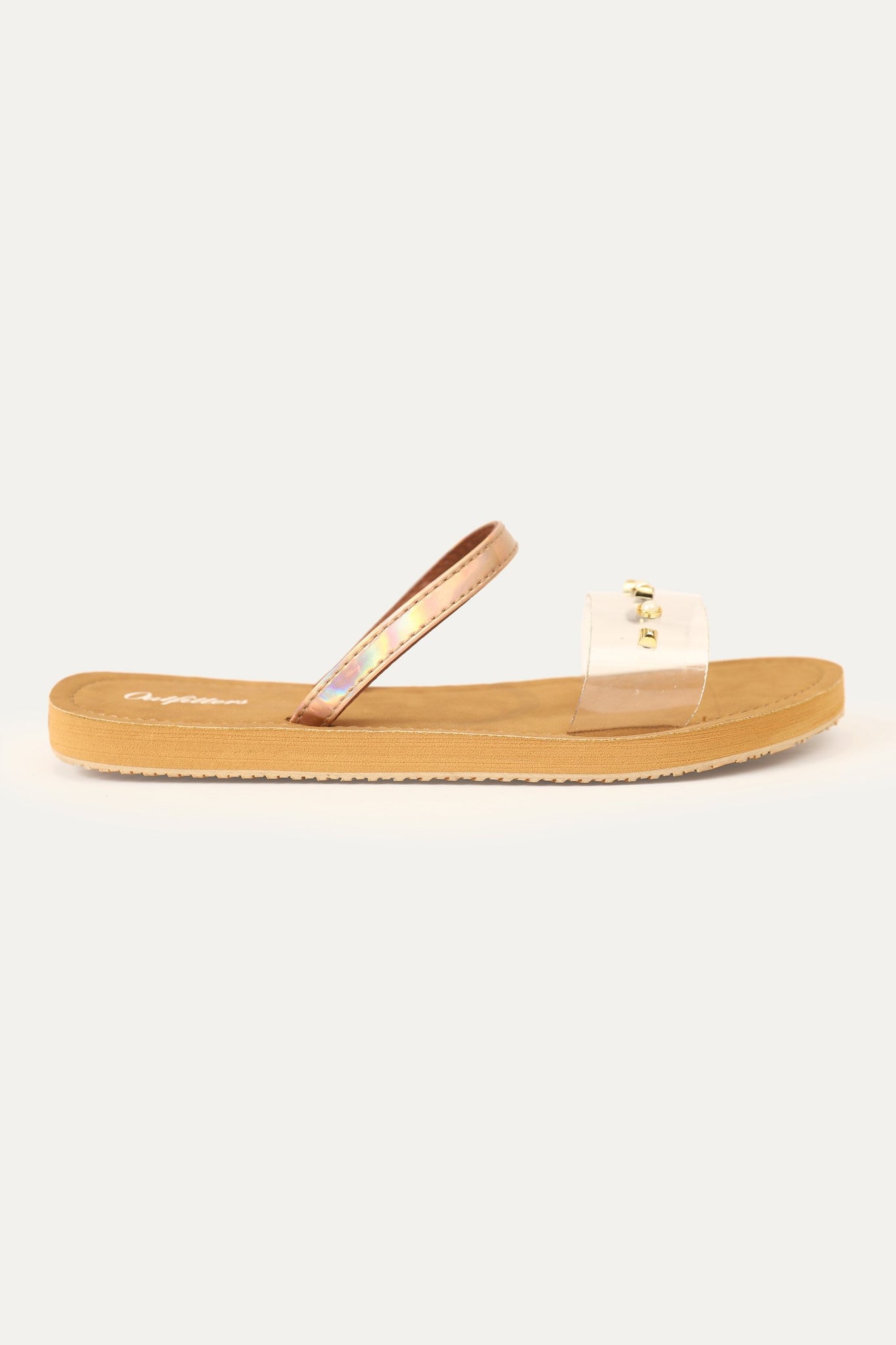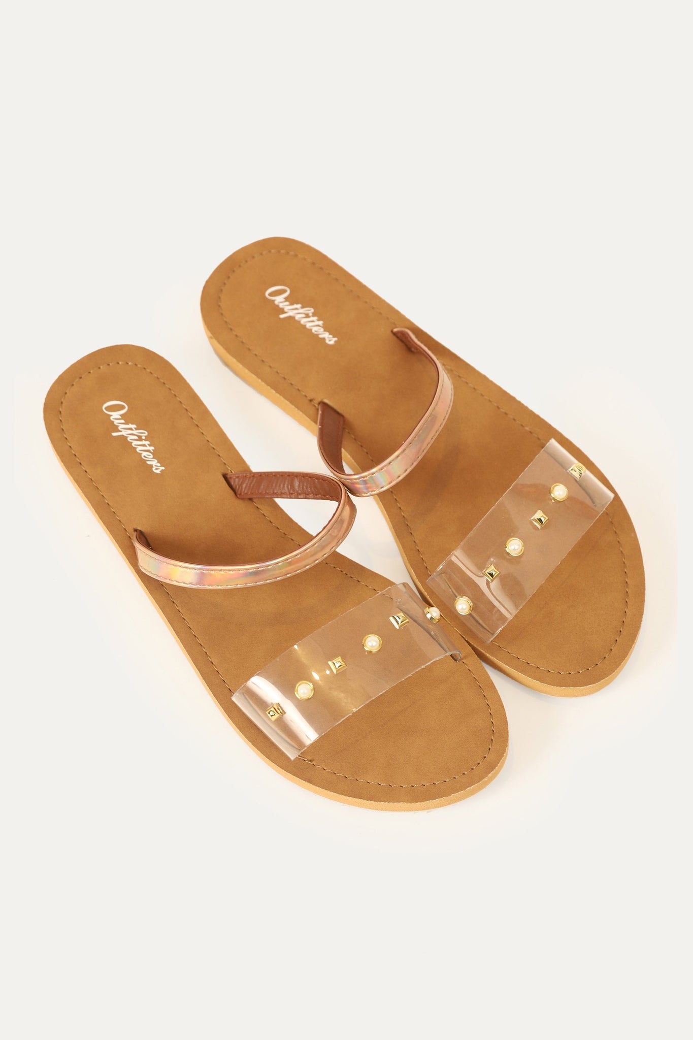 Two strap slide with front Rubber strap with pearl detail and back Shiny PU strap and brown Rubber sole