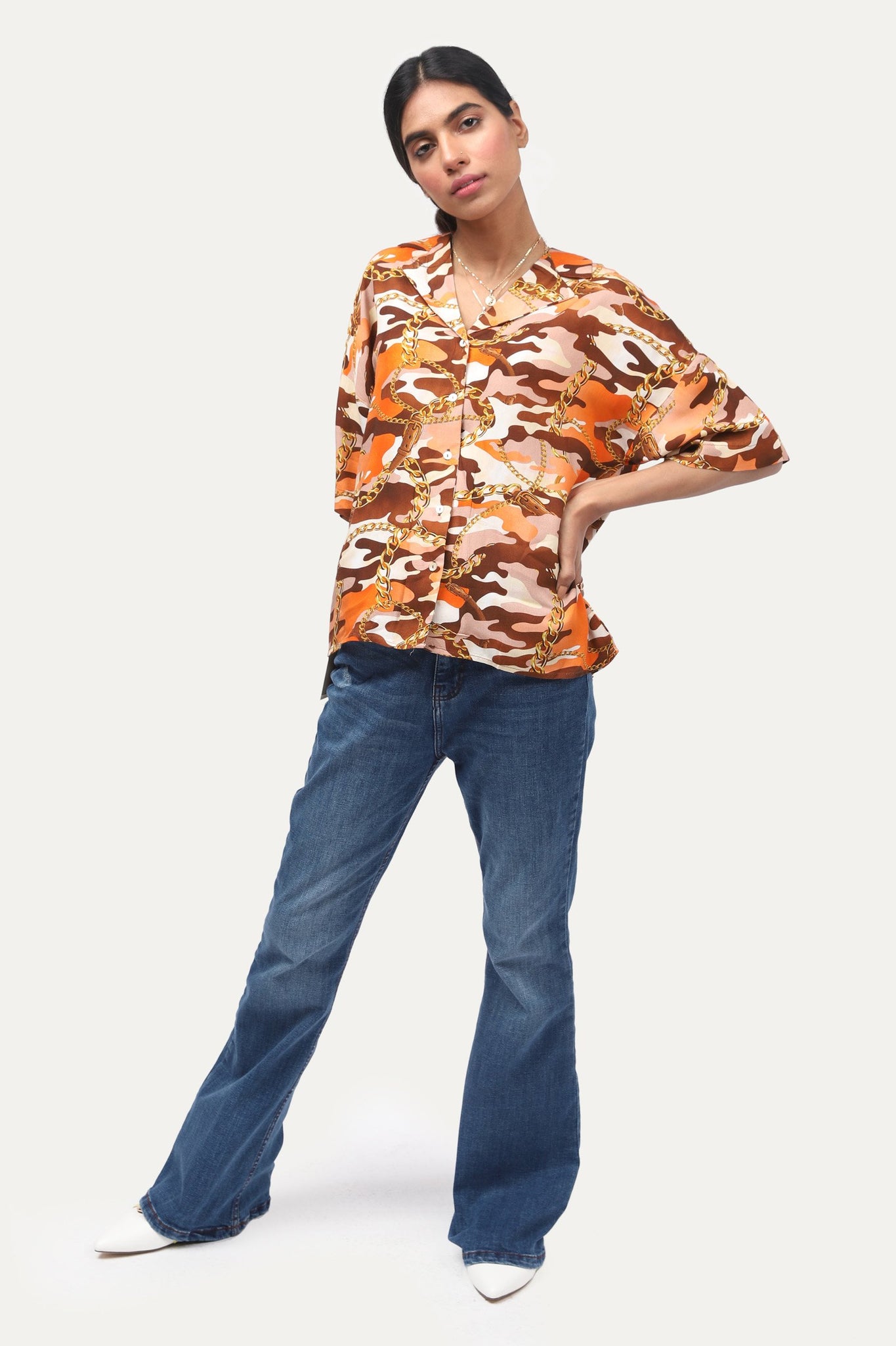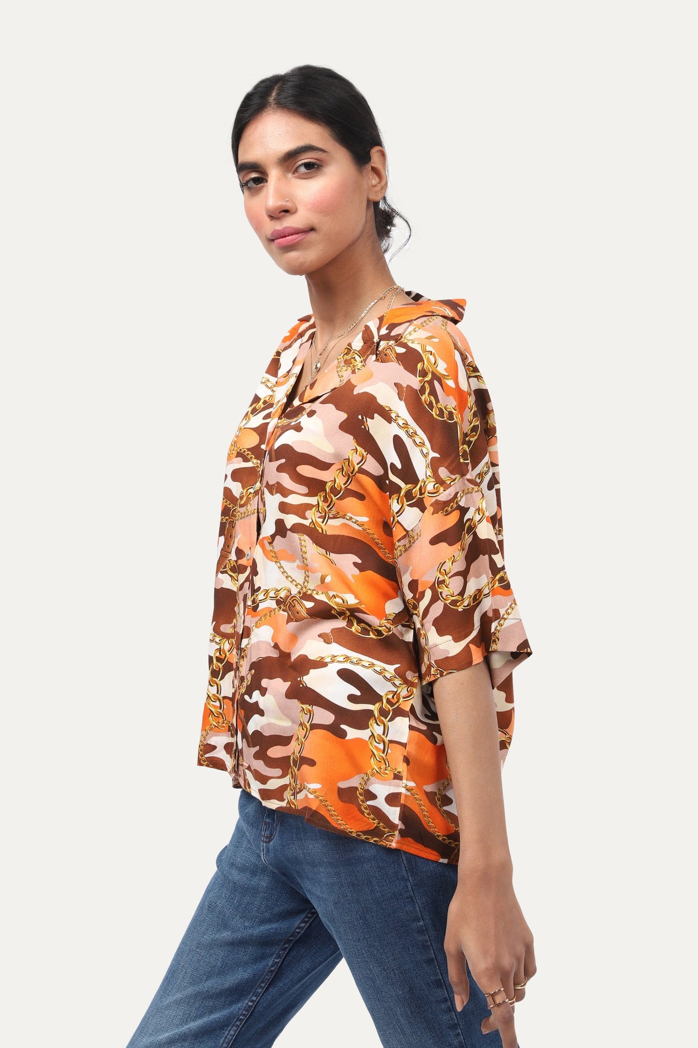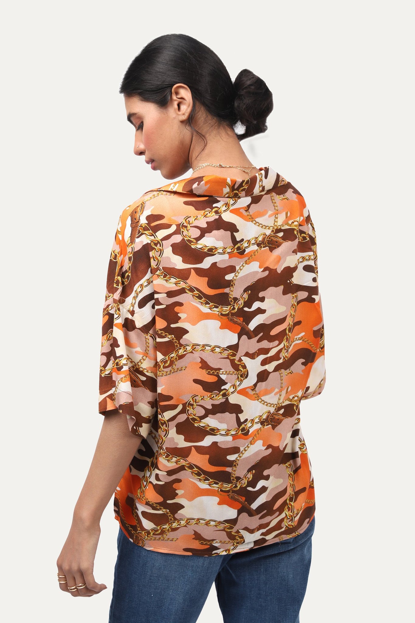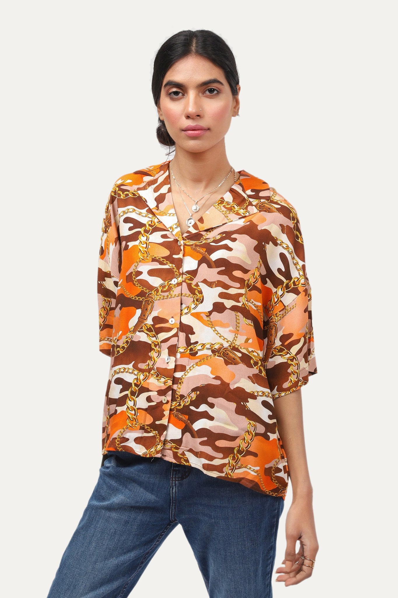 Shirt featuring drop shoulder design, classic collar, button up front and camouflage and chain print