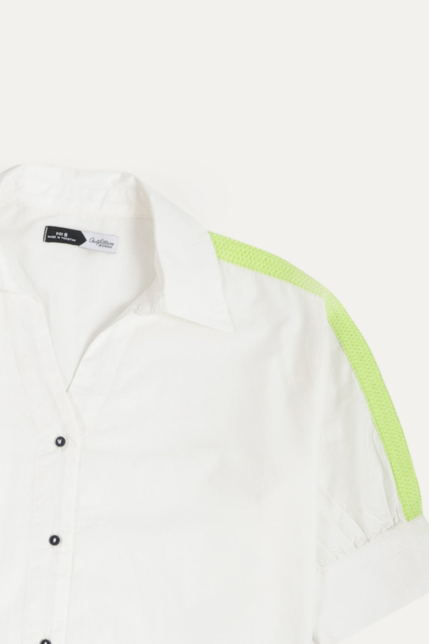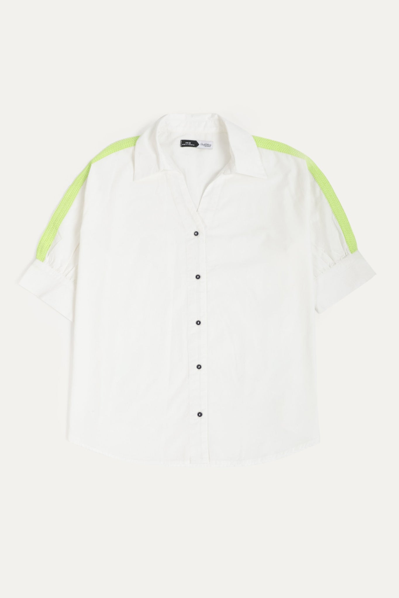 Shirt with ribbed sleeves, lace detail shoulder, buttoned collar front and plain back