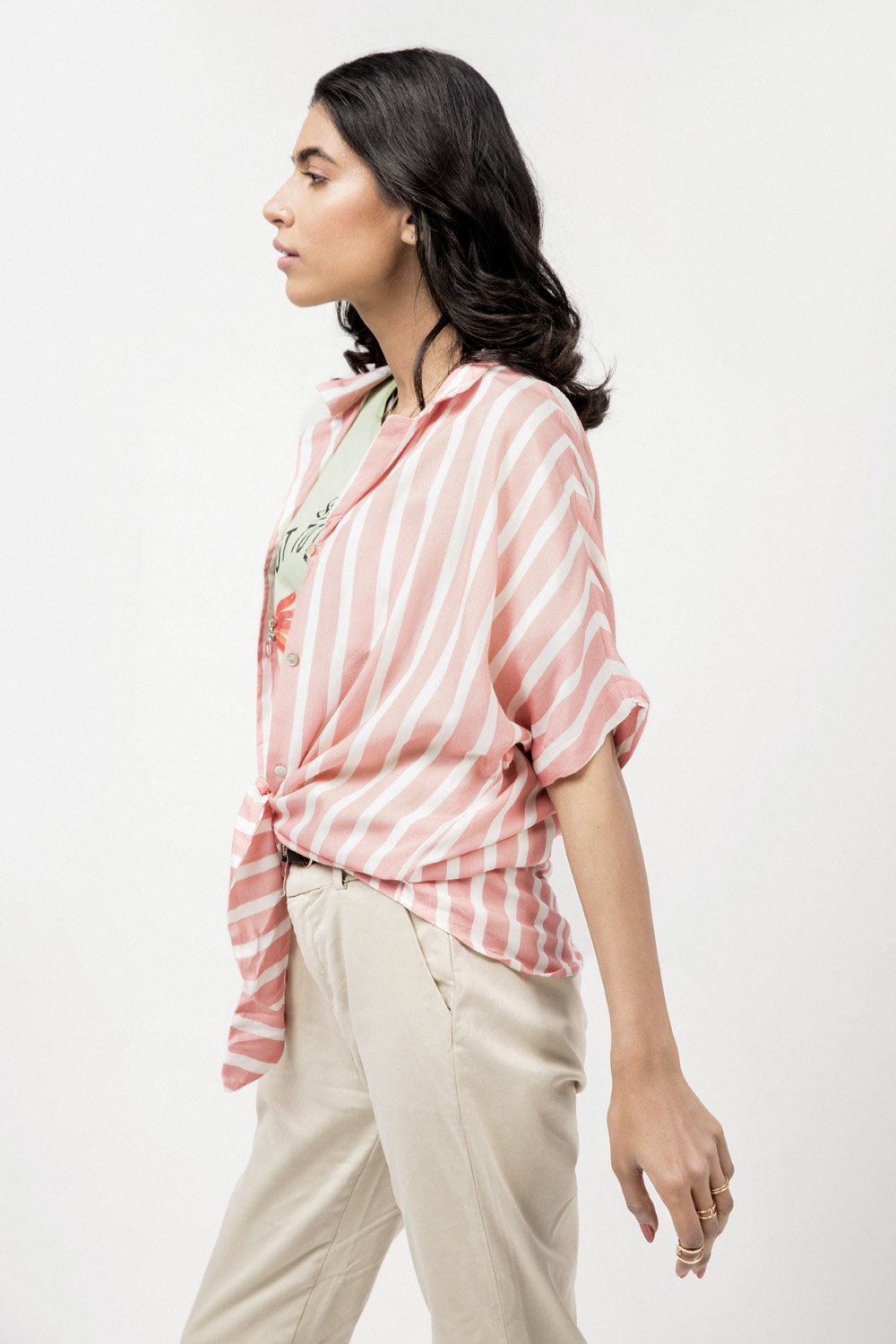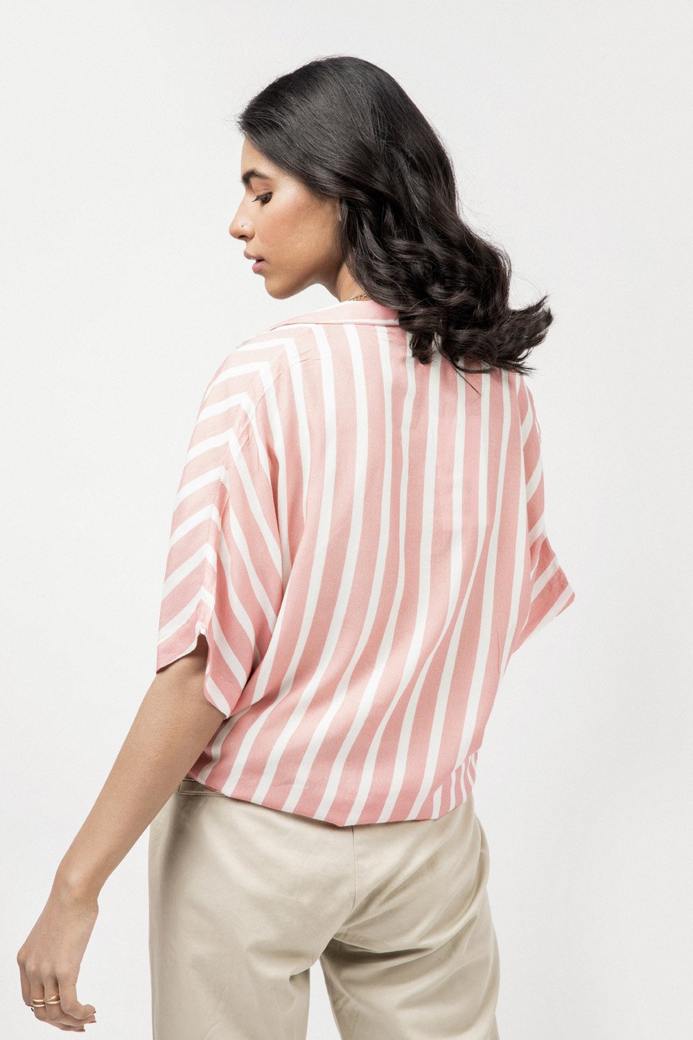 Button down shirt with a drop shoulder, striped design and self fastening bow front