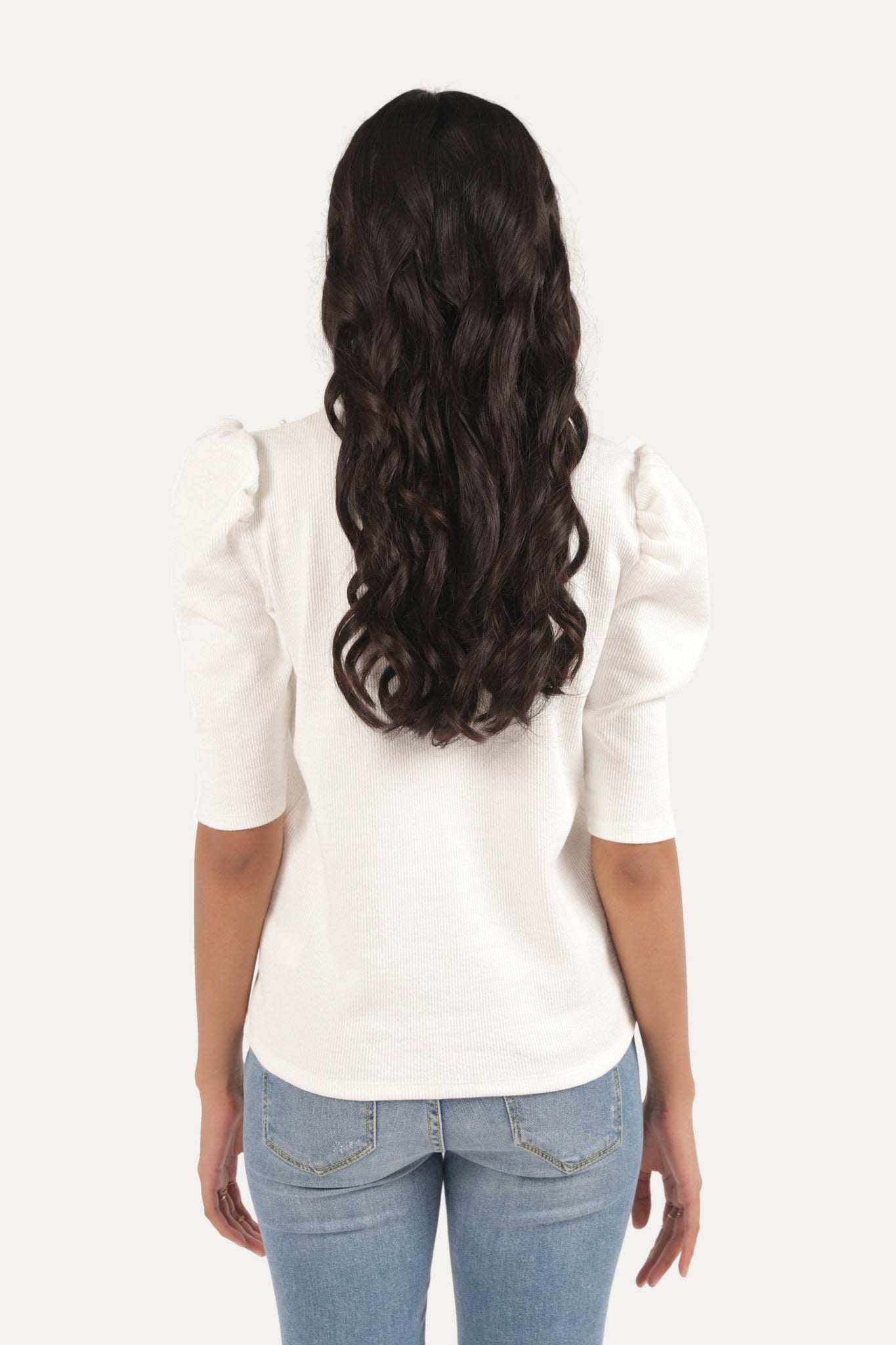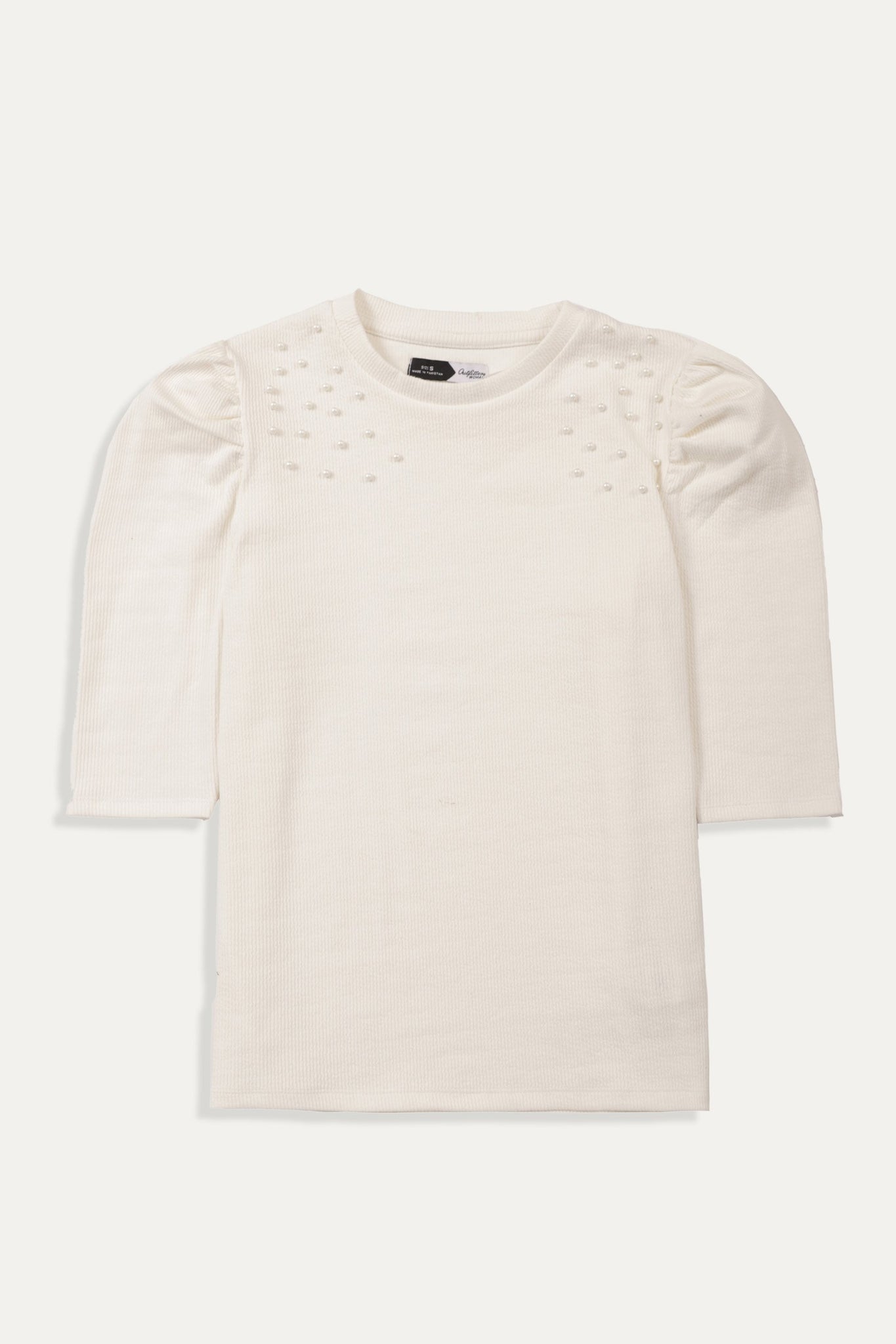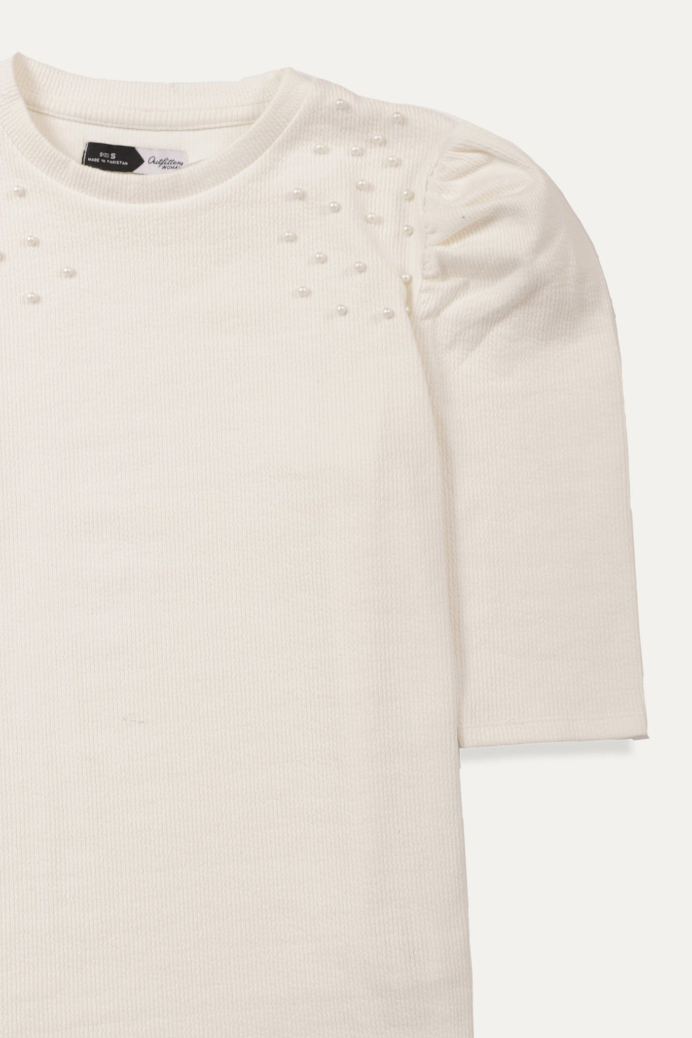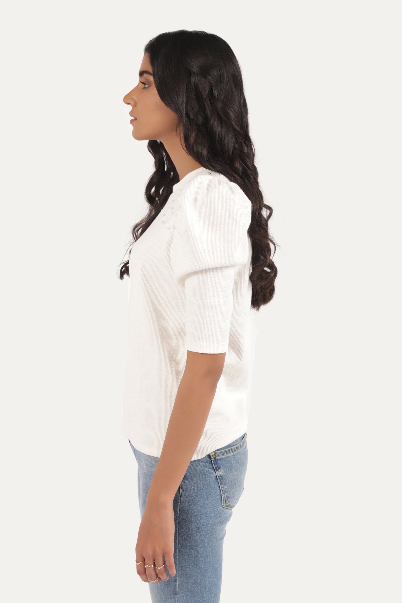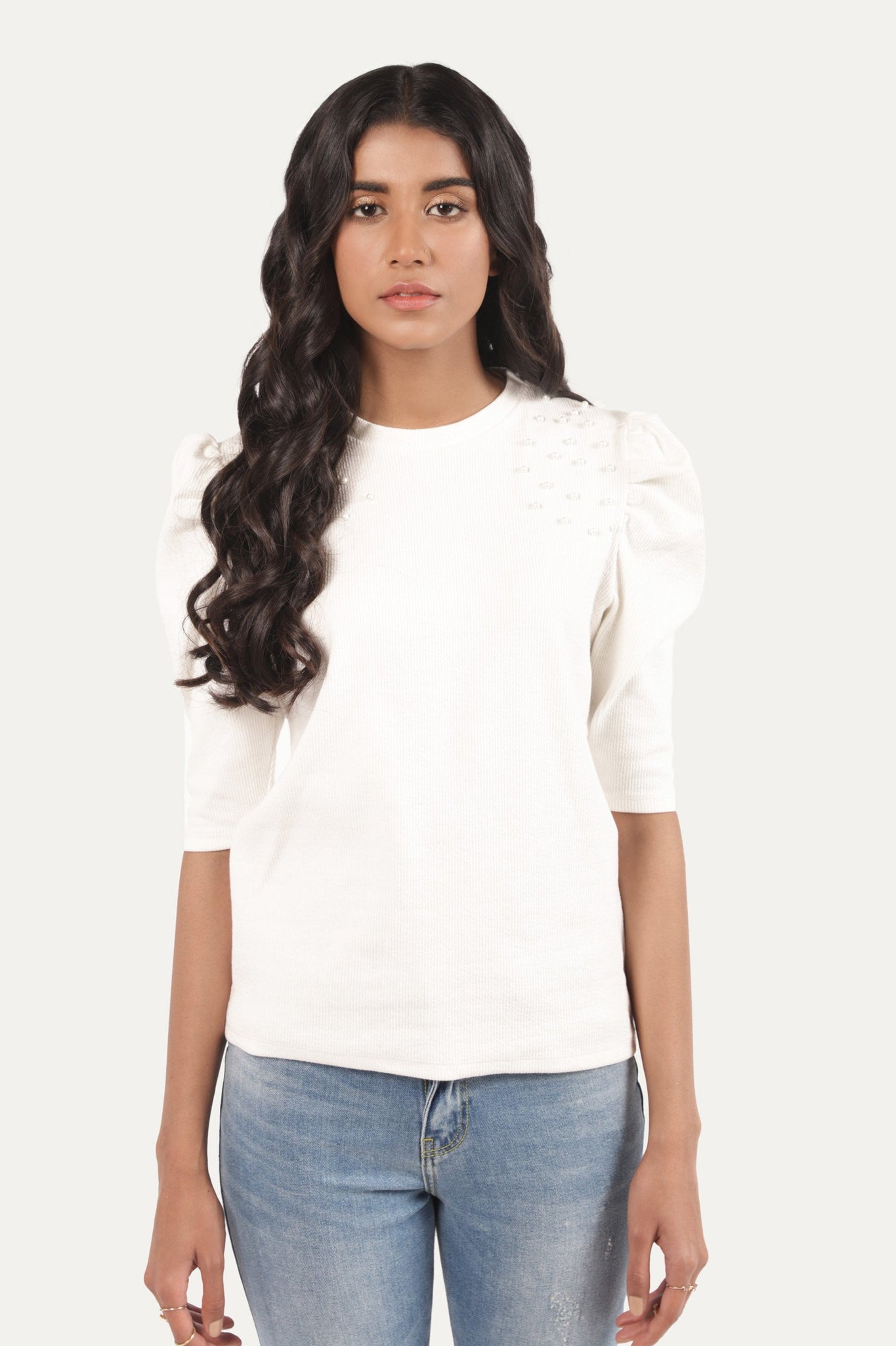 T-Shirt featuring puffed half sleeves, ribbed round neck, white pearls embellished front and plain back