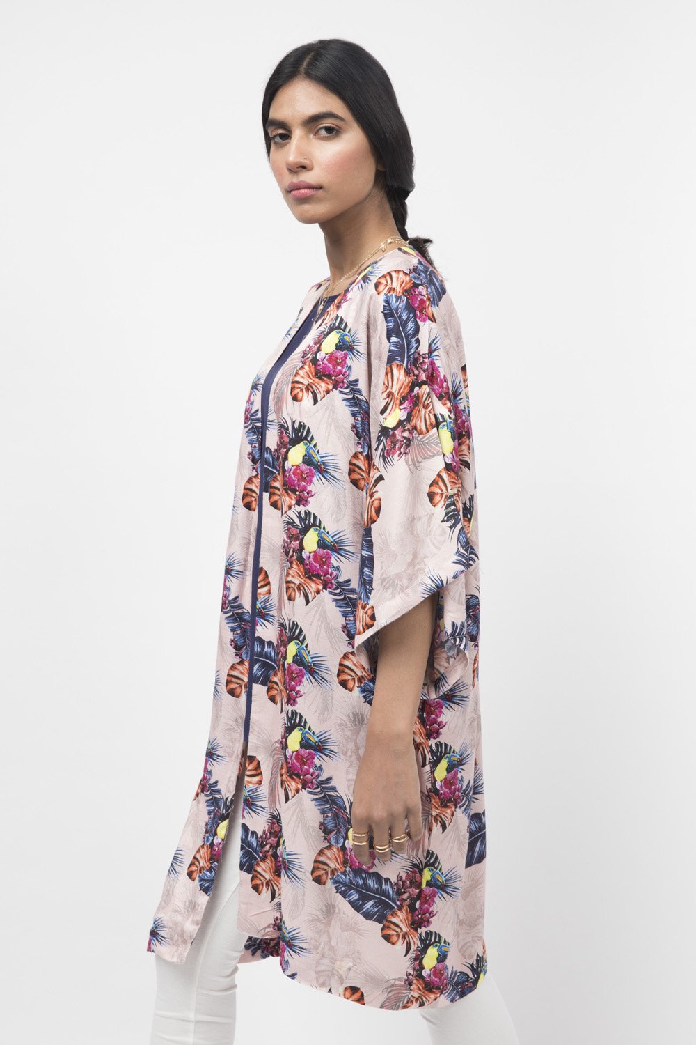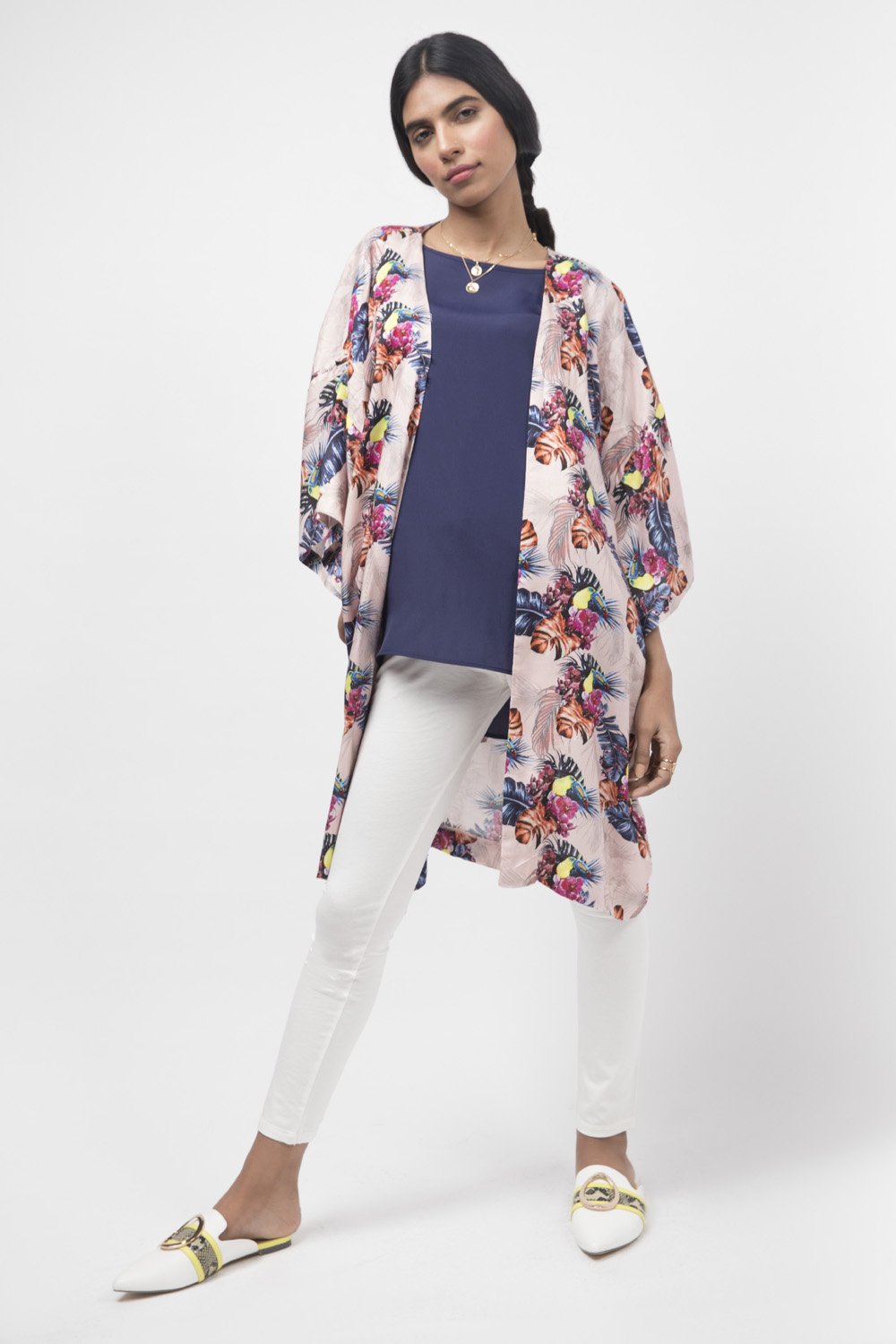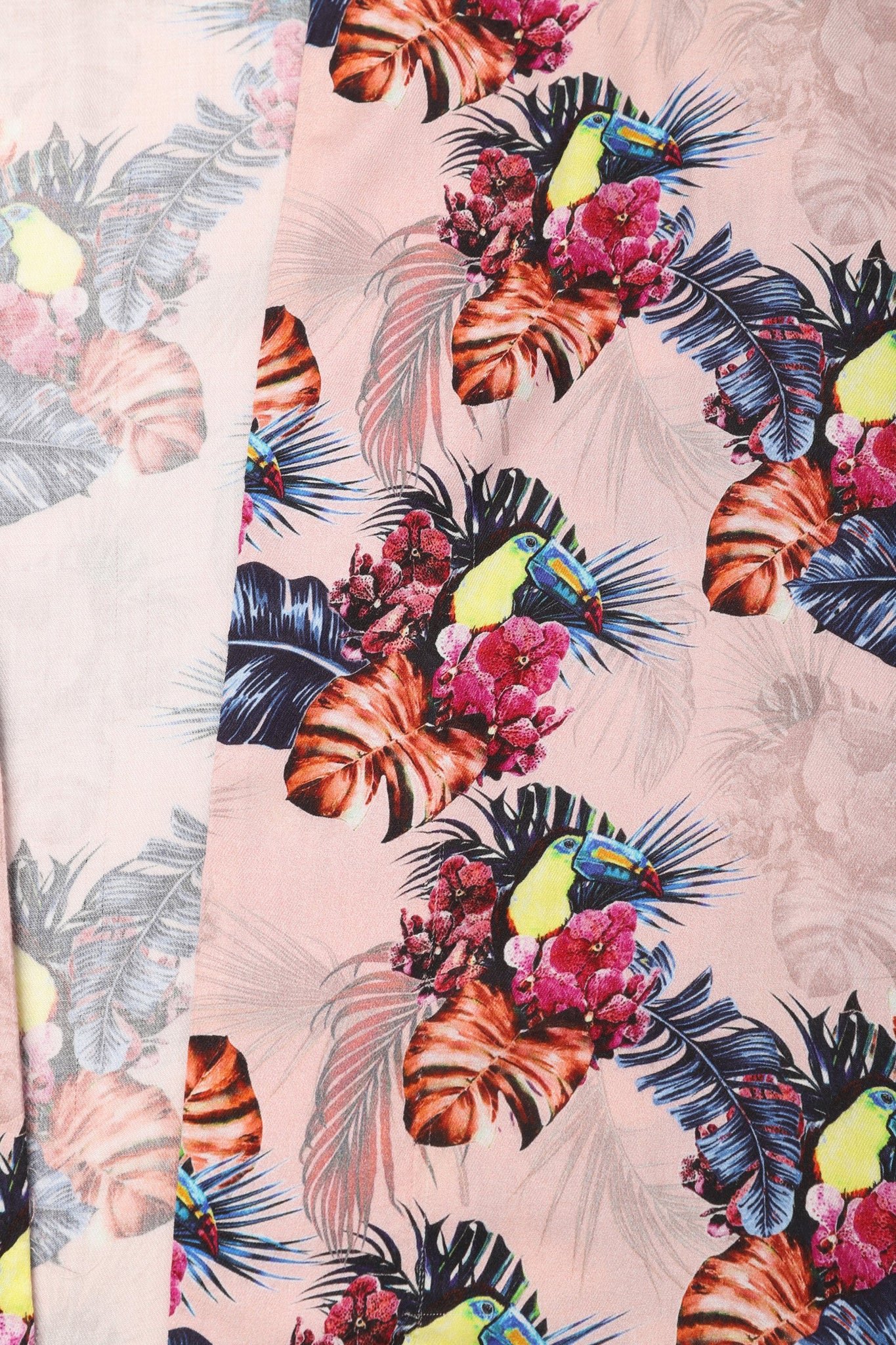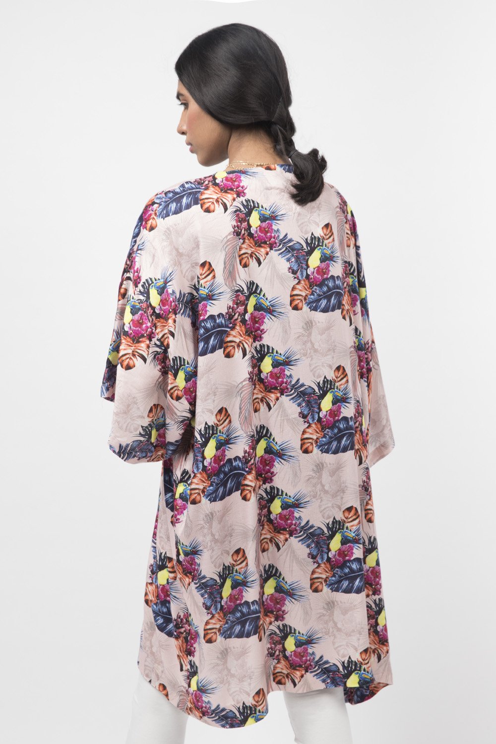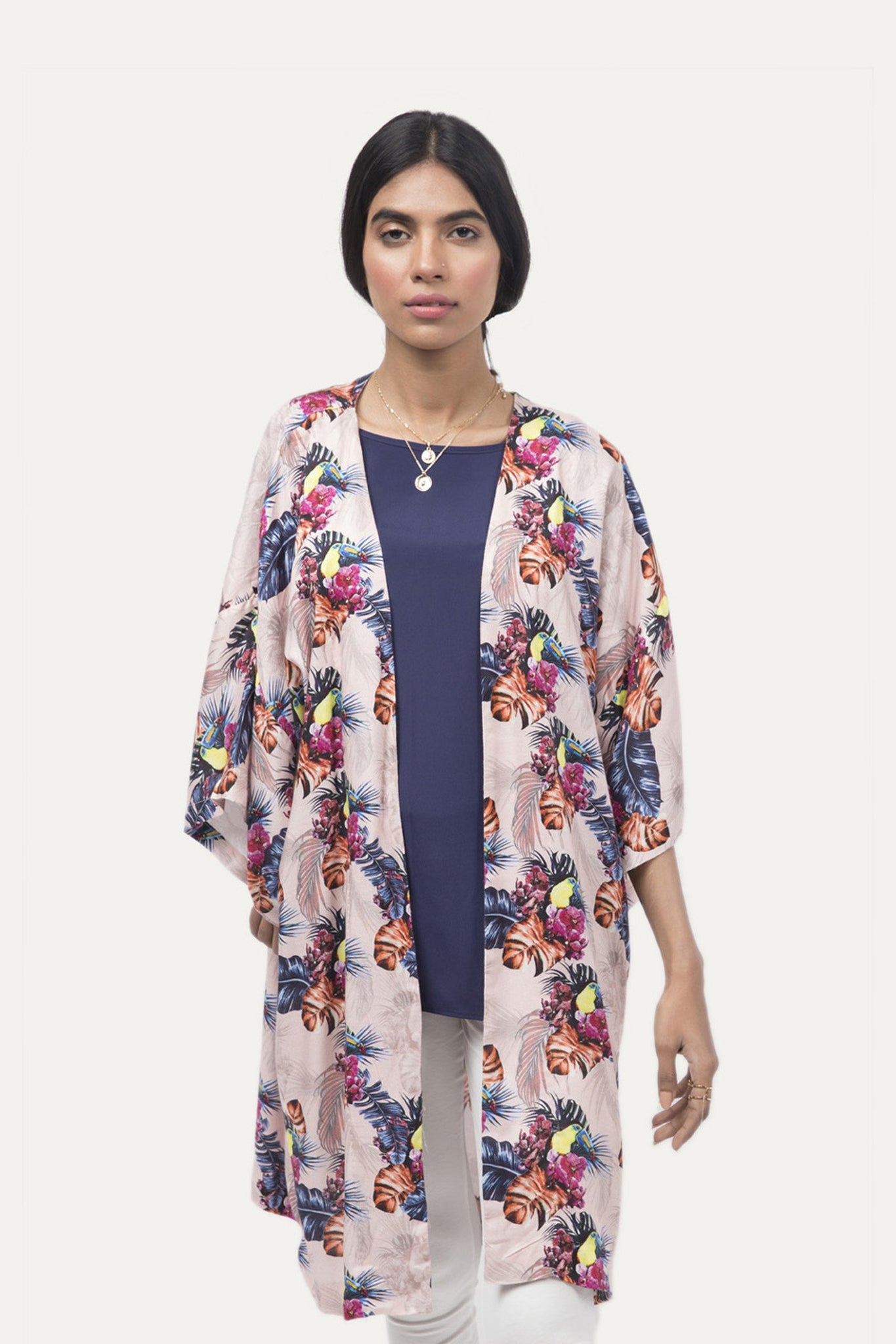 Printed shrug with three-quarter sleeves and running camouflage and tropical print