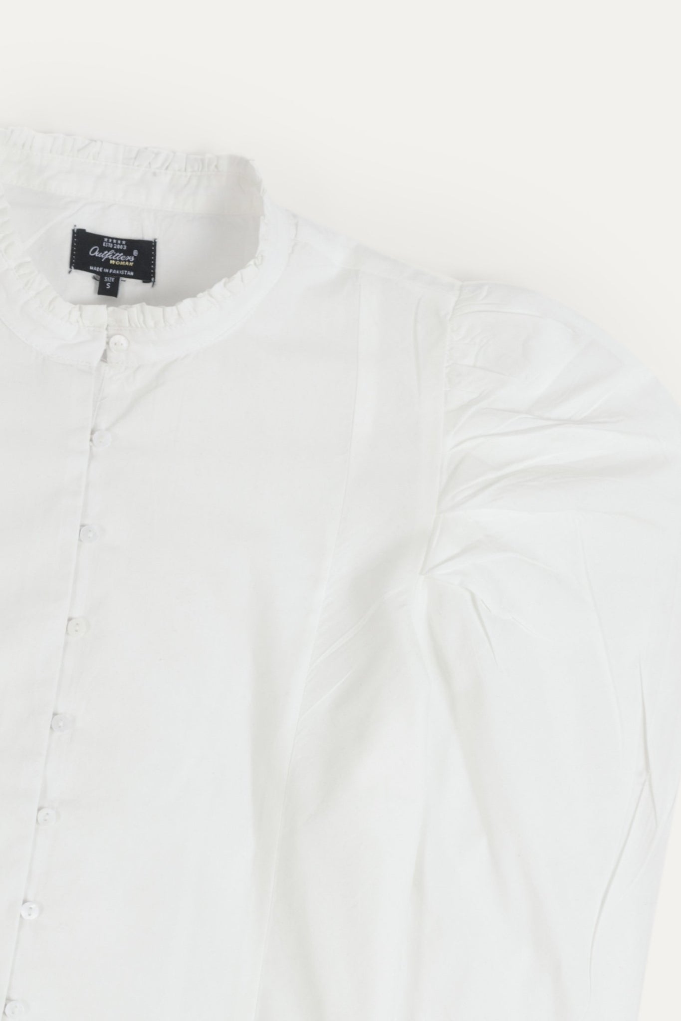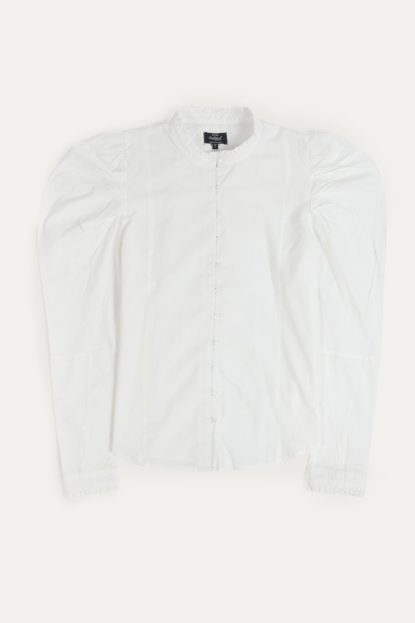 Shirt with buttoned collar front, full ruffled sleeves, design round neck, button-up front and plain back