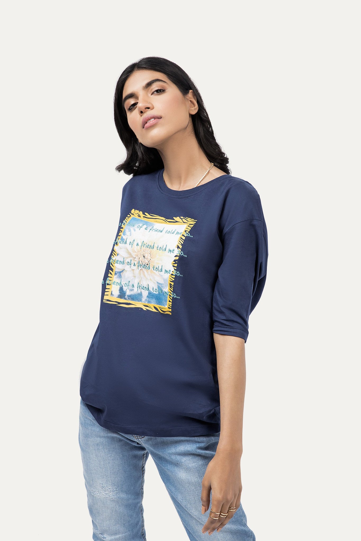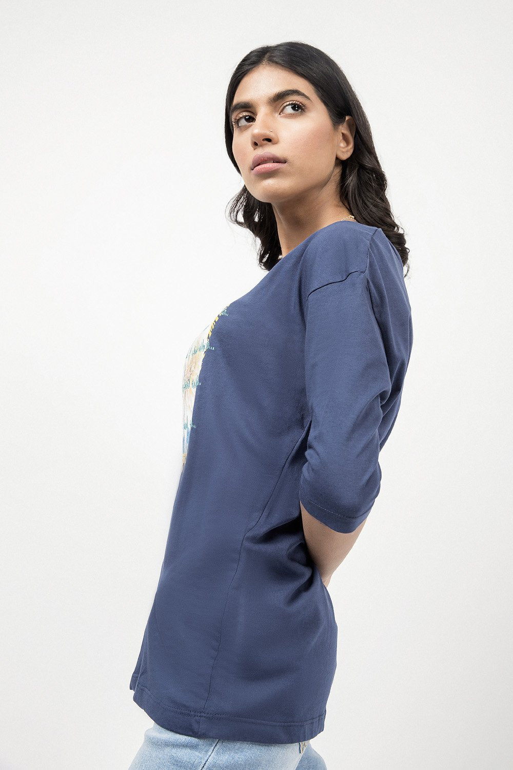 Graphic t-shirt with a round neck, half sleeves and printed graphic design on front