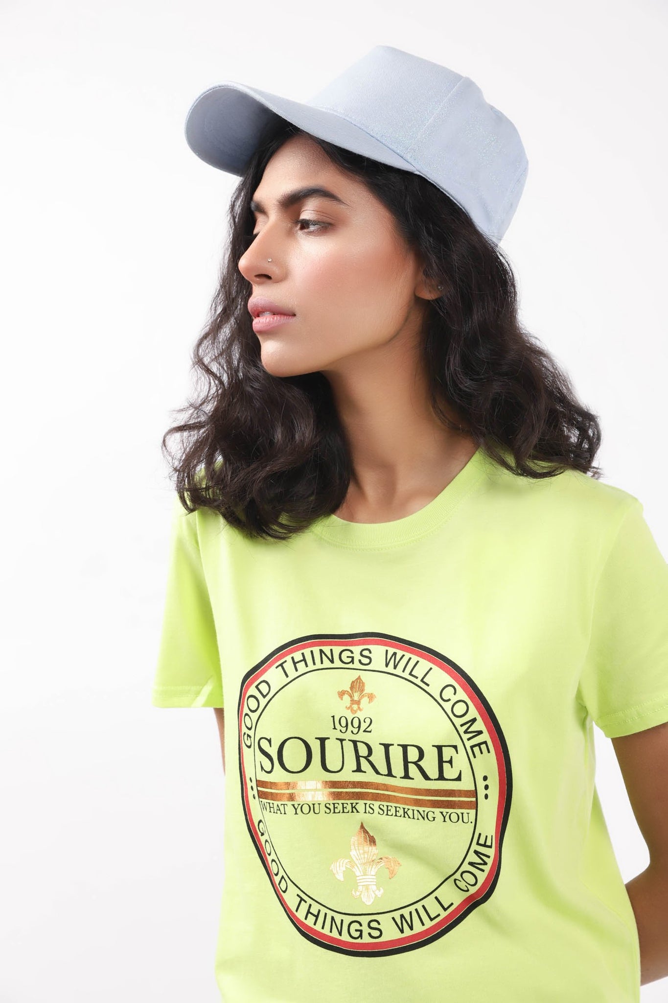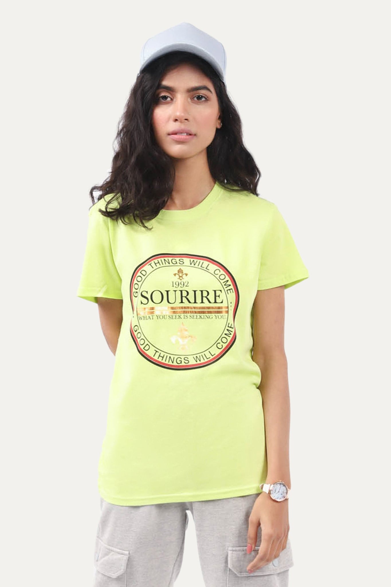 T-shirt featuring graphic print on front, round neck and half sleeves