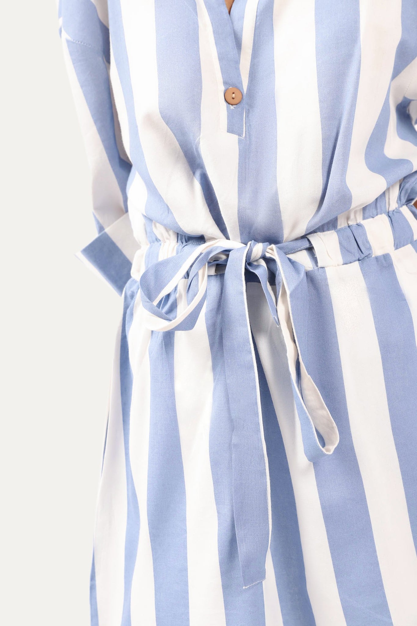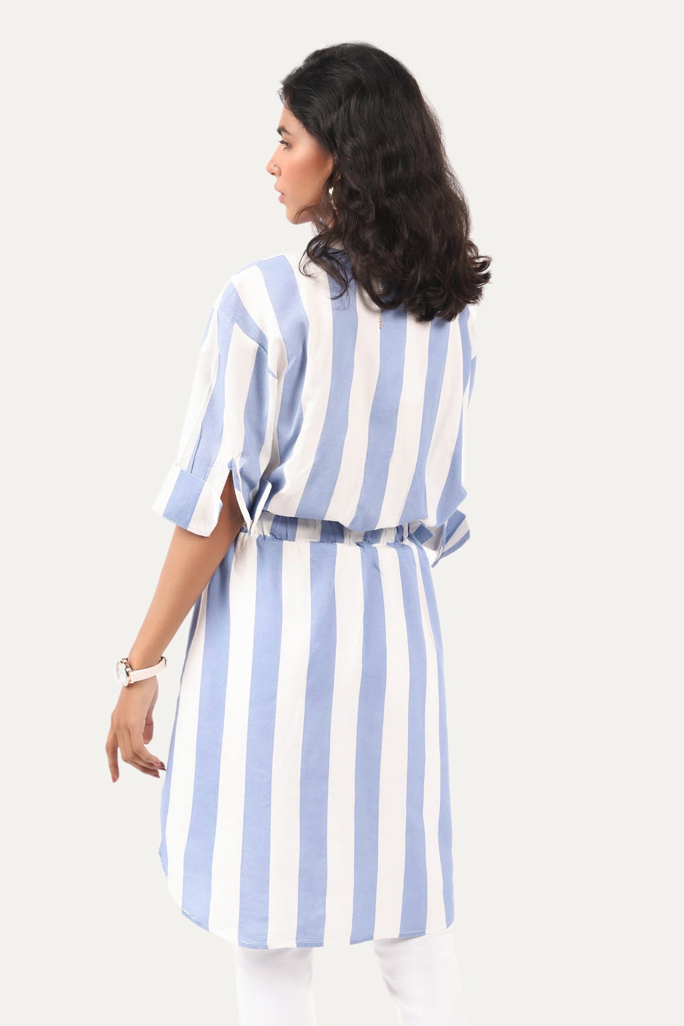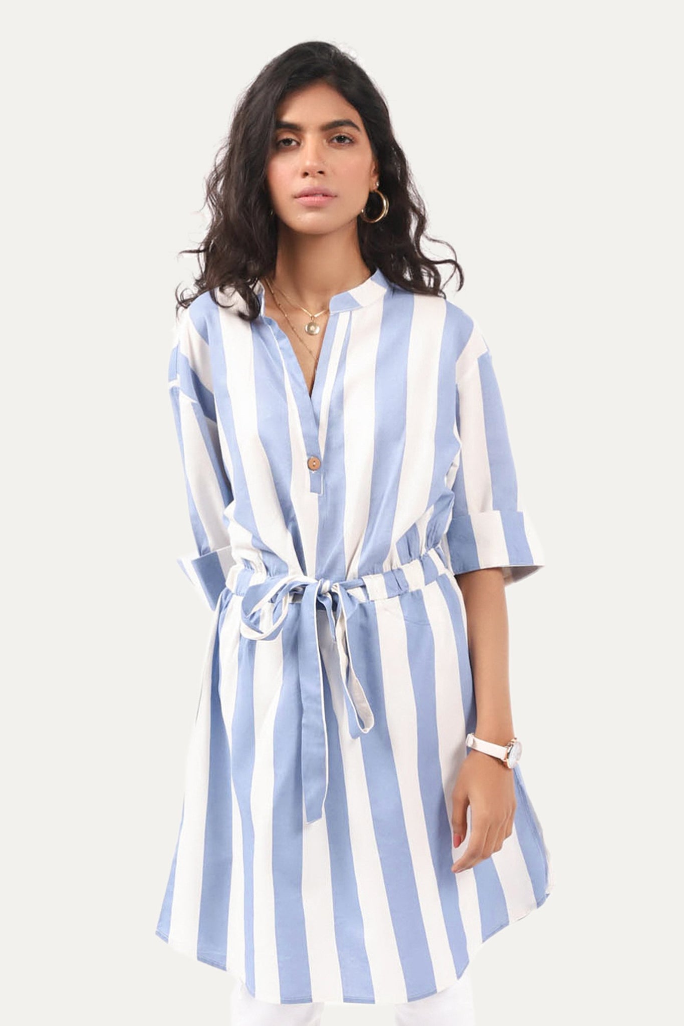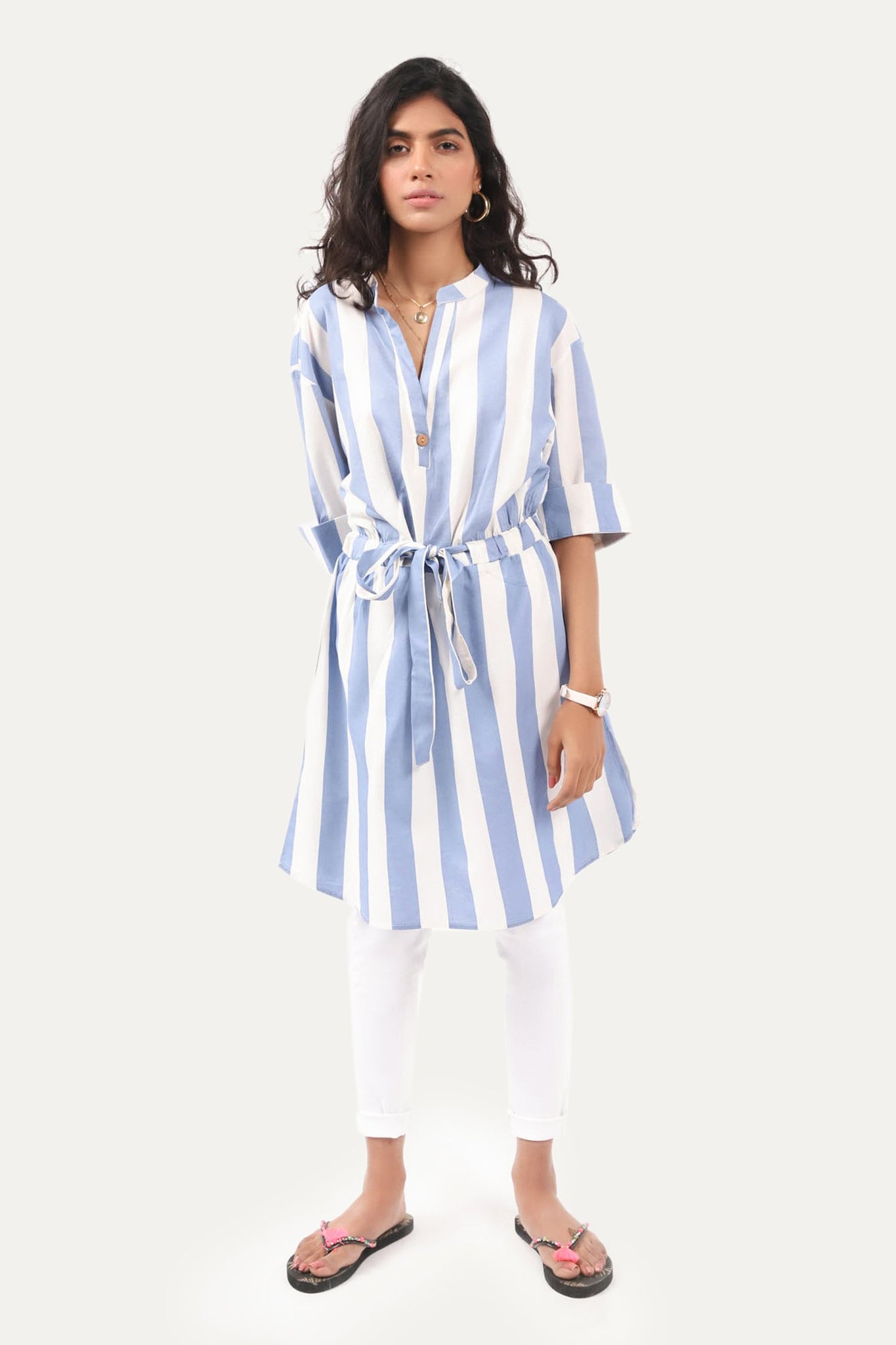 Long shirt featuring striped design, with button detail and self fastening belt around waist