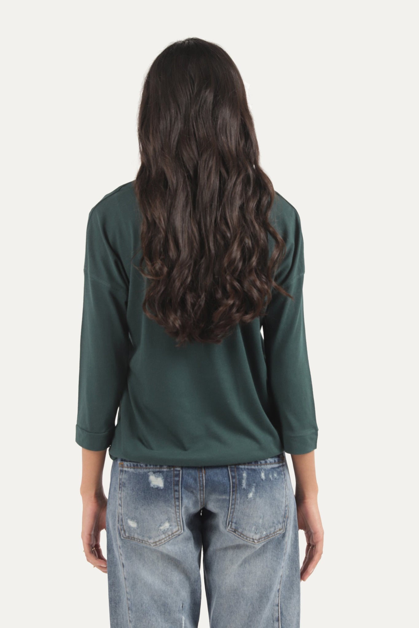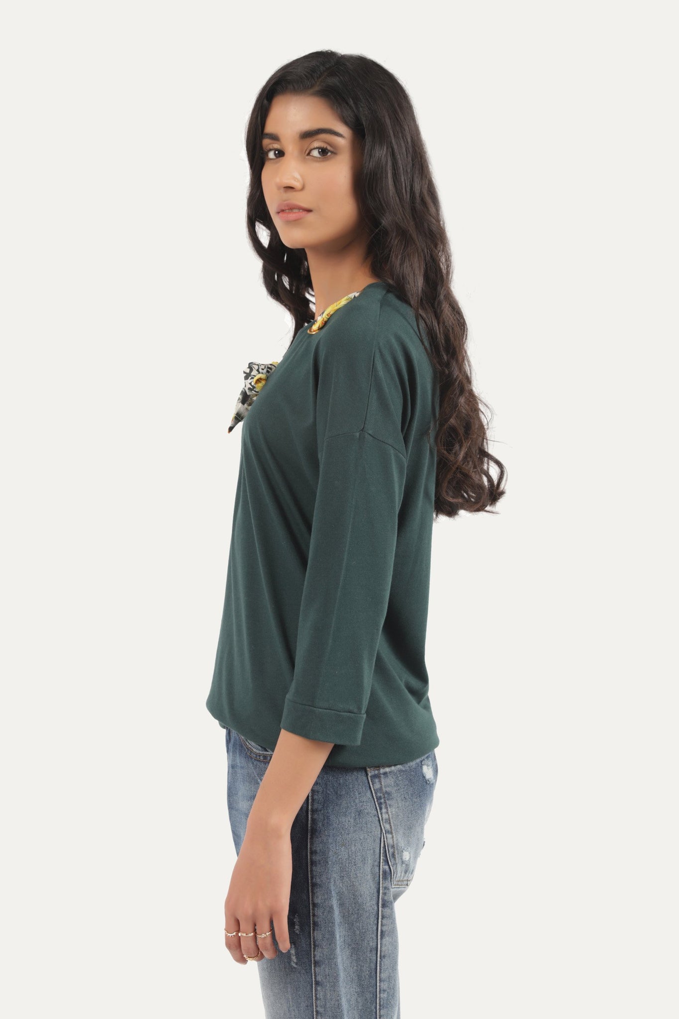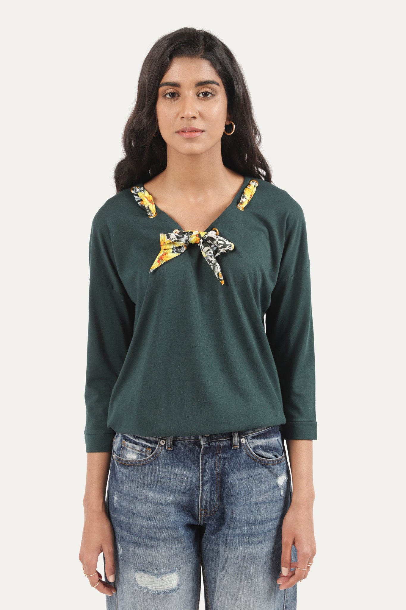 T-Shirt with bow design neck, full sleeves, plain front and backSize & Fits