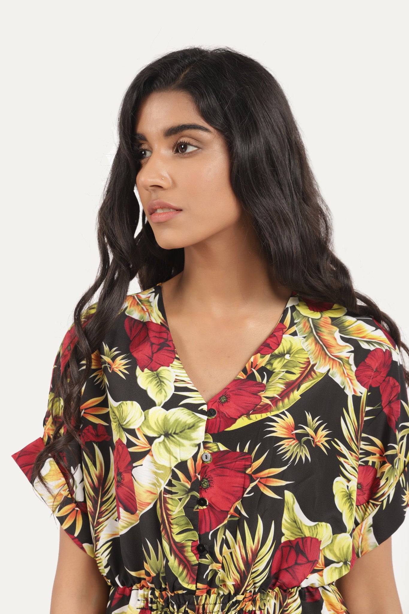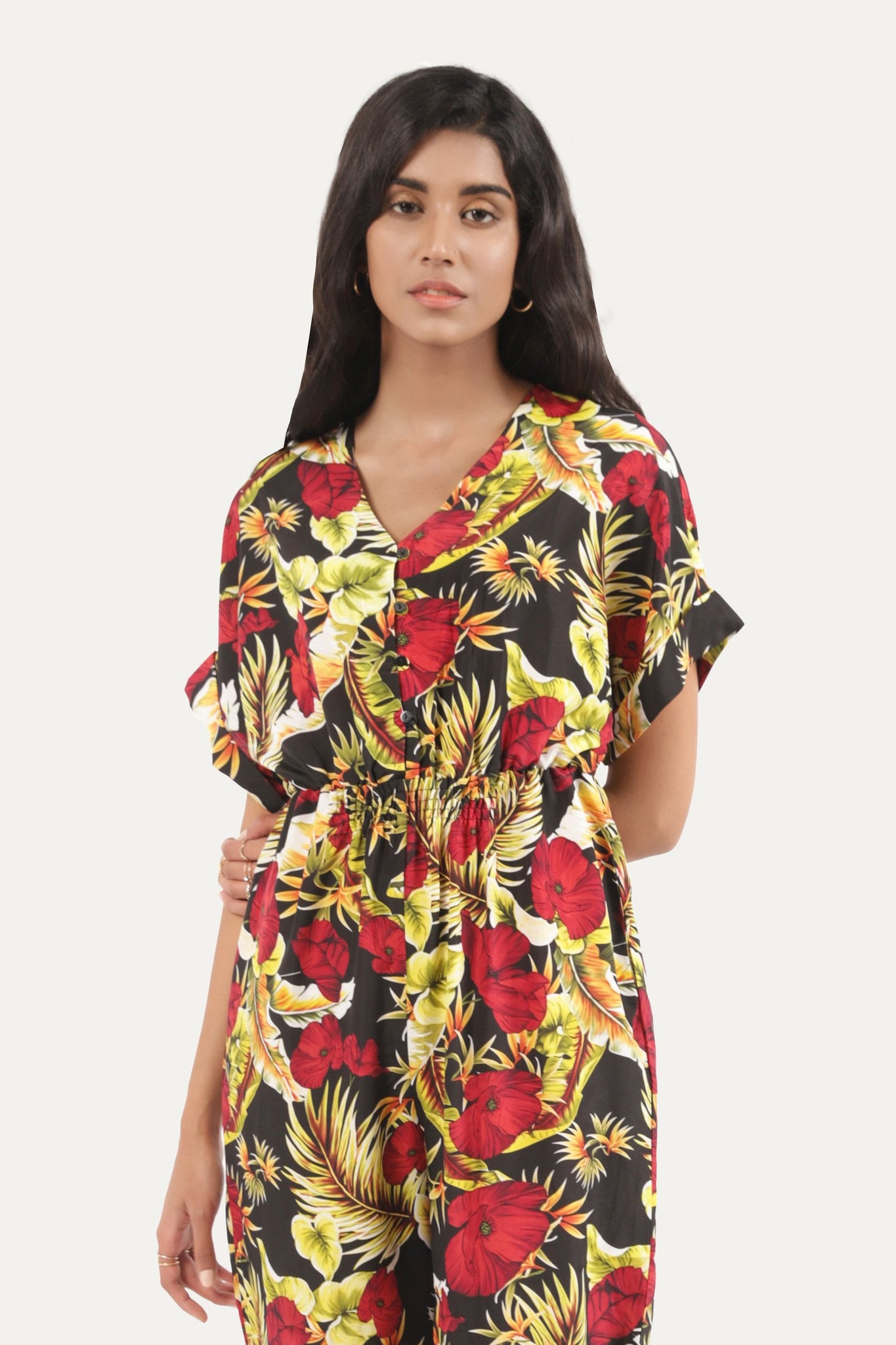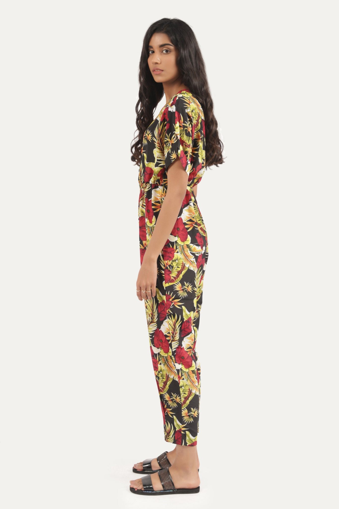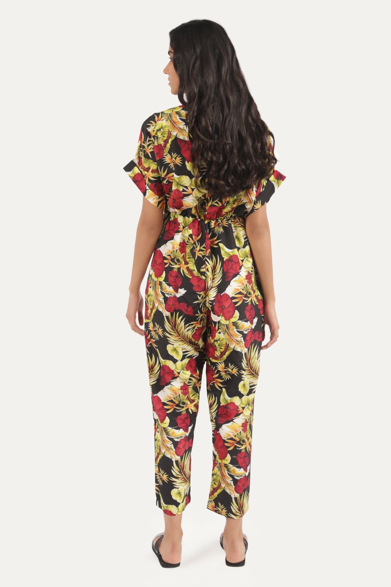 Jumpsuit with half sleeves, floral print front and backSize & Fits